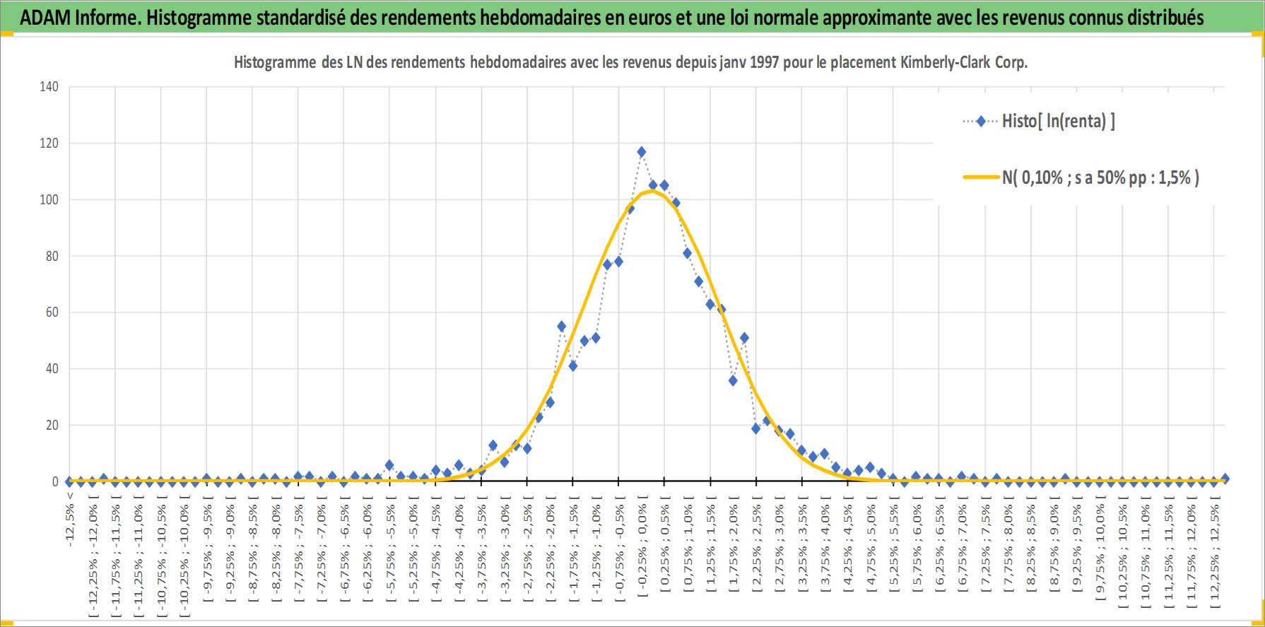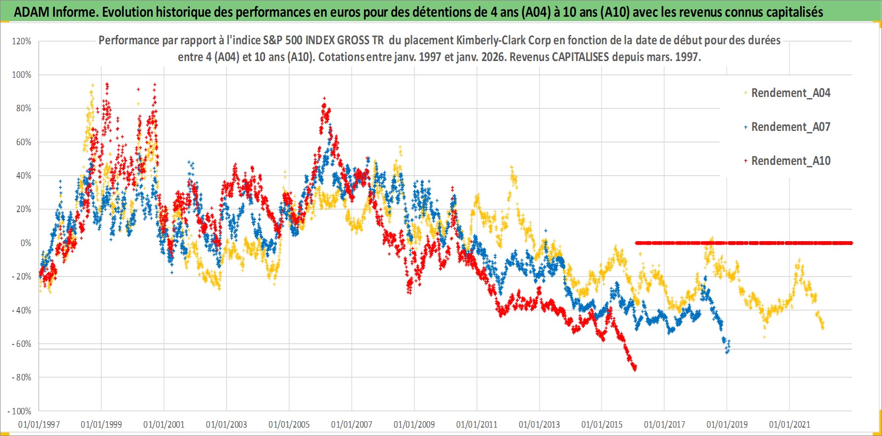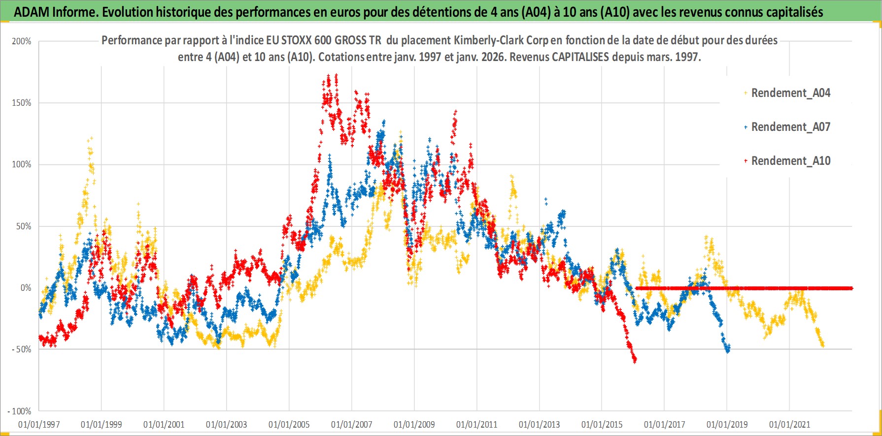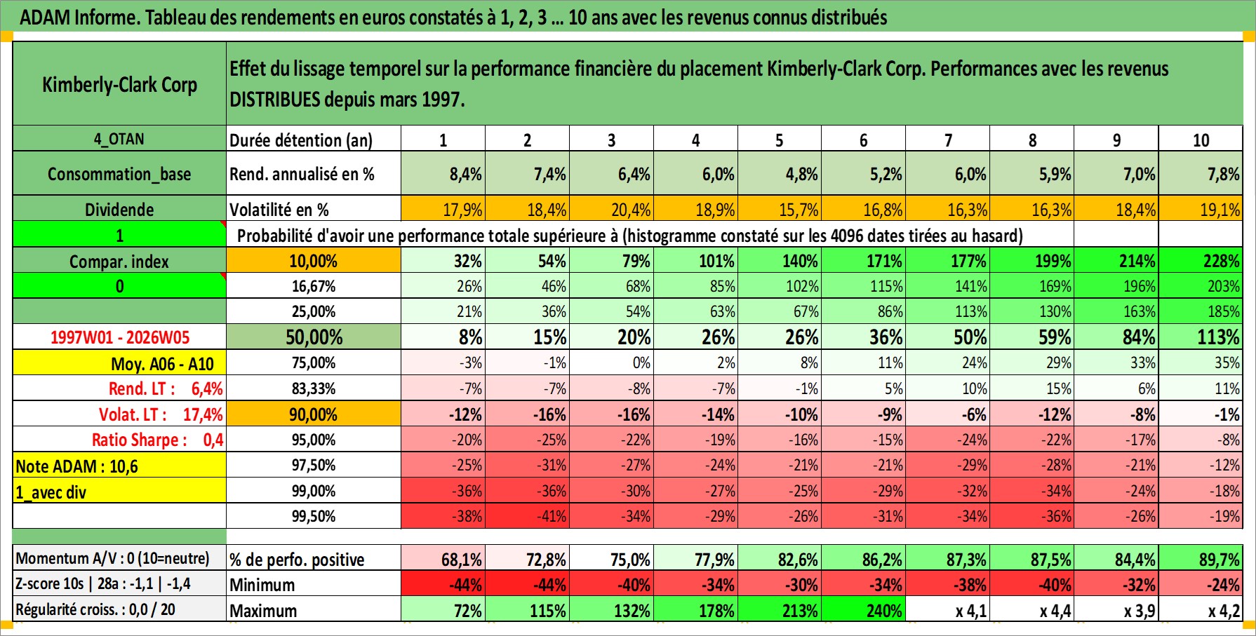 Site dédié aux investisseursPage dédiée sur site financeAnalyse des valorisations hebdomadaires de l'action Kimberly-Clark Corp. Cet actif est cote en USD. Les valorisations sont en contrevaleur EURO et couvrent les semaines 1997W01 a 2026W05. Les revenus de cet actif financier sont pris en compte depuis la semaine 1997W10. La note globale ESG de cet actif est estimee a 9.0 (apres rebasage entre 0 et 20).