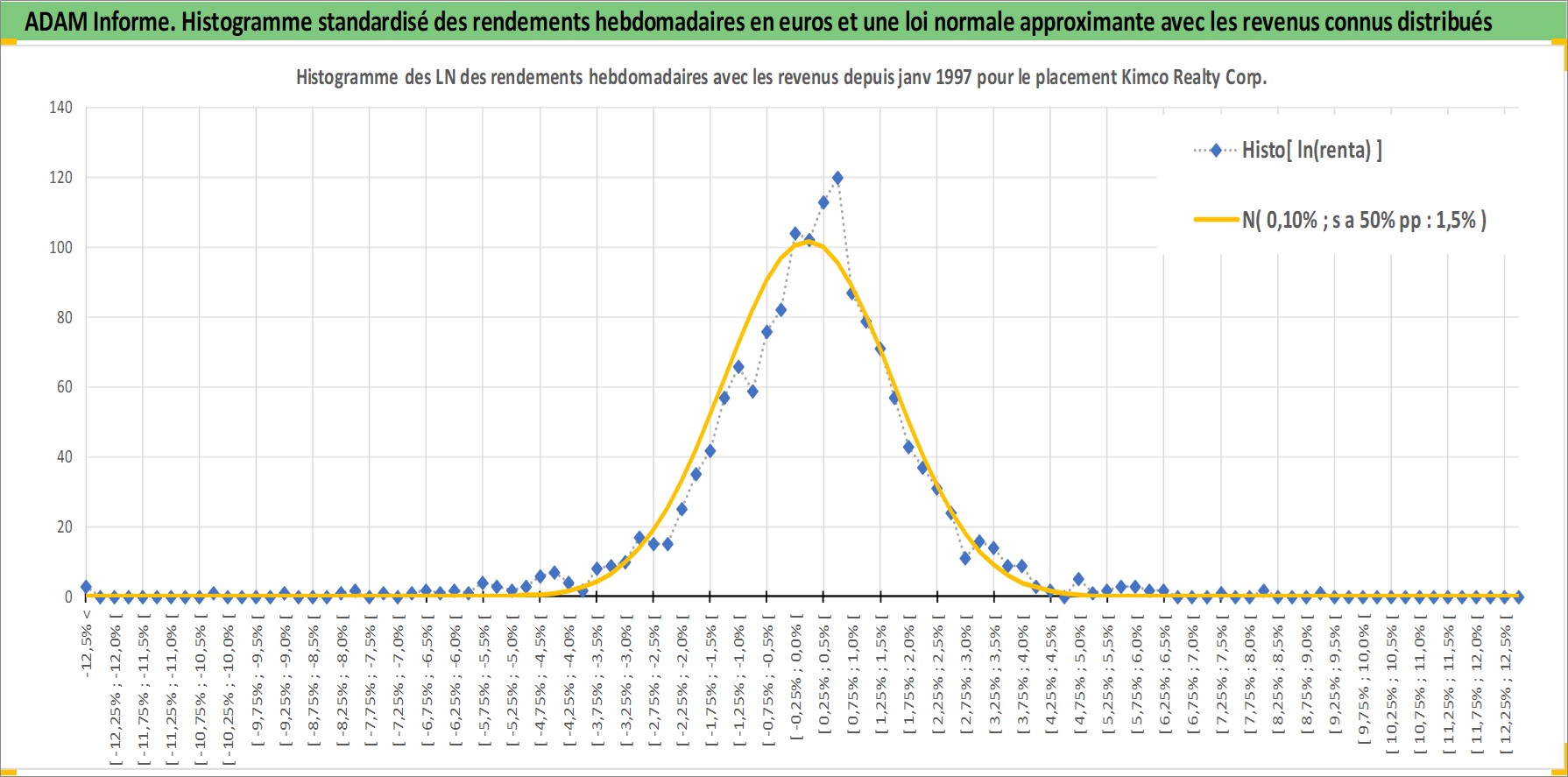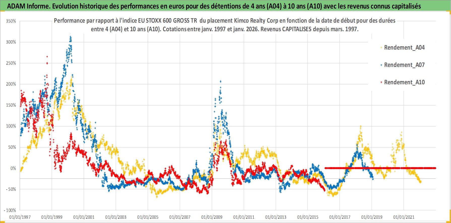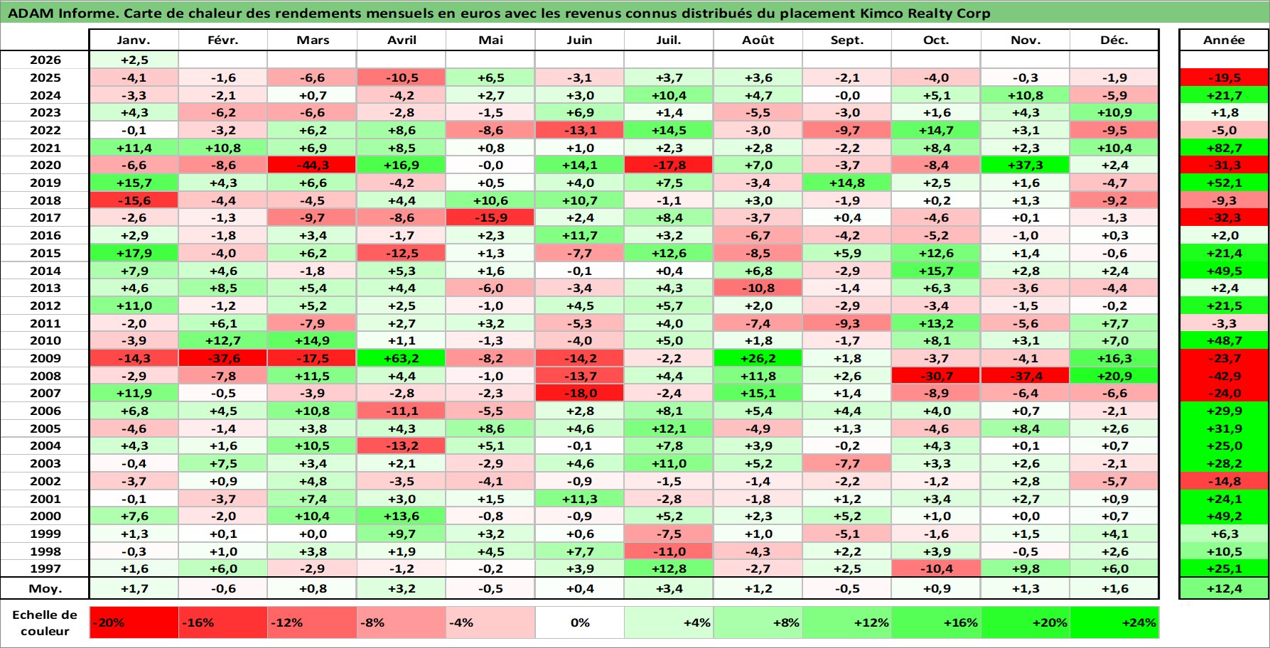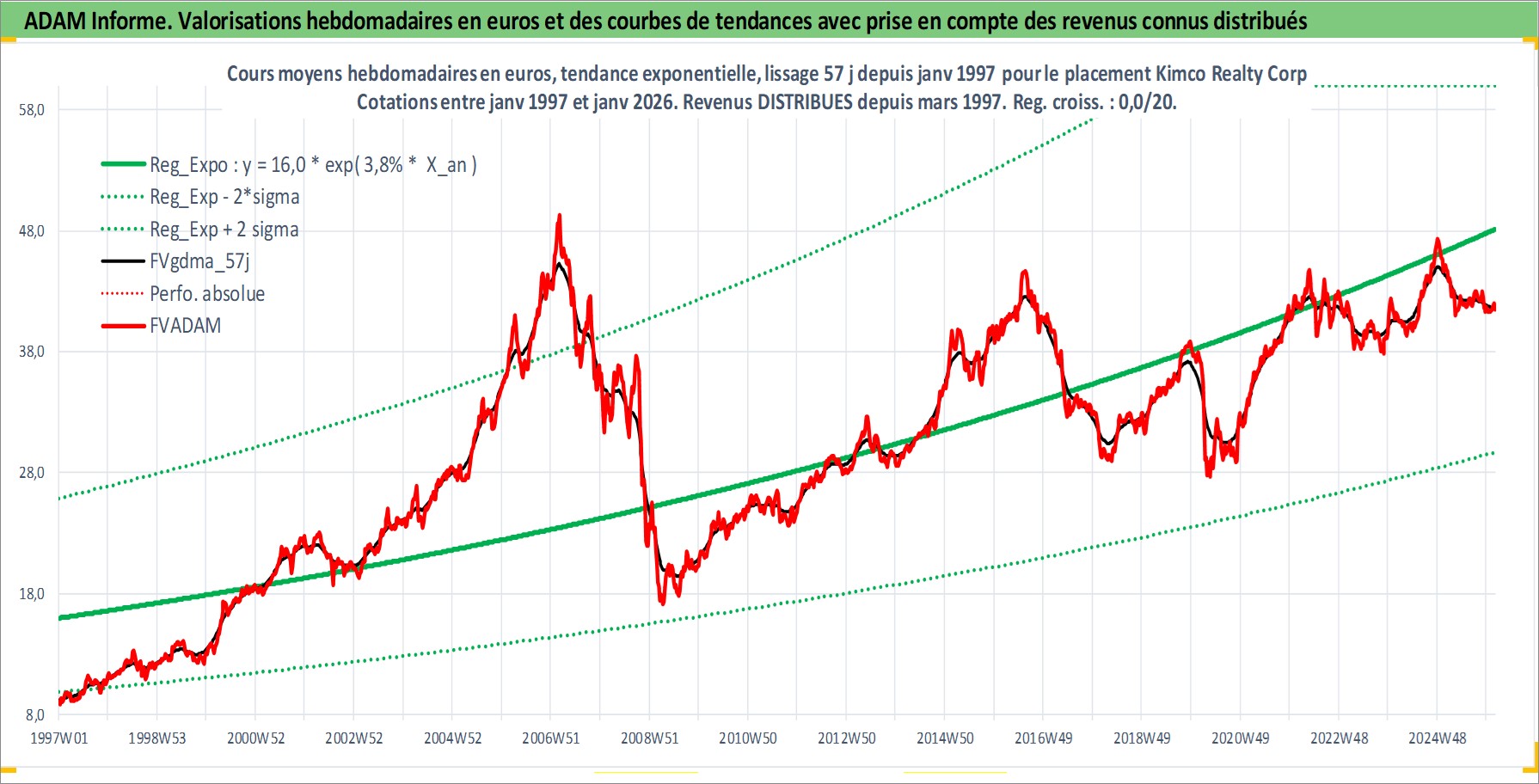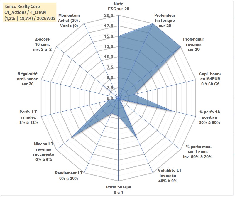 Site dédié aux investisseursPage dédiée sur site financeAnalyse des valorisations hebdomadaires de l'action Kimco Realty Corp. Cet actif est cote en USD. Les valorisations sont en contrevaleur EURO et couvrent les semaines 1997W01 a 2026W05. Les revenus de cet actif financier sont pris en compte depuis la semaine 1997W13. La note globale ESG de cet actif est estimee a 15.0 (apres rebasage entre 0 et 20).
