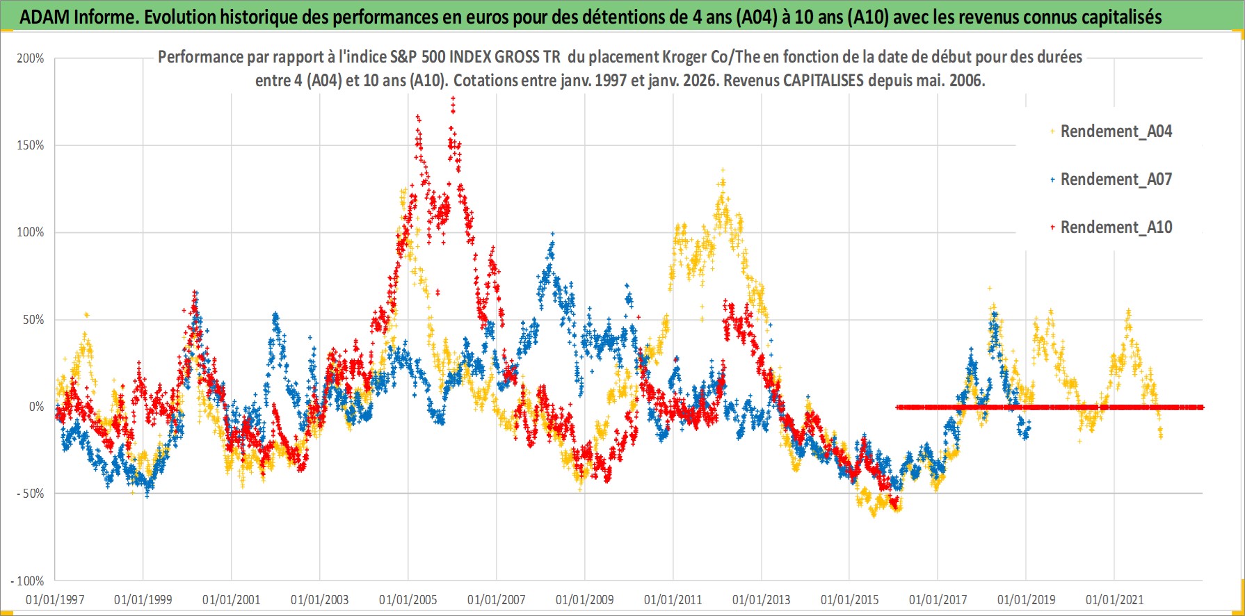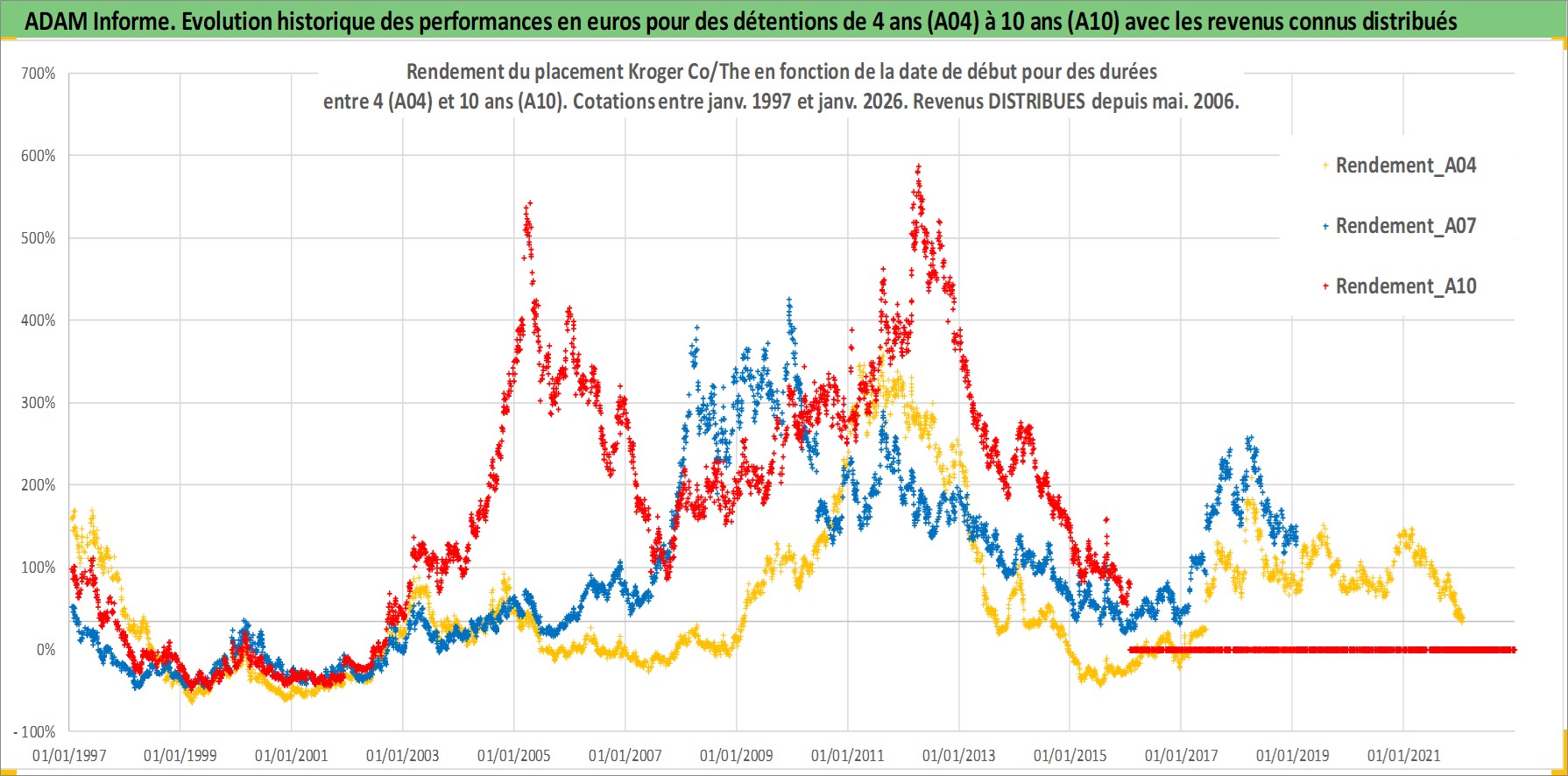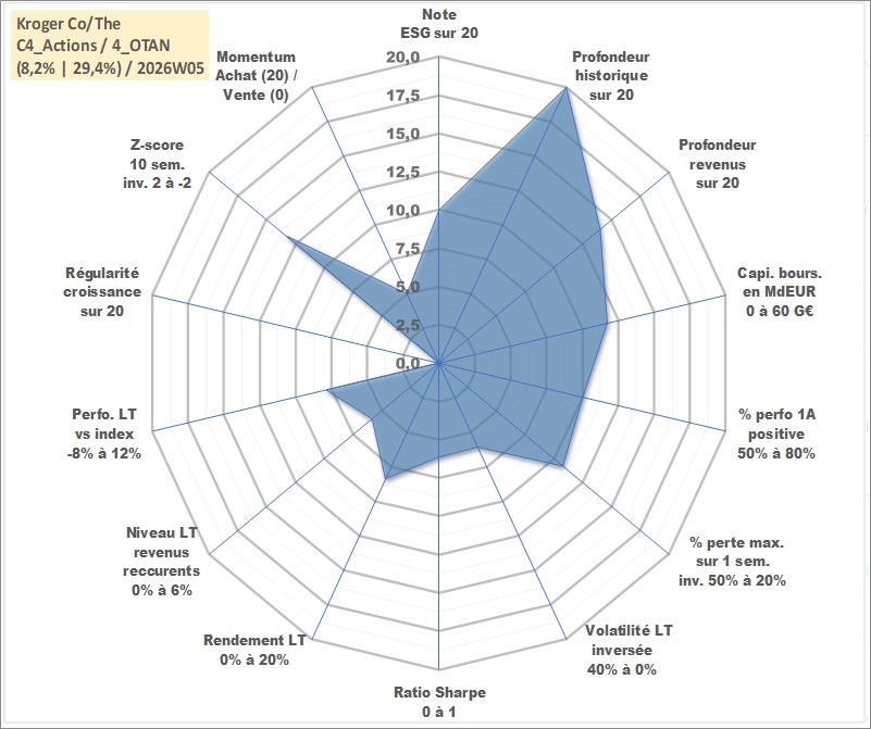 Site dédié aux investisseursPage dédiée sur site financeAnalyse des valorisations hebdomadaires de l'action Kroger Co/The. Cet actif est cote en USD. Les valorisations sont en contrevaleur EURO et couvrent les semaines 1997W01 a 2026W05. Les revenus de cet actif financier sont pris en compte depuis la semaine 2006W19. La note globale ESG de cet actif est estimee a 10.0 (apres rebasage entre 0 et 20).