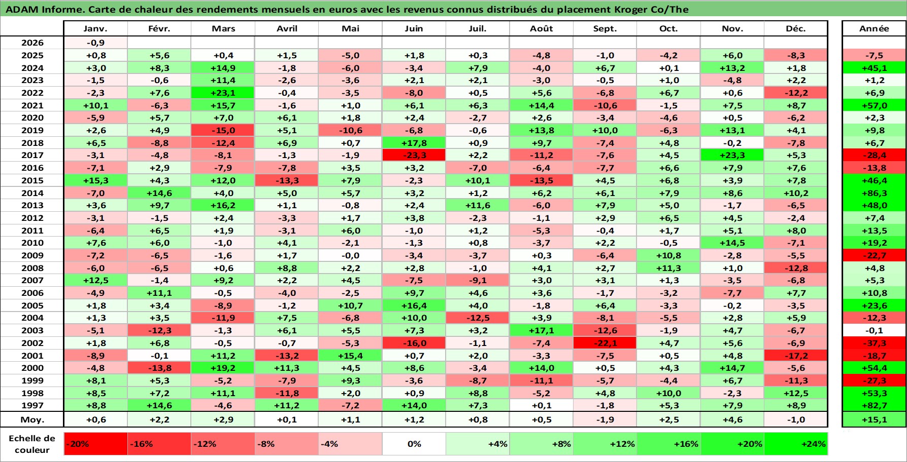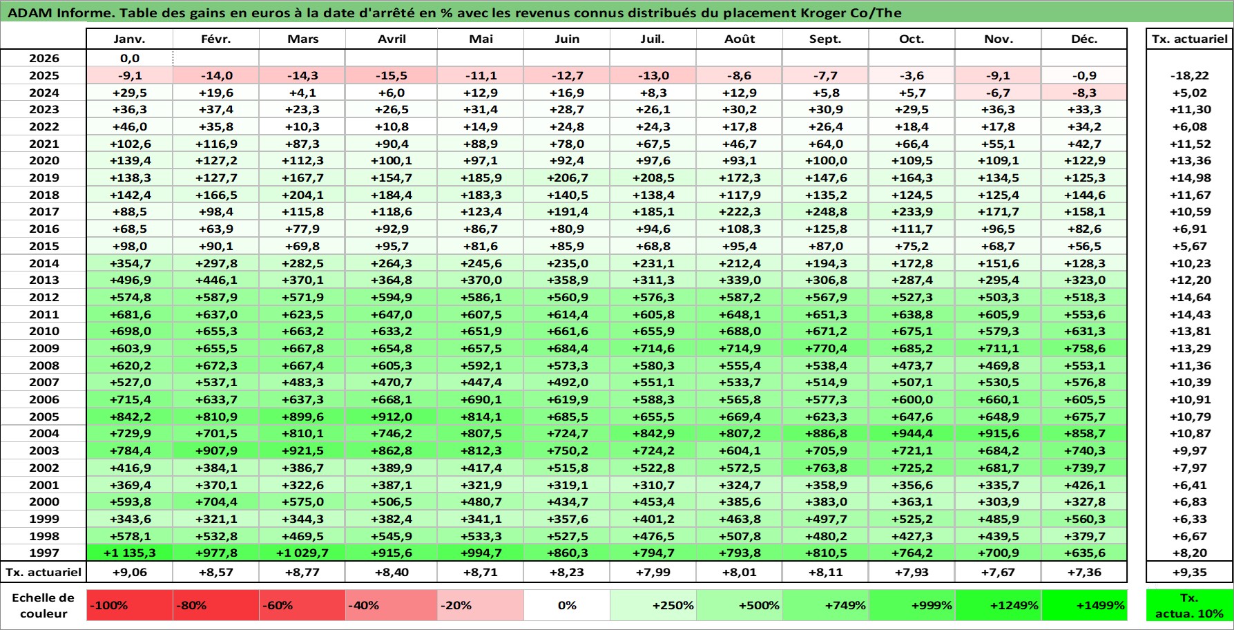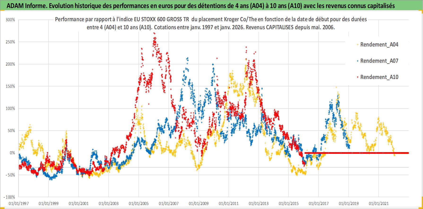 Site dédié aux investisseursPage dédiée sur site financeAnalyse des valorisations hebdomadaires de l'action Kroger Co/The. Cet actif est cote en USD. Les valorisations sont en contrevaleur EURO et couvrent les semaines 1997W01 a 2026W05. Les revenus de cet actif financier sont pris en compte depuis la semaine 2006W19. La note globale ESG de cet actif est estimee a 10.0 (apres rebasage entre 0 et 20).