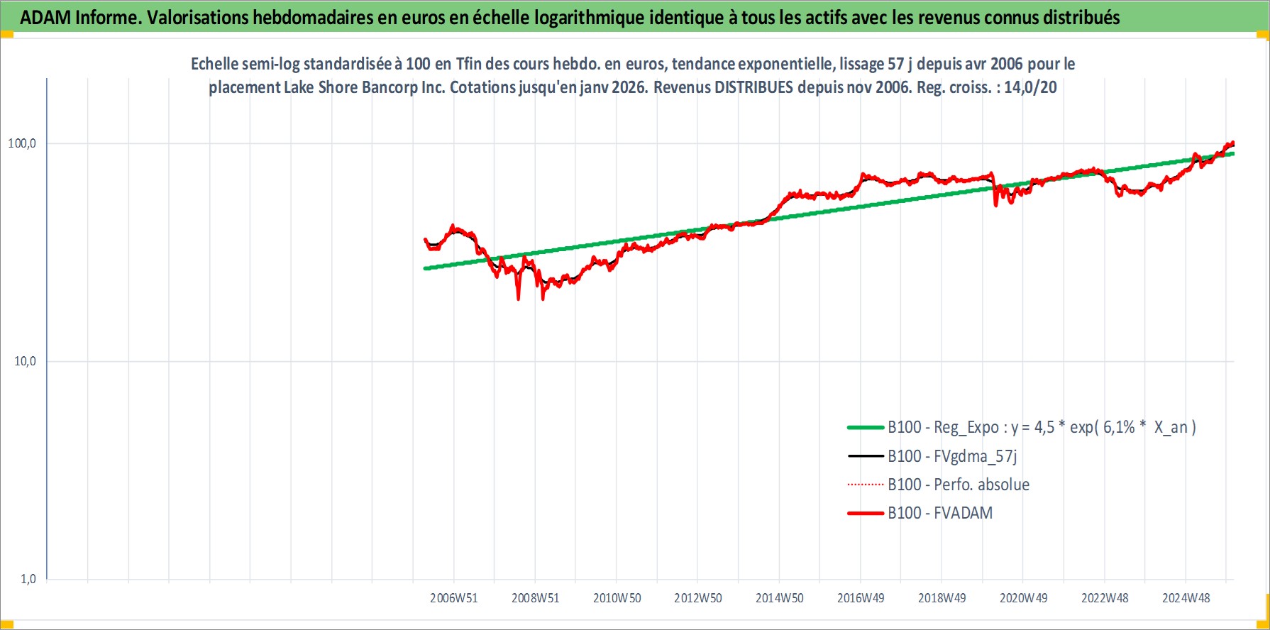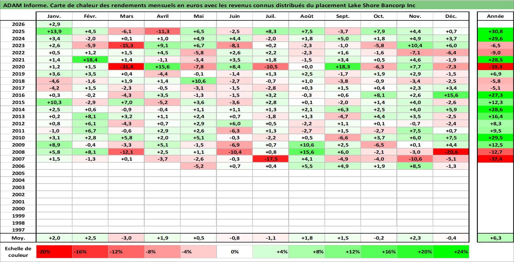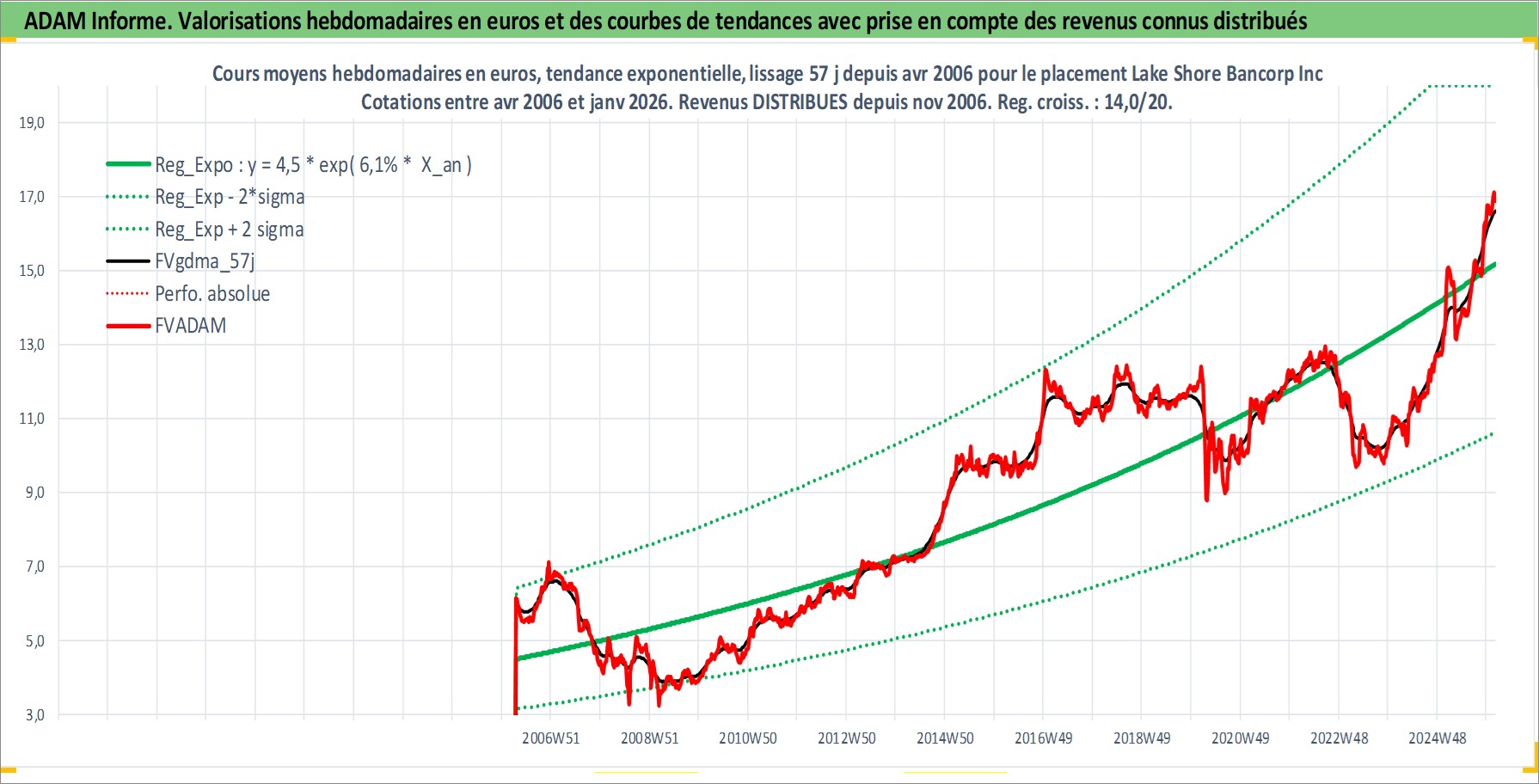 Site dédié aux investisseursPage dédiée sur site financeAnalyse des valorisations hebdomadaires de l'action Lake Shore Bancorp Inc. Cet actif est cote en USD. Les valorisations sont en contrevaleur EURO et couvrent les semaines 2006W14 a 2026W05. Les revenus de cet actif financier sont pris en compte depuis la semaine 2006W45. La note ESG de cet actif n'est pas connue.