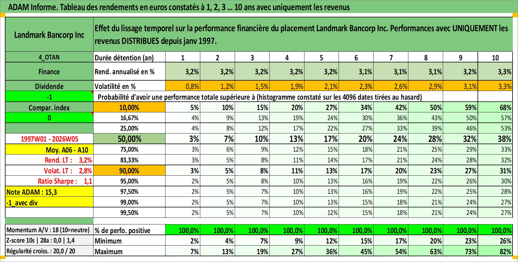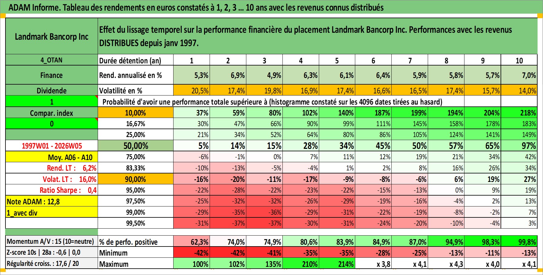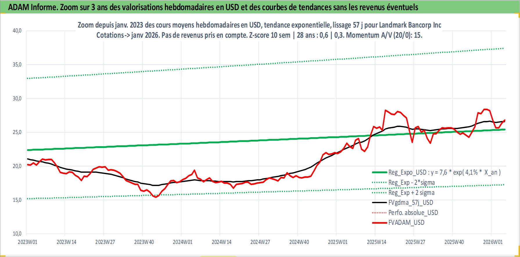 Site dédié aux investisseursPage dédiée sur site financeAnalyse des valorisations hebdomadaires de l'action Landmark Bancorp Inc. Cet actif est cote en USD. Les valorisations sont en contrevaleur EURO et couvrent les semaines 1997W01 a 2026W05. Les revenus de cet actif financier sont pris en compte depuis la semaine 1997W05. La note ESG de cet actif n'est pas connue.