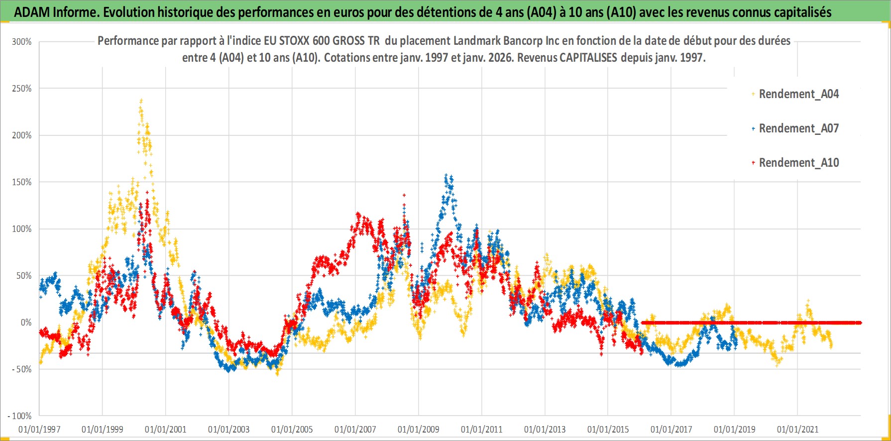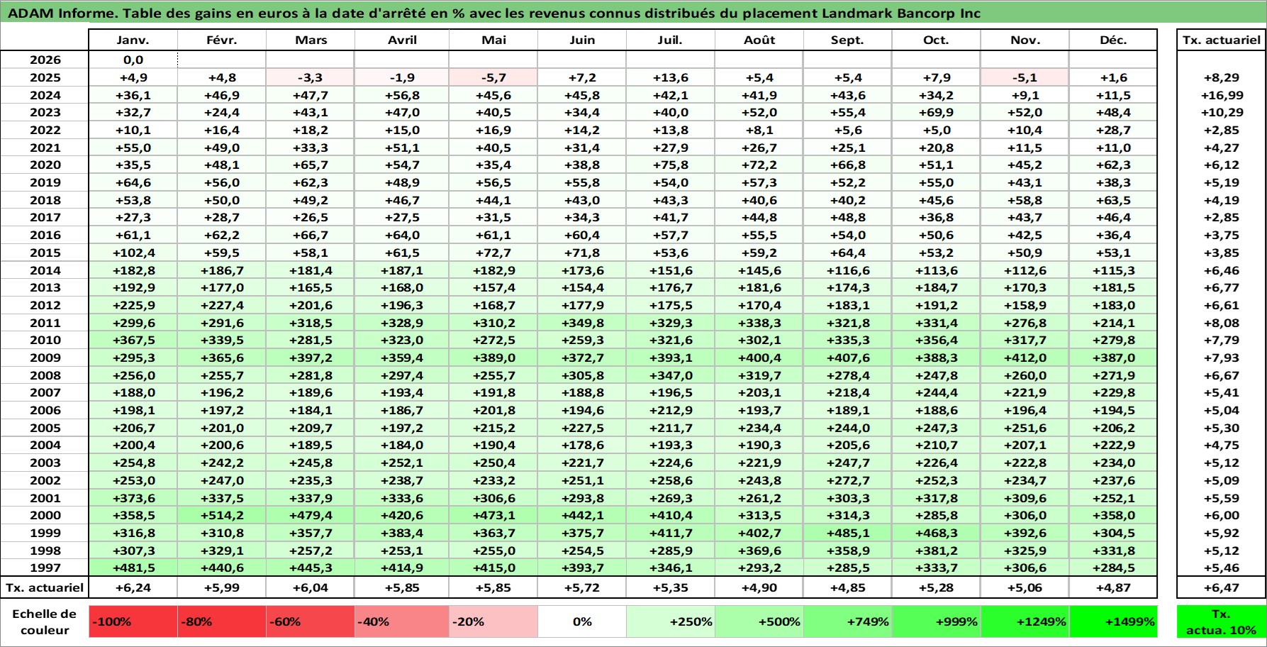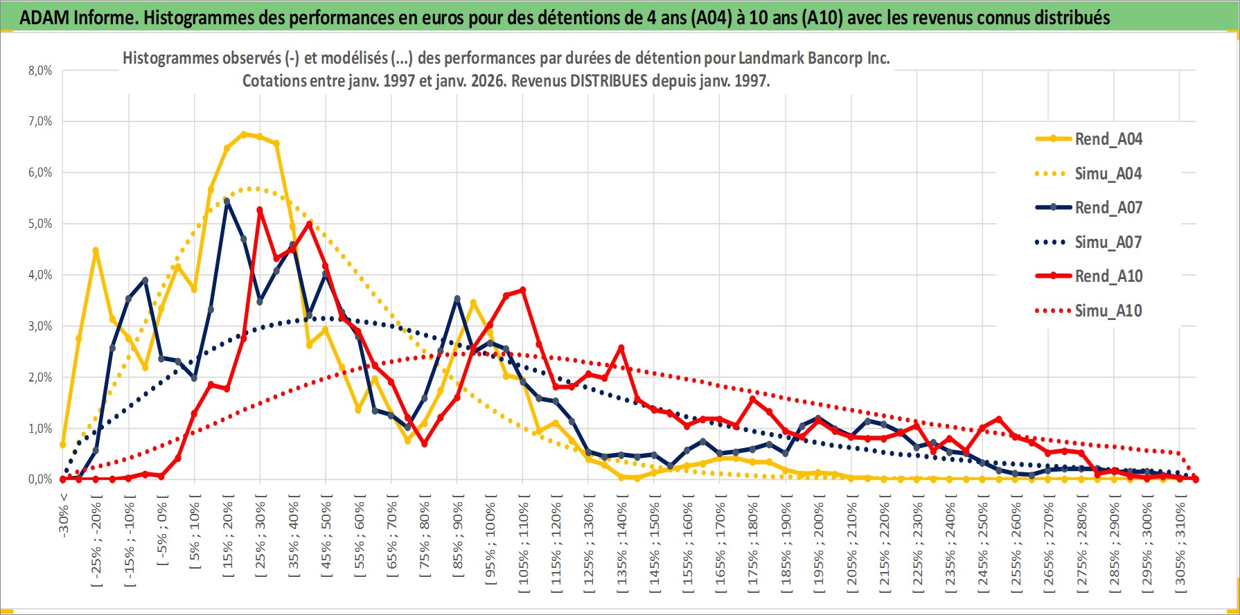 Site dédié aux investisseursPage dédiée sur site financeAnalyse des valorisations hebdomadaires de l'action Landmark Bancorp Inc. Cet actif est cote en USD. Les valorisations sont en contrevaleur EURO et couvrent les semaines 1997W01 a 2026W05. Les revenus de cet actif financier sont pris en compte depuis la semaine 1997W05. La note ESG de cet actif n'est pas connue.