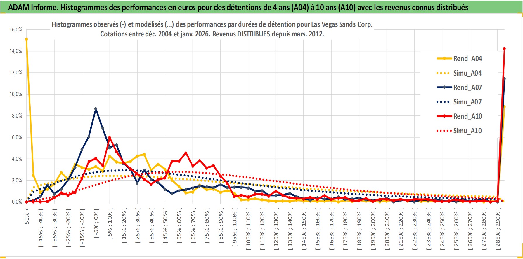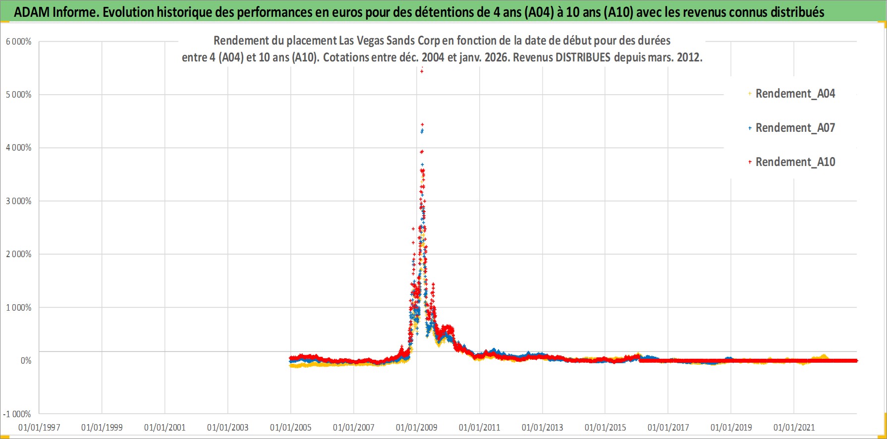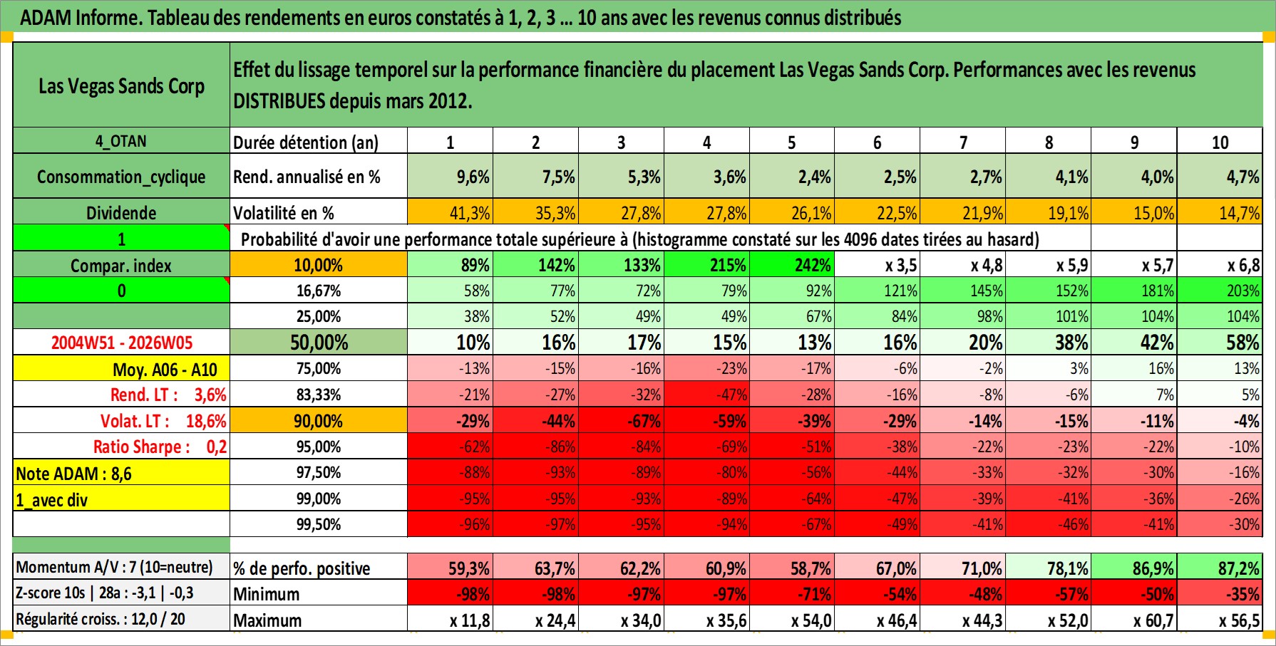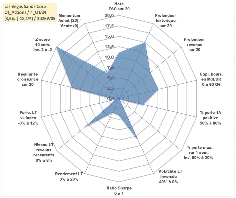 Site dédié aux investisseursPage dédiée sur site financeAnalyse des valorisations hebdomadaires de l'action Las Vegas Sands Corp. Cet actif est cote en USD. Les valorisations sont en contrevaleur EURO et couvrent les semaines 2004W51 a 2026W05. Les revenus de cet actif financier sont pris en compte depuis la semaine 2012W11. La note globale ESG de cet actif est estimee a 11.0 (apres rebasage entre 0 et 20).