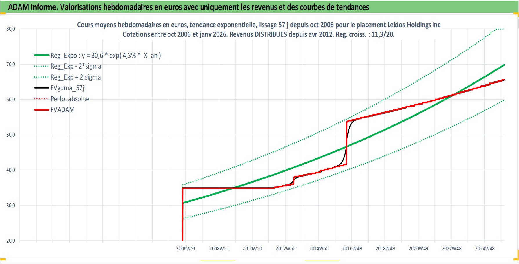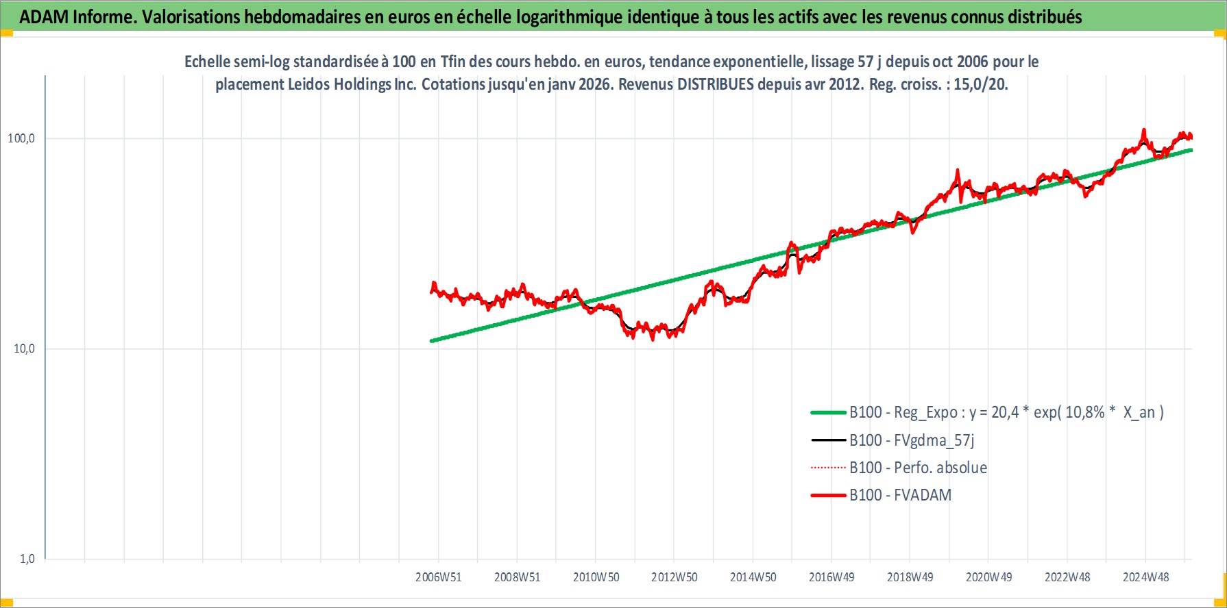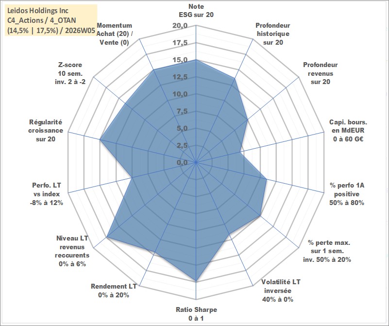 Site dédié aux investisseursPage dédiée sur site financeAnalyse des valorisations hebdomadaires de l'action Leidos Holdings Inc. Cet actif est cote en USD. Les valorisations sont en contrevaleur EURO et couvrent les semaines 2006W41 a 2026W05. Les revenus de cet actif financier sont pris en compte depuis la semaine 2012W15. La note globale ESG de cet actif est estimee a 15.0 (apres rebasage entre 0 et 20).