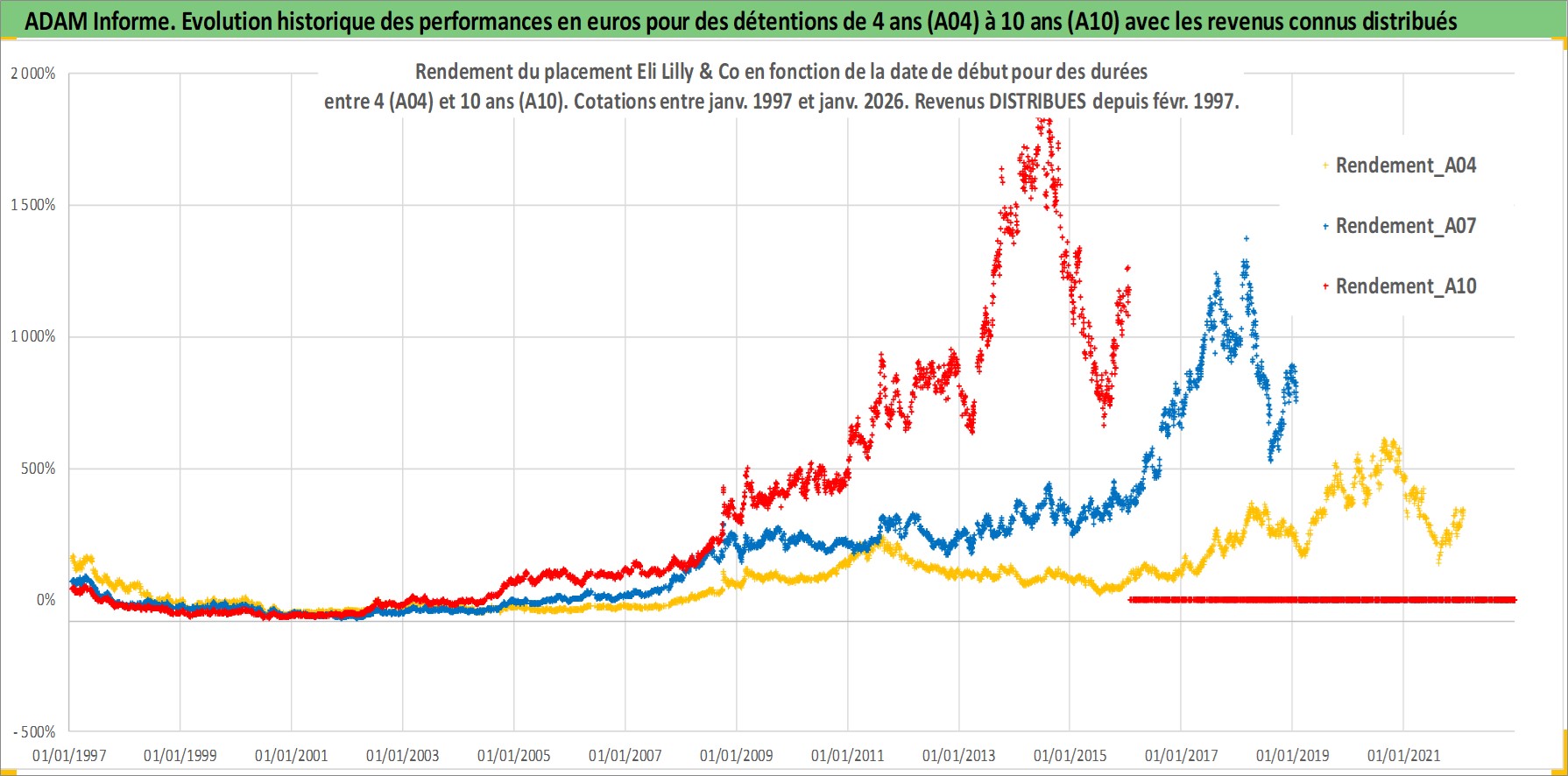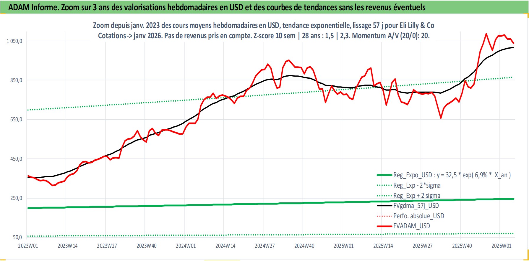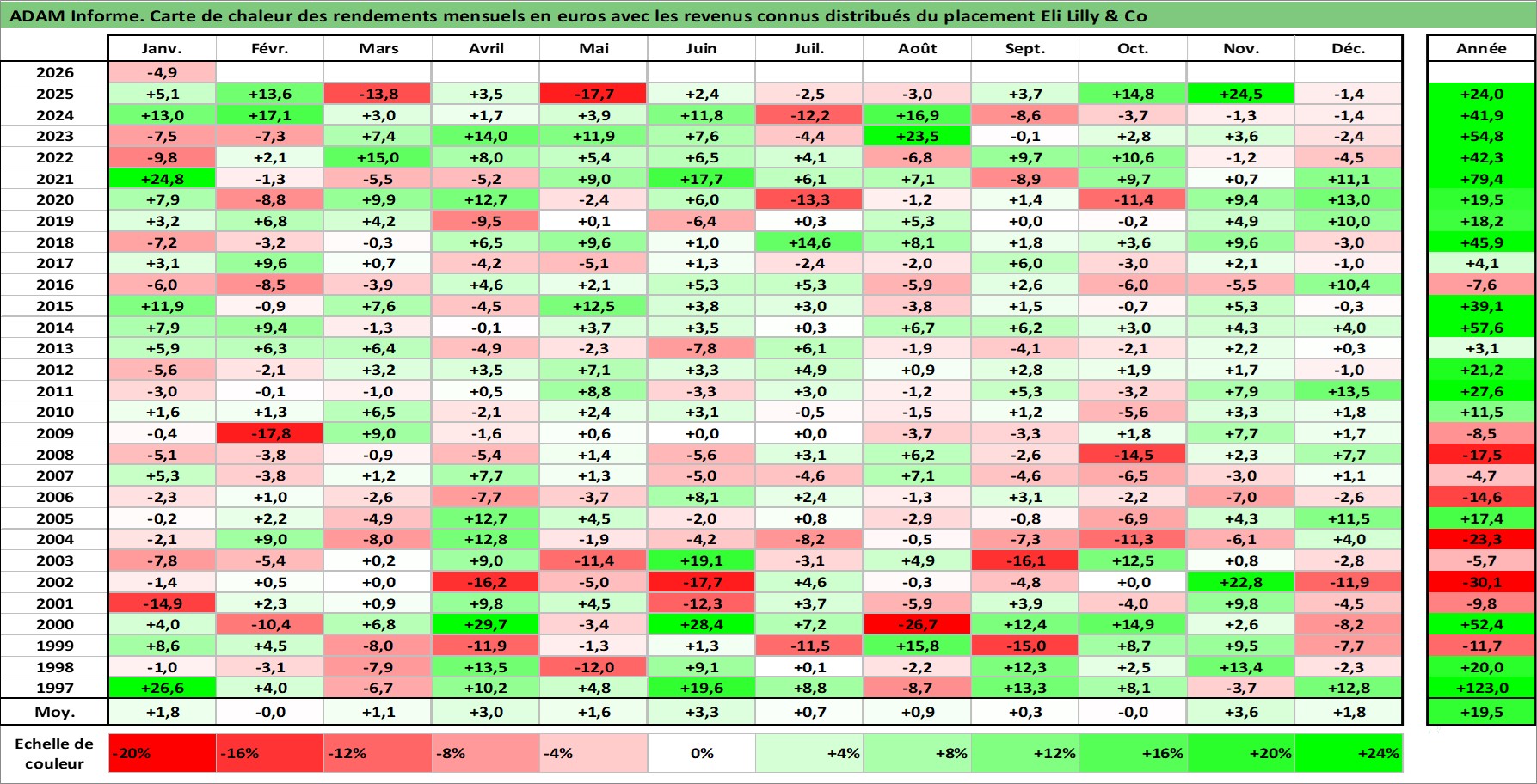 Site dédié aux investisseursPage dédiée sur site financeAnalyse des valorisations hebdomadaires de l'action Eli Lilly & Co. Cet actif est cote en USD. Les valorisations sont en contrevaleur EURO et couvrent les semaines 1997W01 a 2026W05. Les revenus de cet actif financier sont pris en compte depuis la semaine 1997W07. La note globale ESG de cet actif est estimee a 4.0 (apres rebasage entre 0 et 20).