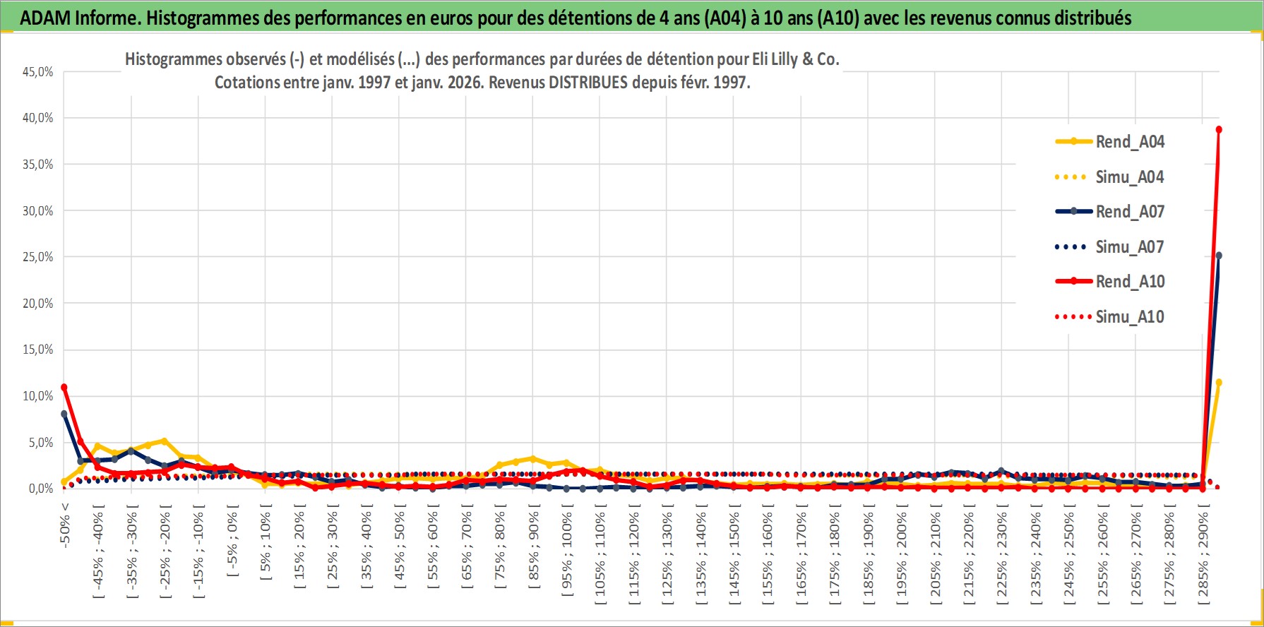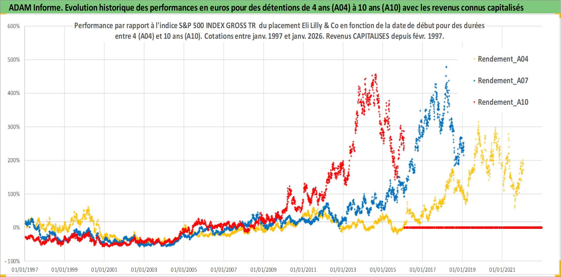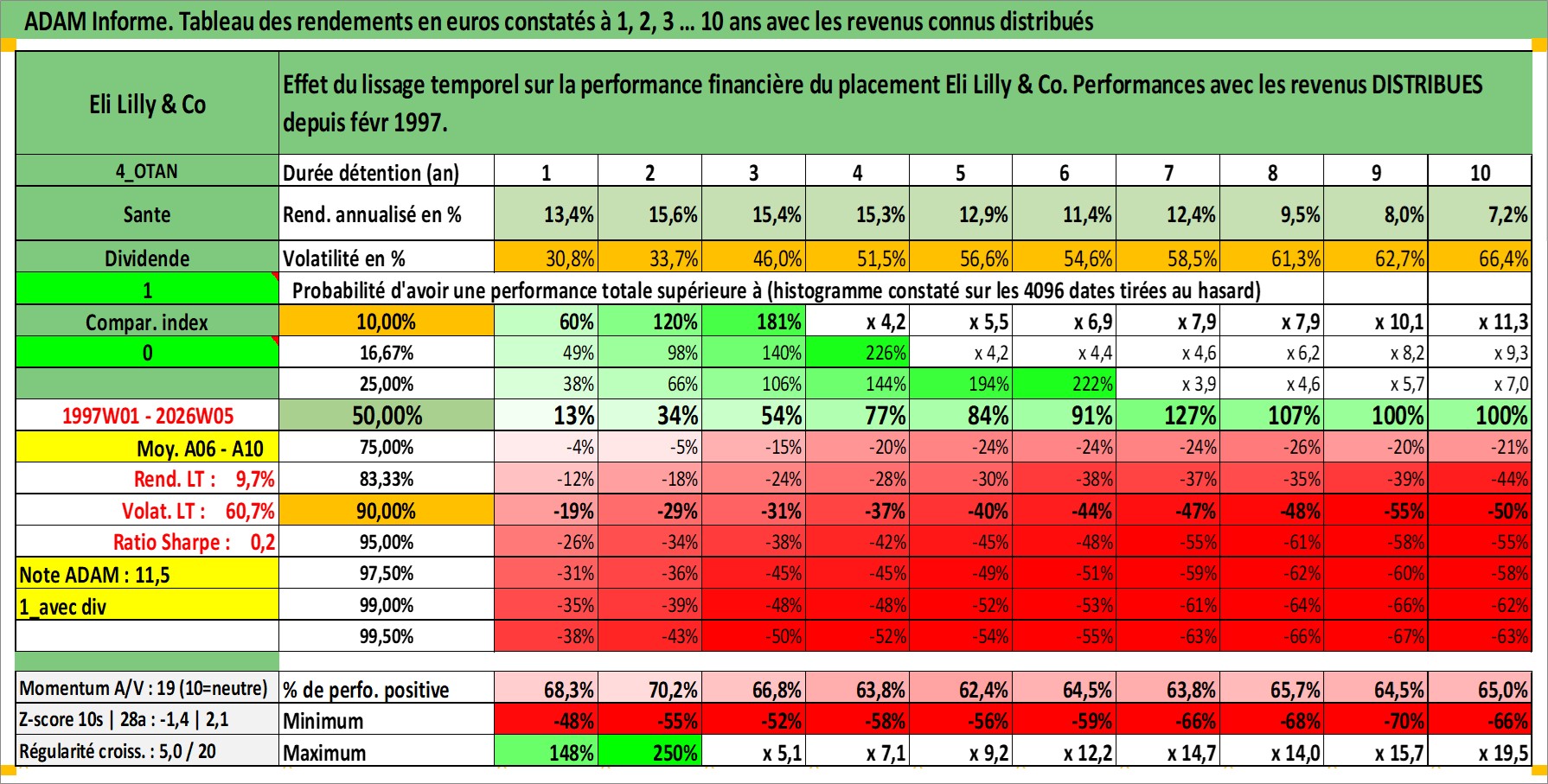 Site dédié aux investisseursPage dédiée sur site financeAnalyse des valorisations hebdomadaires de l'action Eli Lilly & Co. Cet actif est cote en USD. Les valorisations sont en contrevaleur EURO et couvrent les semaines 1997W01 a 2026W05. Les revenus de cet actif financier sont pris en compte depuis la semaine 1997W07. La note globale ESG de cet actif est estimee a 4.0 (apres rebasage entre 0 et 20).