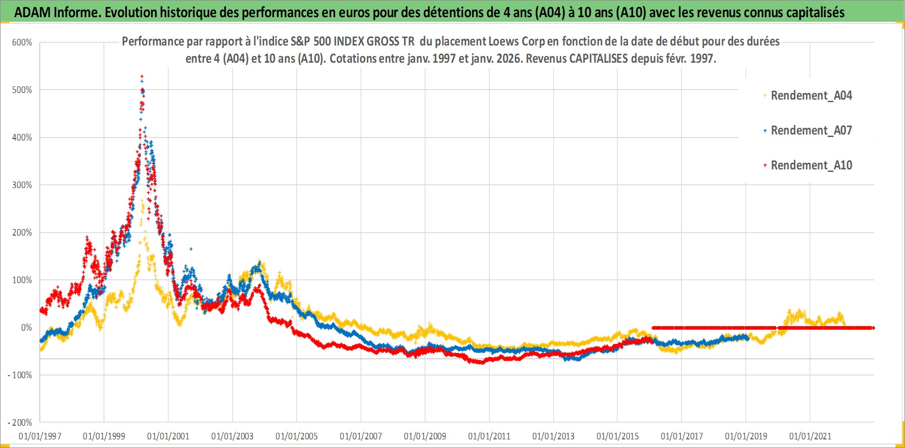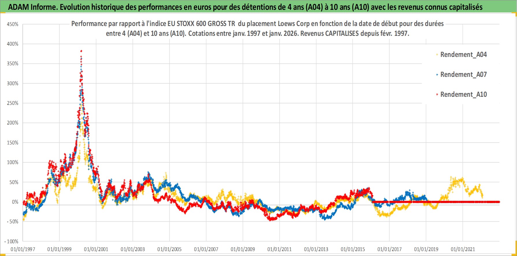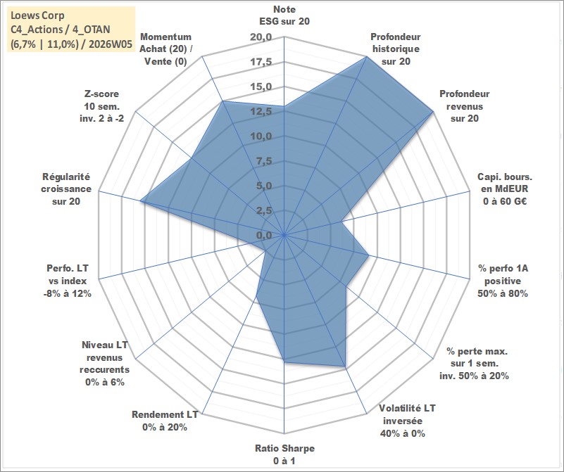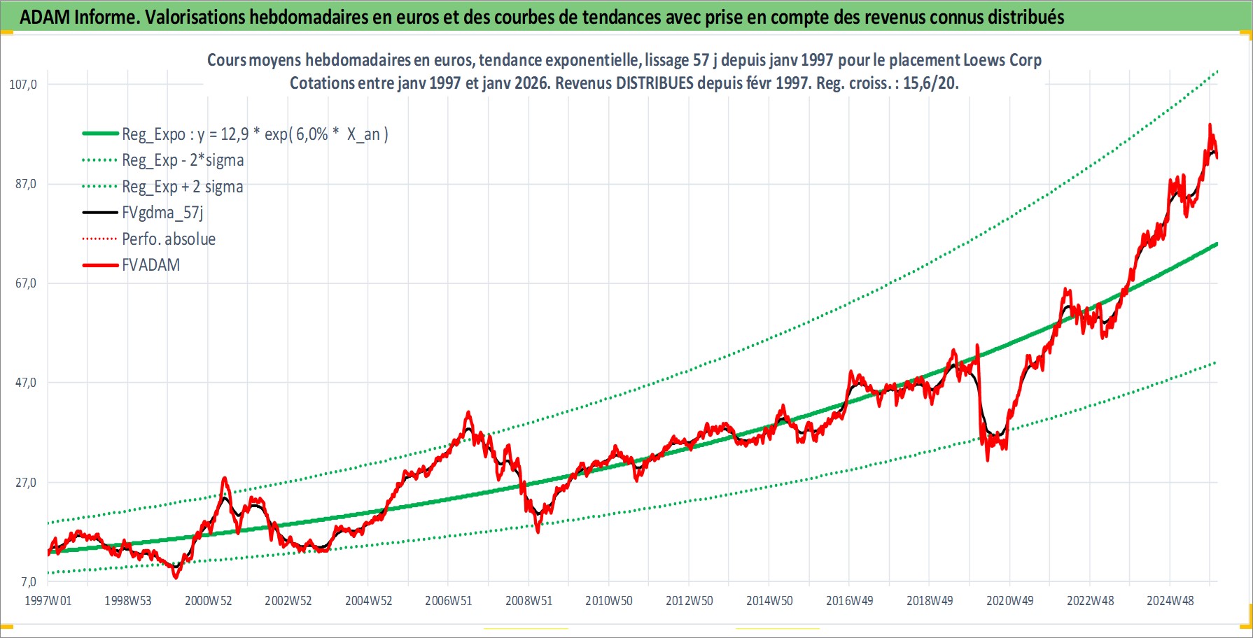 Site dédié aux investisseursPage dédiée sur site financeAnalyse des valorisations hebdomadaires de l'action Loews Corp. Cet actif est cote en USD. Les valorisations sont en contrevaleur EURO et couvrent les semaines 1997W01 a 2026W05. Les revenus de cet actif financier sont pris en compte depuis la semaine 1997W06. La note globale ESG de cet actif est estimee a 13.0 (apres rebasage entre 0 et 20).