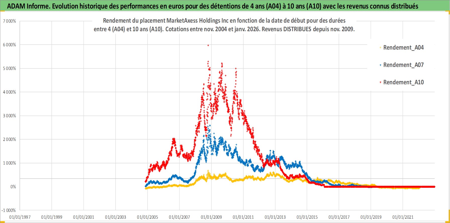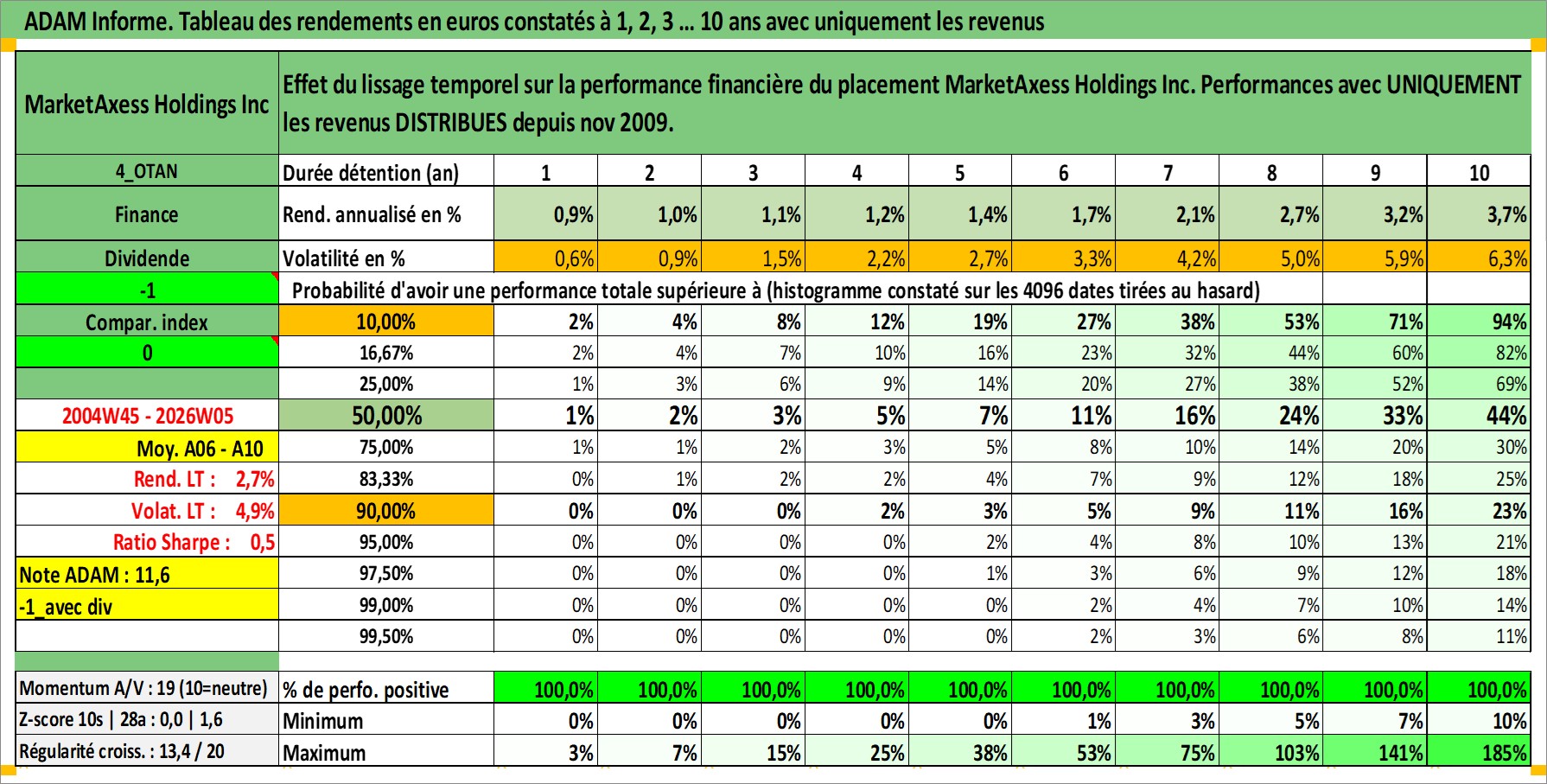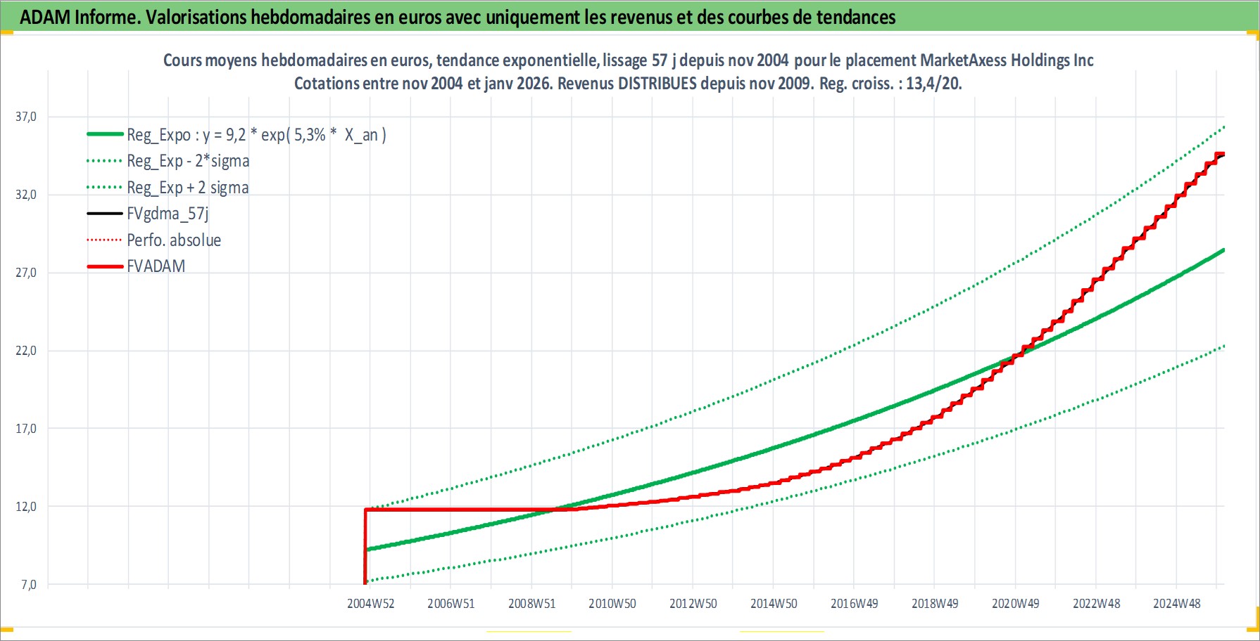 Site dédié aux investisseursPage dédiée sur site financeAnalyse des valorisations hebdomadaires de l'action MarketAxess Holdings Inc. Cet actif est cote en USD. Les valorisations sont en contrevaleur EURO et couvrent les semaines 2004W45 a 2026W05. Les revenus de cet actif financier sont pris en compte depuis la semaine 2009W45. La note ESG de cet actif n'est pas connue.