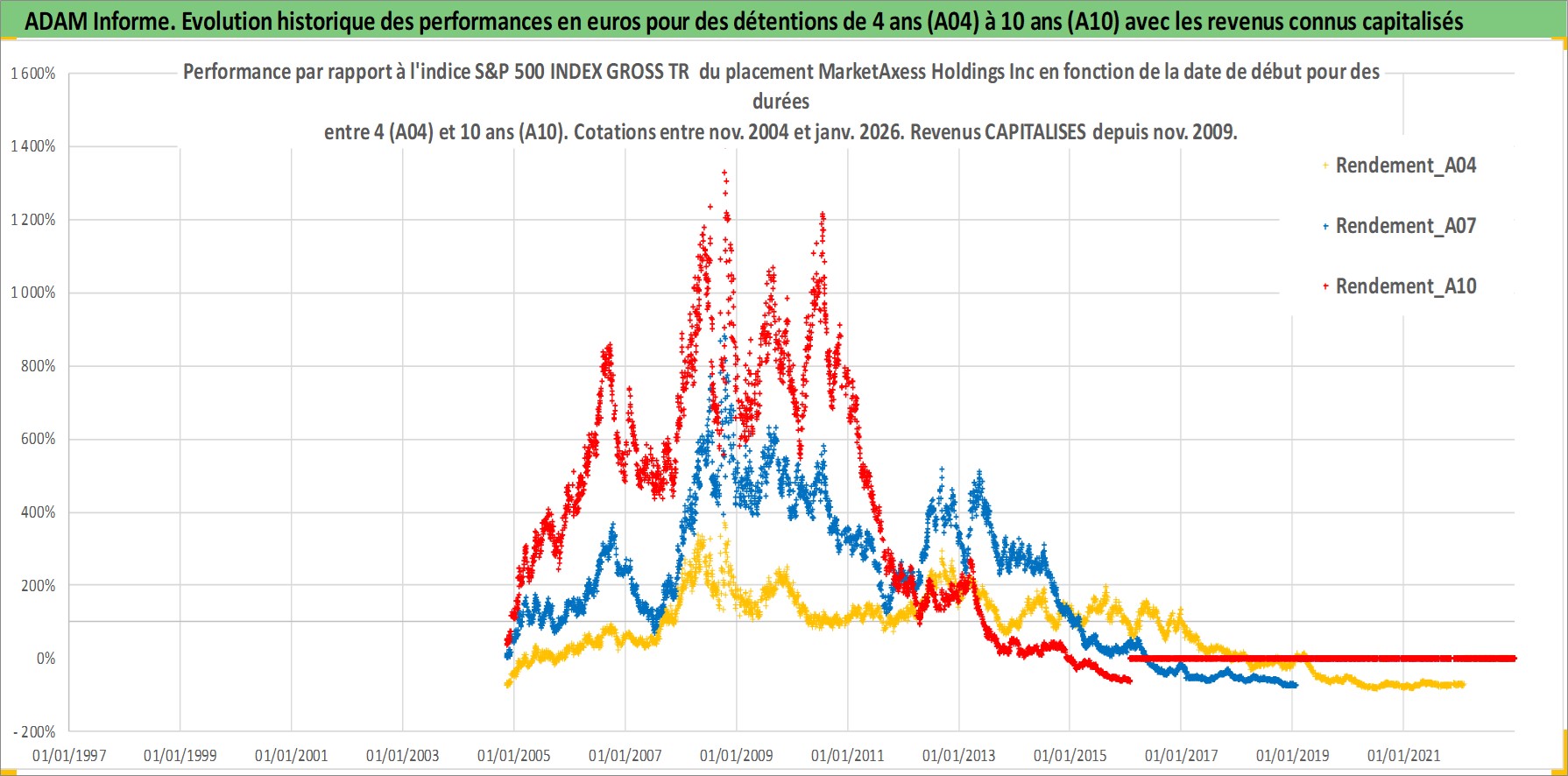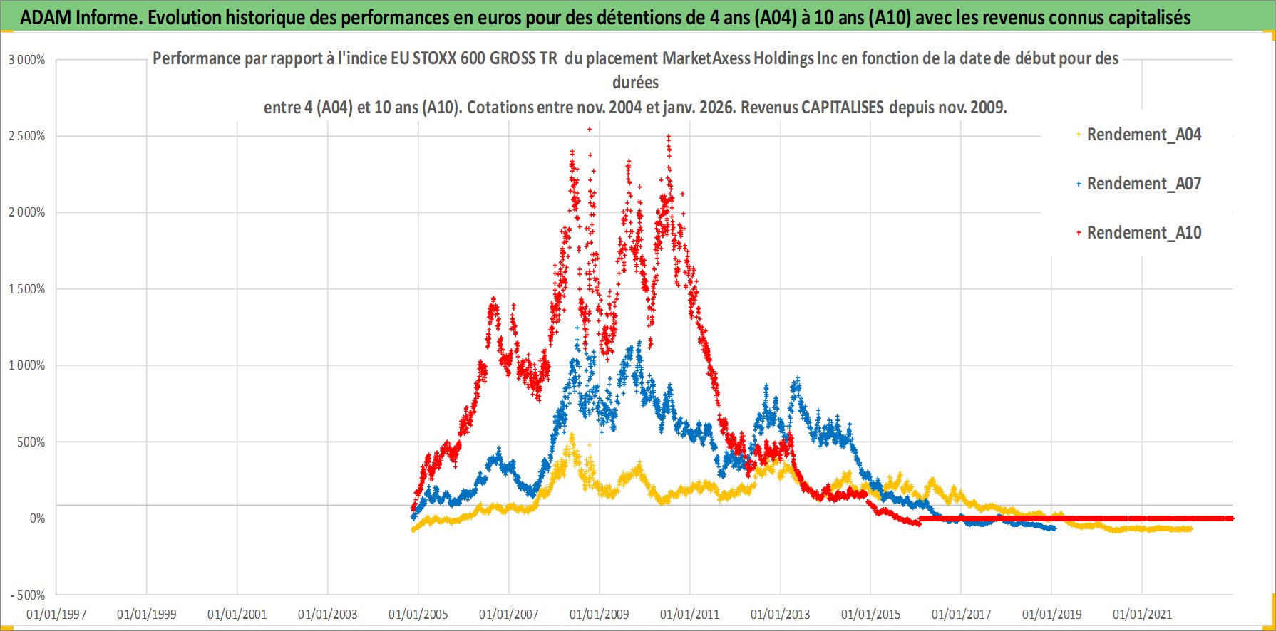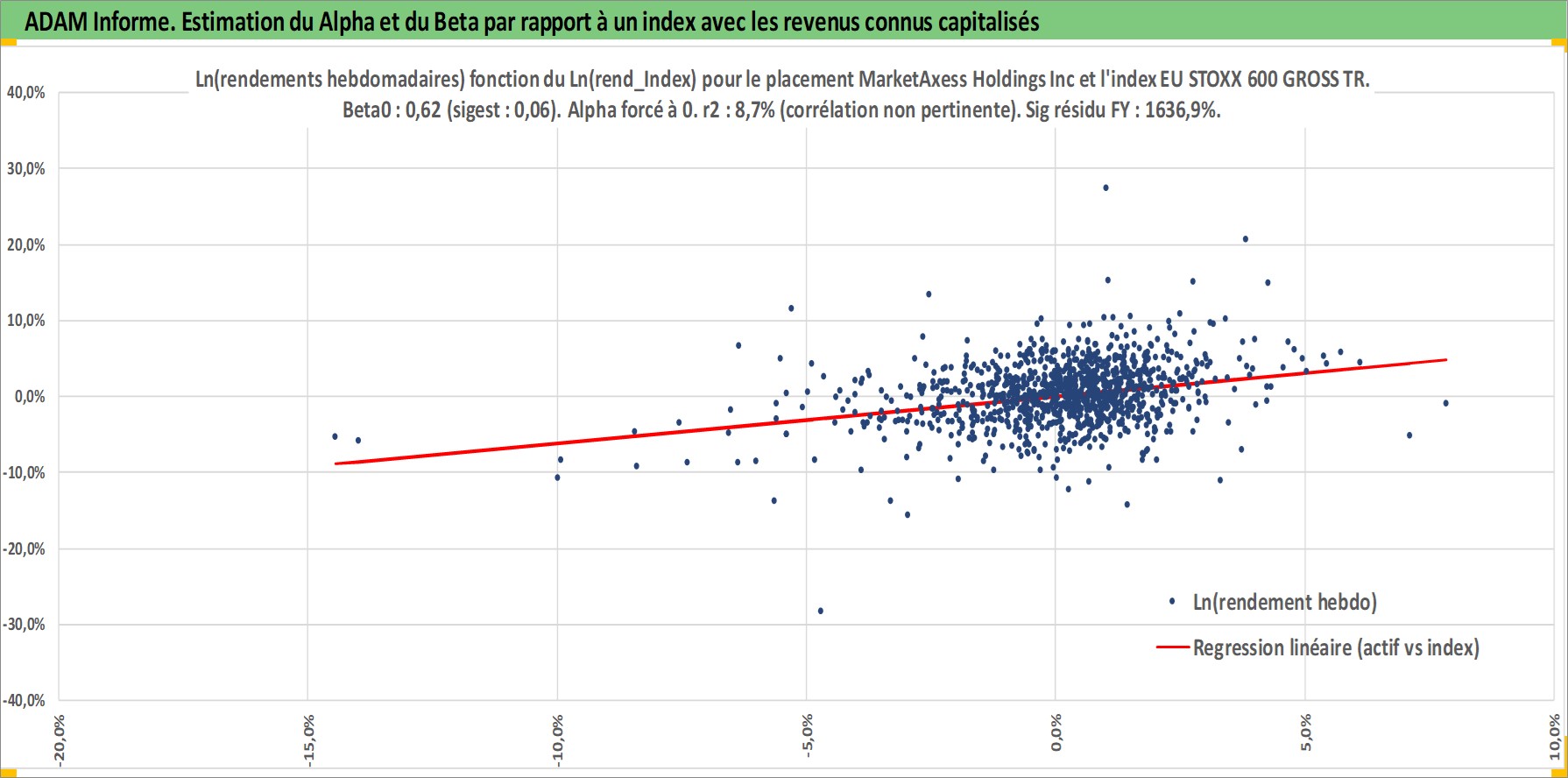 Site dédié aux investisseursPage dédiée sur site financeAnalyse des valorisations hebdomadaires de l'action MarketAxess Holdings Inc. Cet actif est cote en USD. Les valorisations sont en contrevaleur EURO et couvrent les semaines 2004W45 a 2026W05. Les revenus de cet actif financier sont pris en compte depuis la semaine 2009W45. La note ESG de cet actif n'est pas connue.