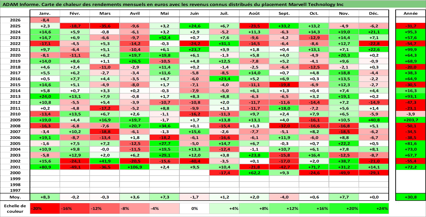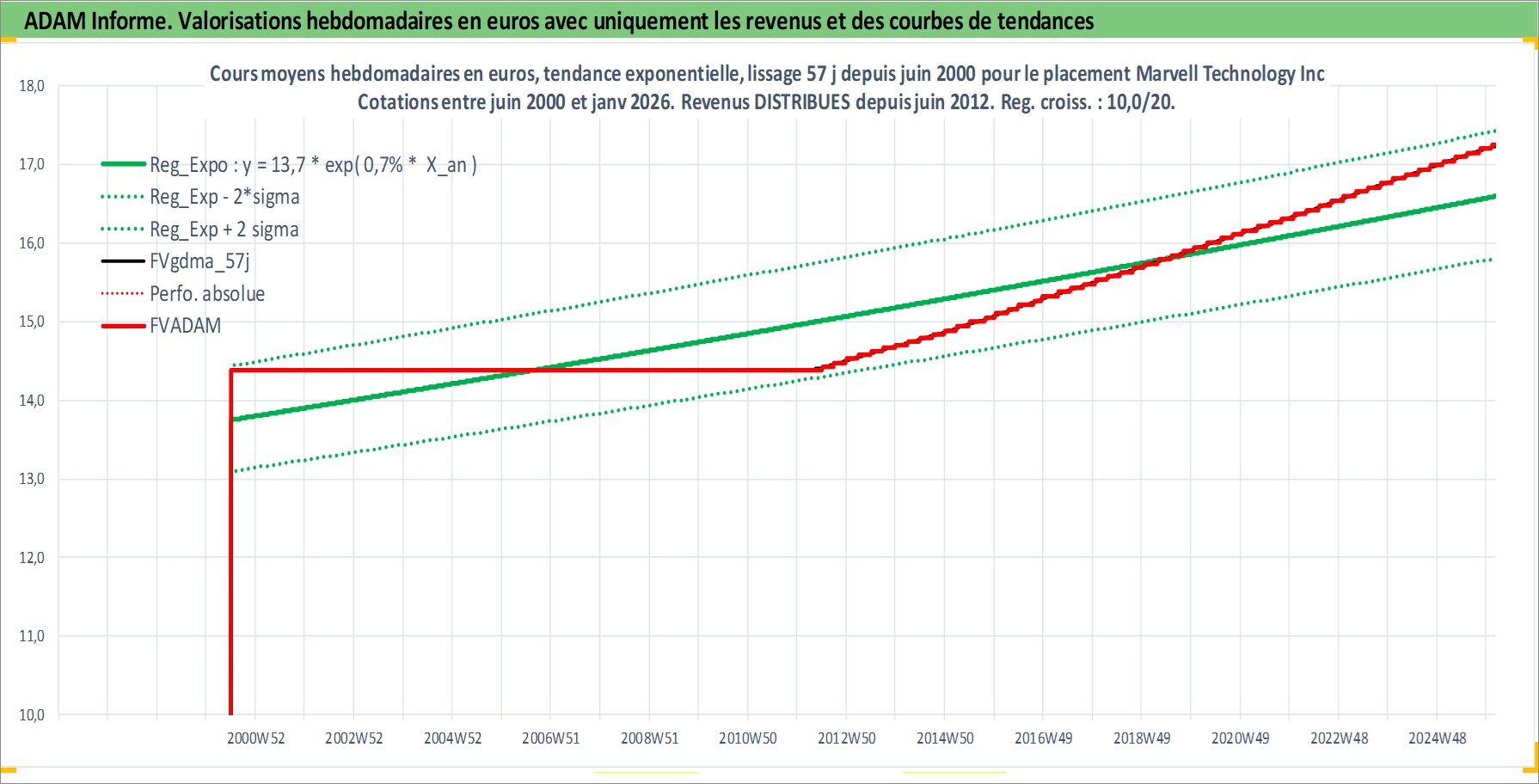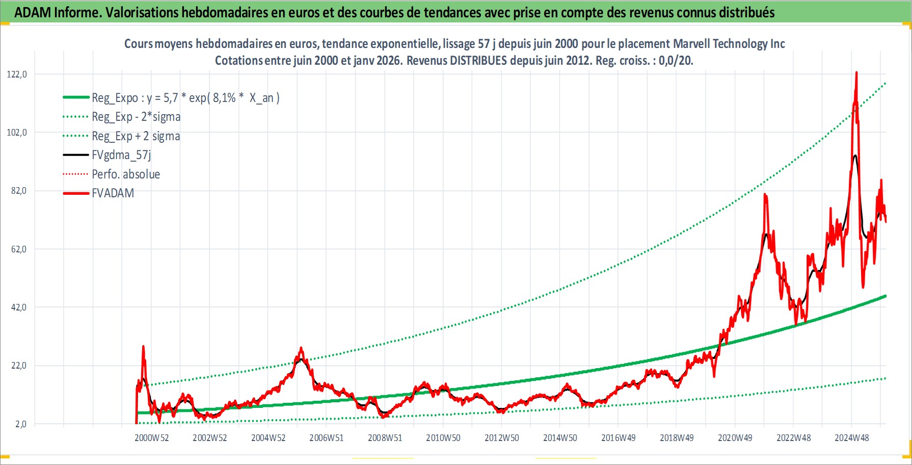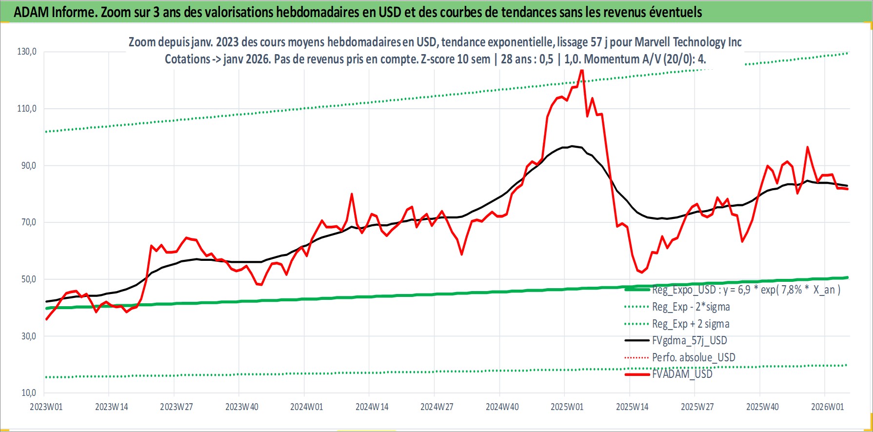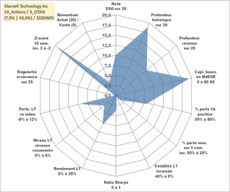 Site dédié aux investisseursPage dédiée sur site financeAnalyse des valorisations hebdomadaires de l'action Marvell Technology Inc. Cet actif est cote en USD. Les valorisations sont en contrevaleur EURO et couvrent les semaines 2000W26 a 2026W05. Les revenus de cet actif financier sont pris en compte depuis la semaine 2012W25. La note globale ESG de cet actif est estimee a 10.0 (apres rebasage entre 0 et 20).