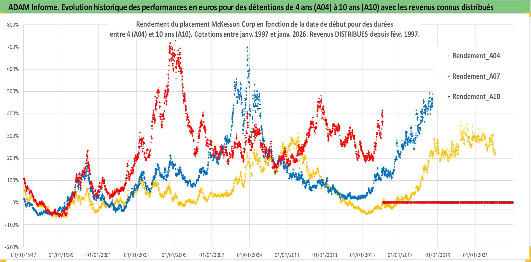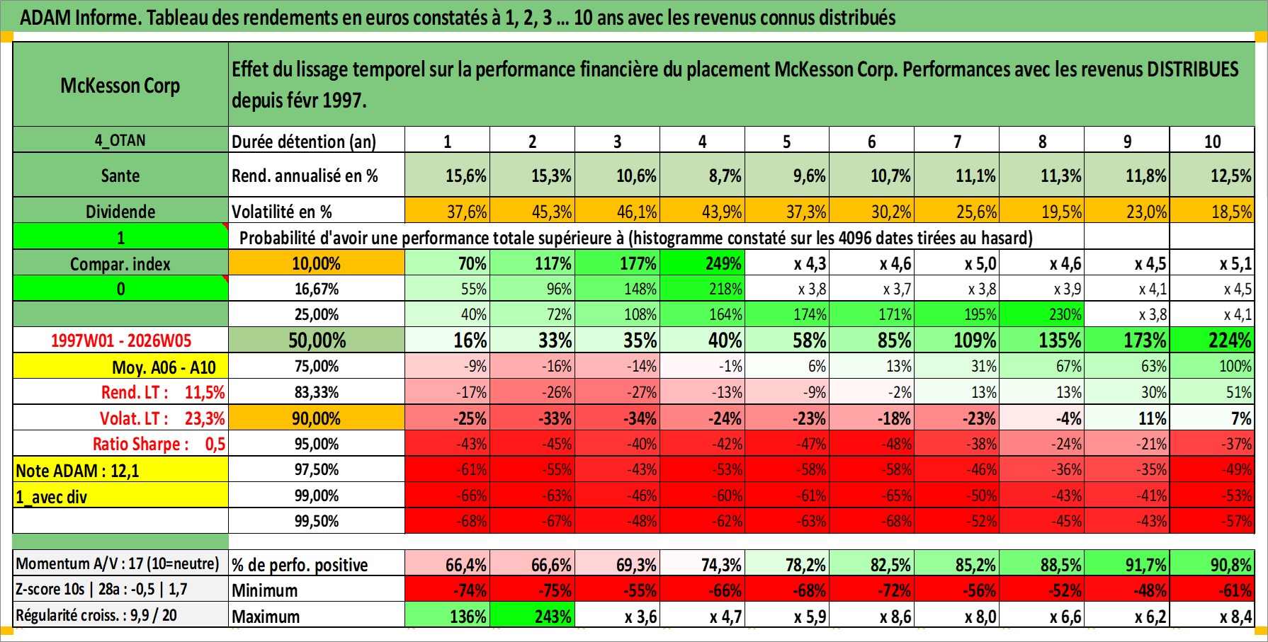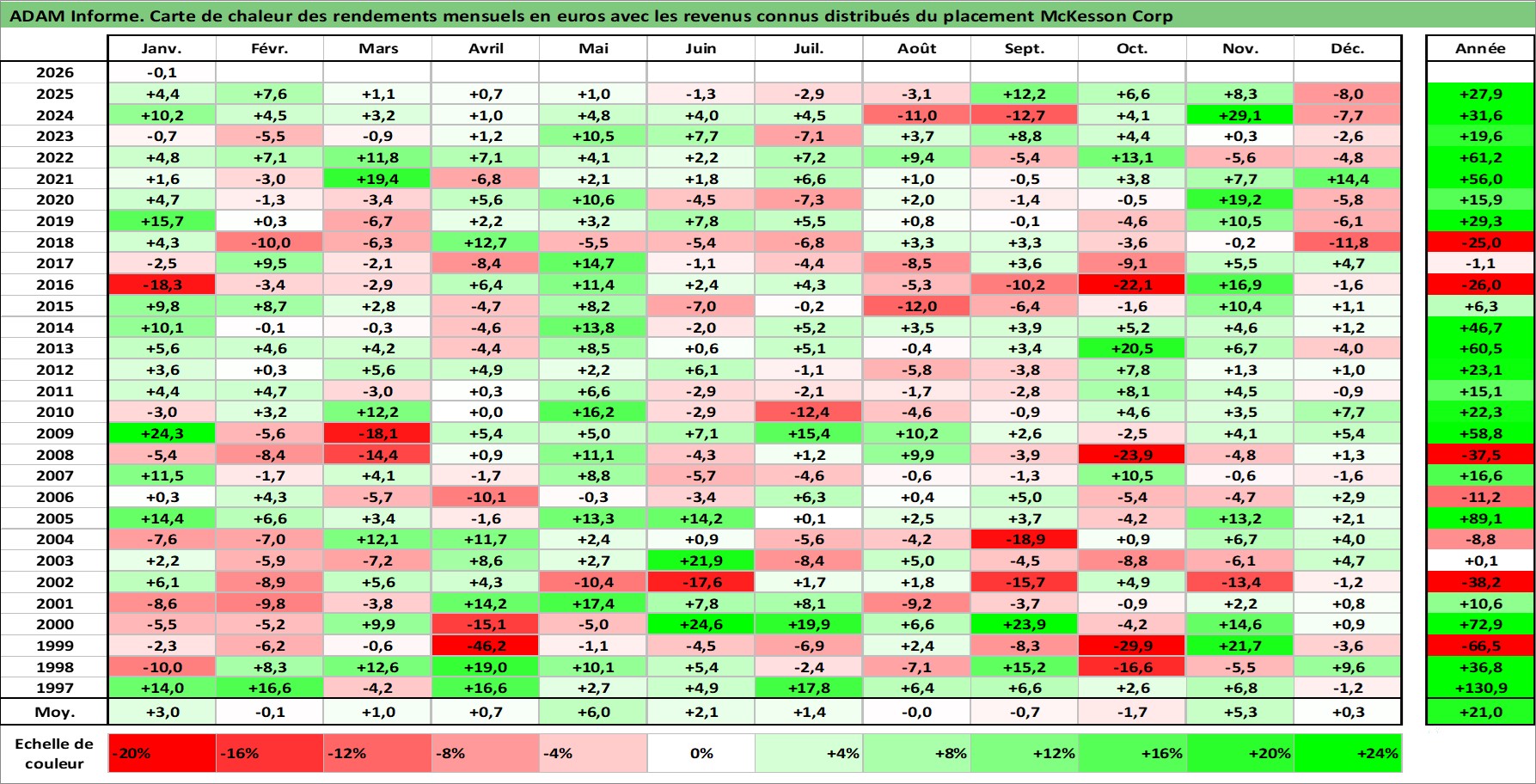 Site dédié aux investisseursPage dédiée sur site financeAnalyse des valorisations hebdomadaires de l'action McKesson Corp. Cet actif est cote en USD. Les valorisations sont en contrevaleur EURO et couvrent les semaines 1997W01 a 2026W05. Les revenus de cet actif financier sont pris en compte depuis la semaine 1997W09. La note globale ESG de cet actif est estimee a 13.0 (apres rebasage entre 0 et 20).