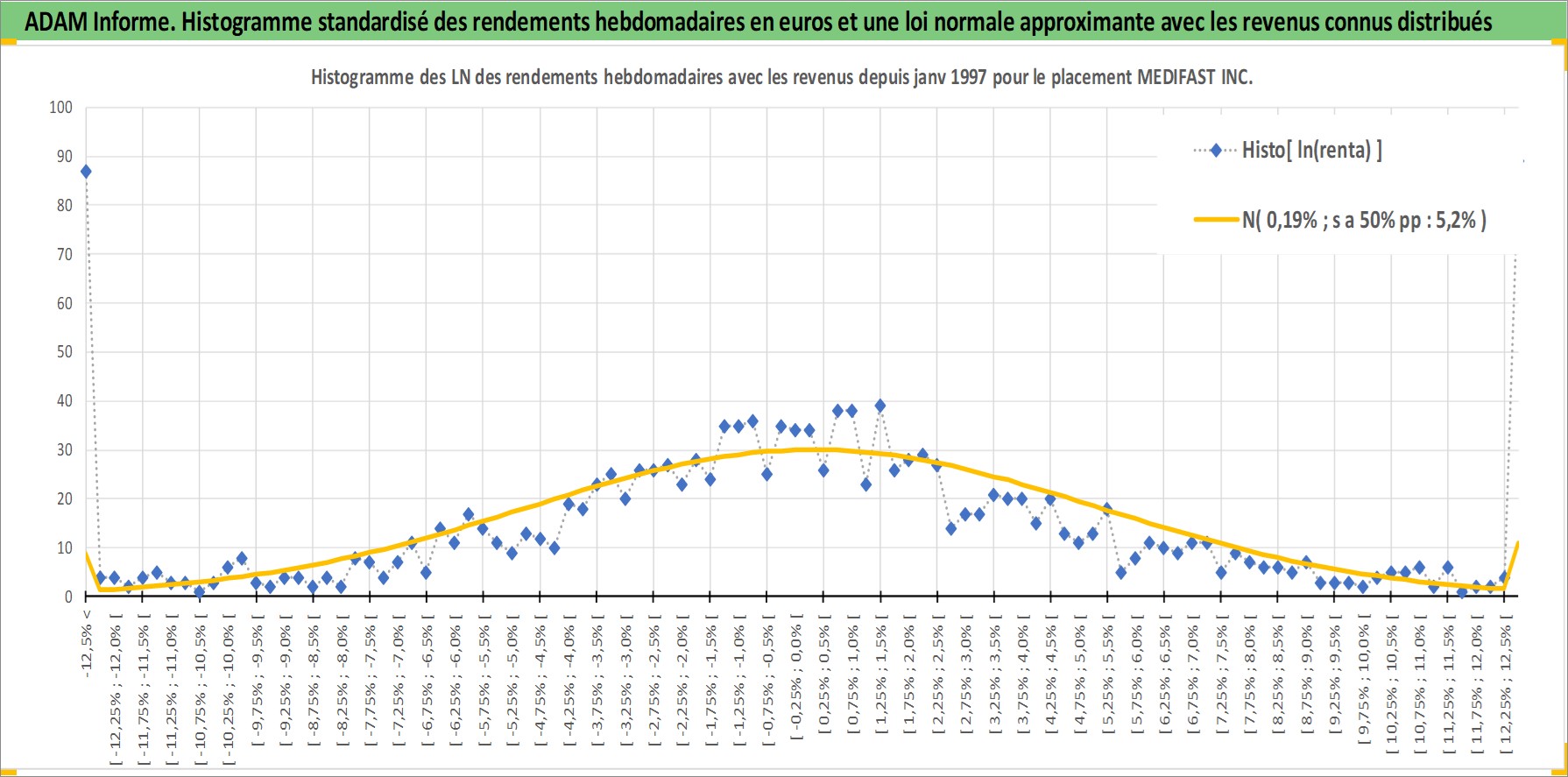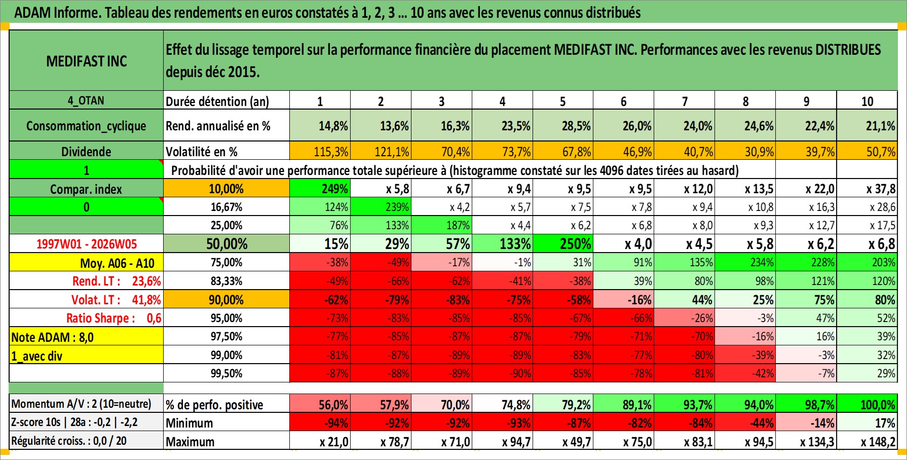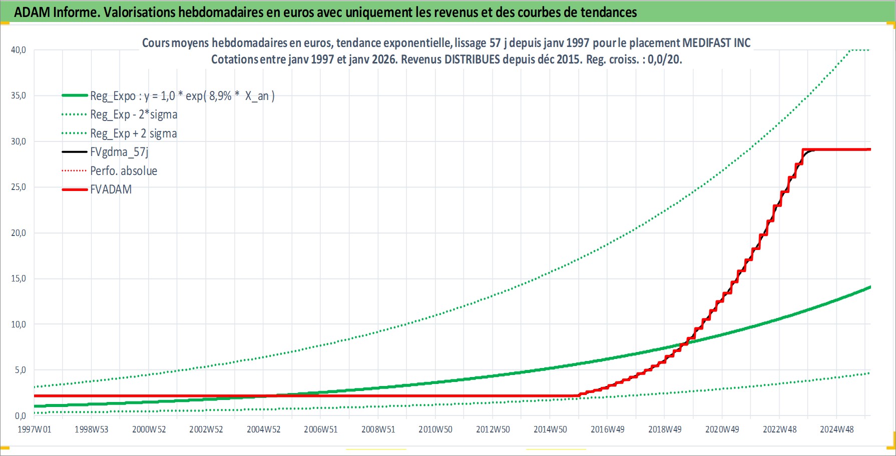 Site dédié aux investisseursPage dédiée sur site financeAnalyse des valorisations hebdomadaires de l'action MEDIFAST INC. Cet actif est cote en USD. Les valorisations sont en contrevaleur EURO et couvrent les semaines 1997W01 a 2026W05. Les revenus de cet actif financier sont pris en compte depuis la semaine 2015W52. La note ESG de cet actif n'est pas connue.