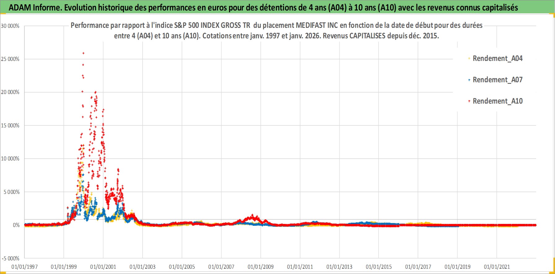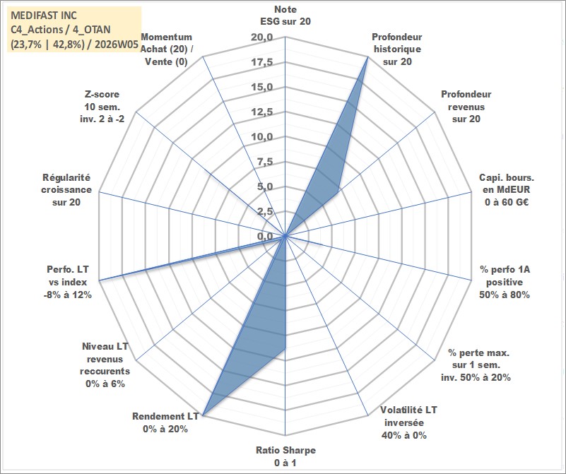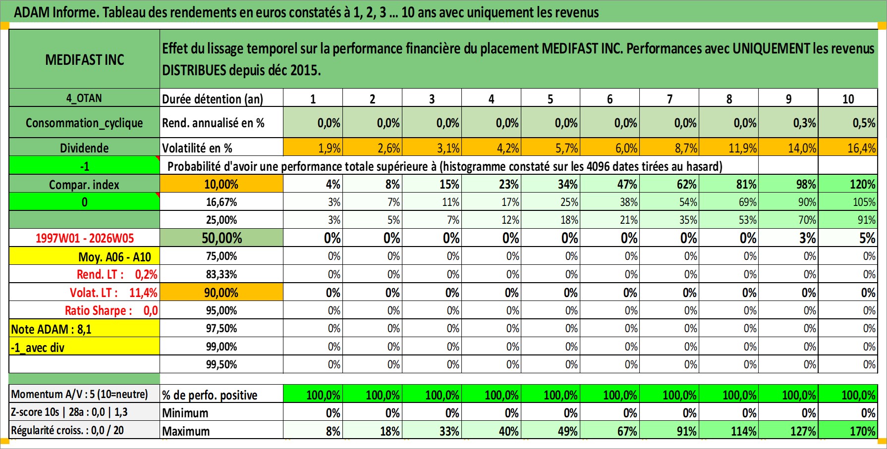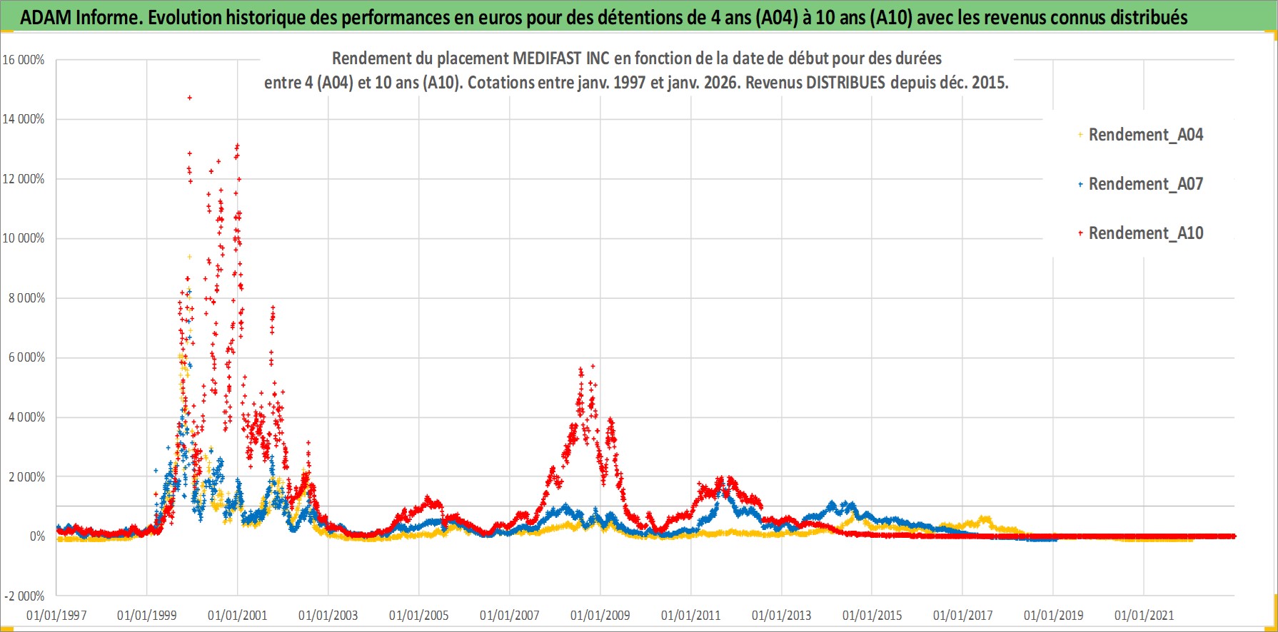 Site dédié aux investisseursPage dédiée sur site financeAnalyse des valorisations hebdomadaires de l'action MEDIFAST INC. Cet actif est cote en USD. Les valorisations sont en contrevaleur EURO et couvrent les semaines 1997W01 a 2026W05. Les revenus de cet actif financier sont pris en compte depuis la semaine 2015W52. La note ESG de cet actif n'est pas connue.