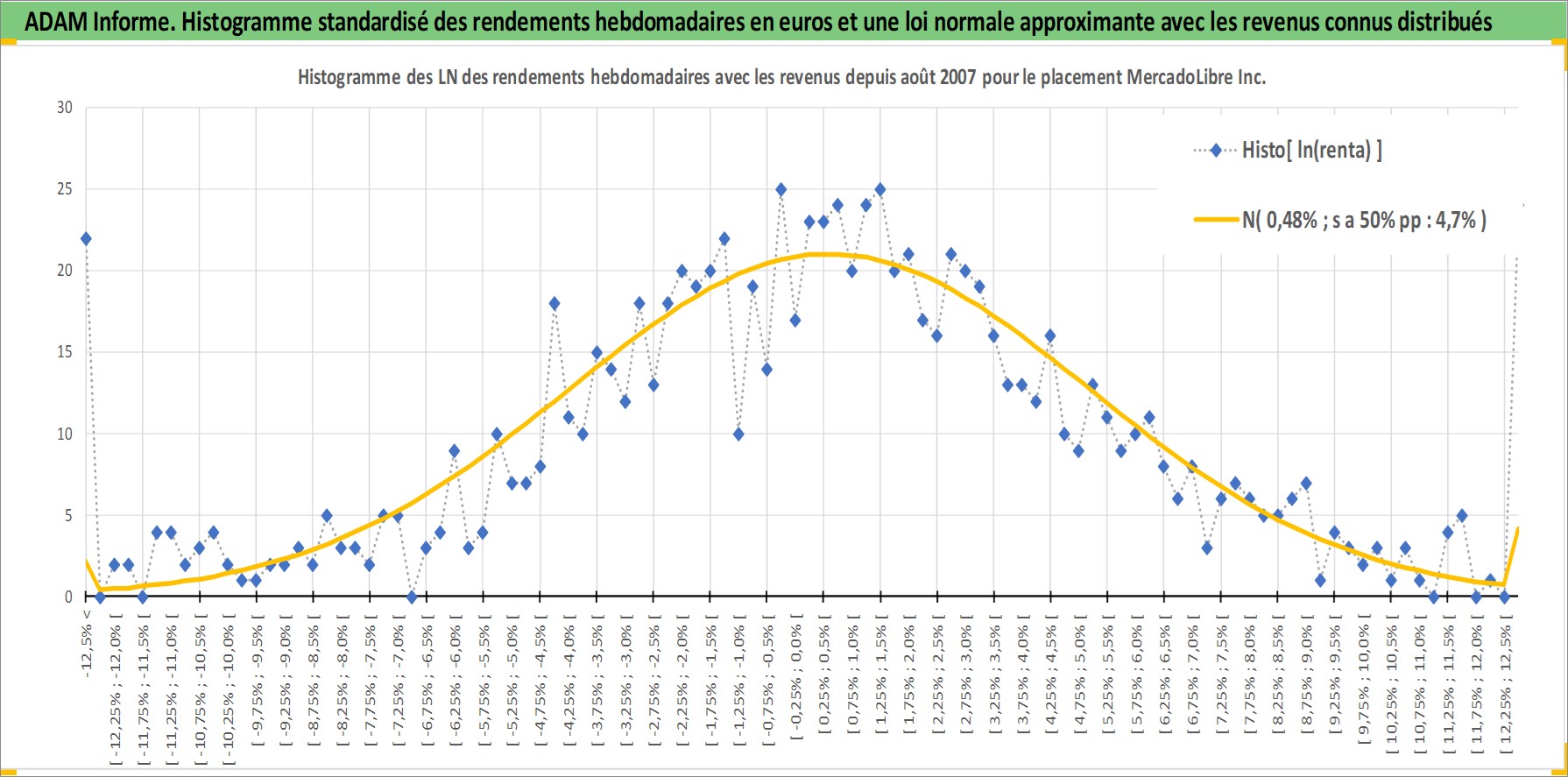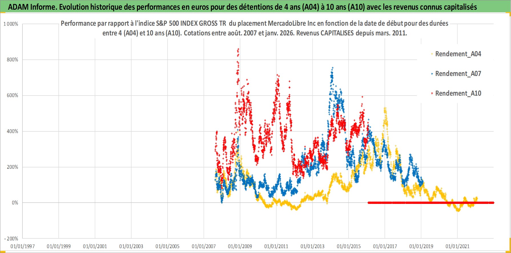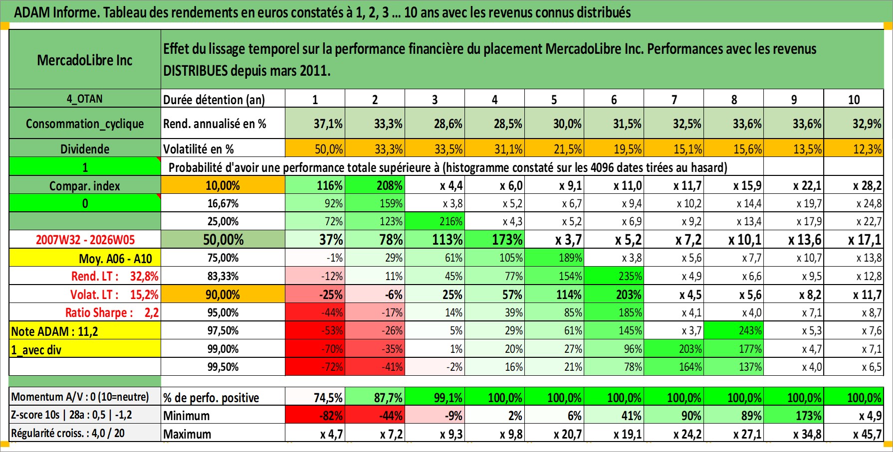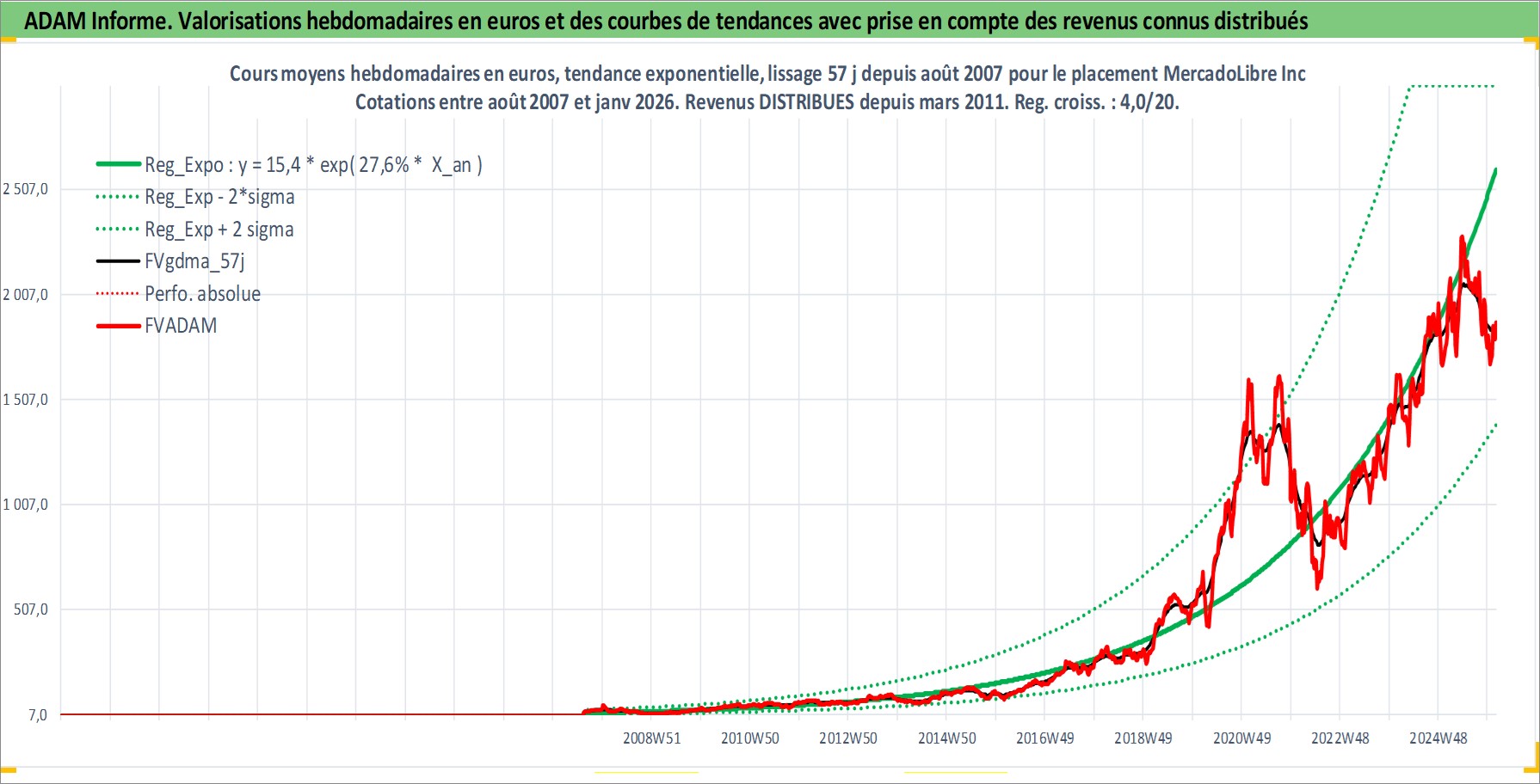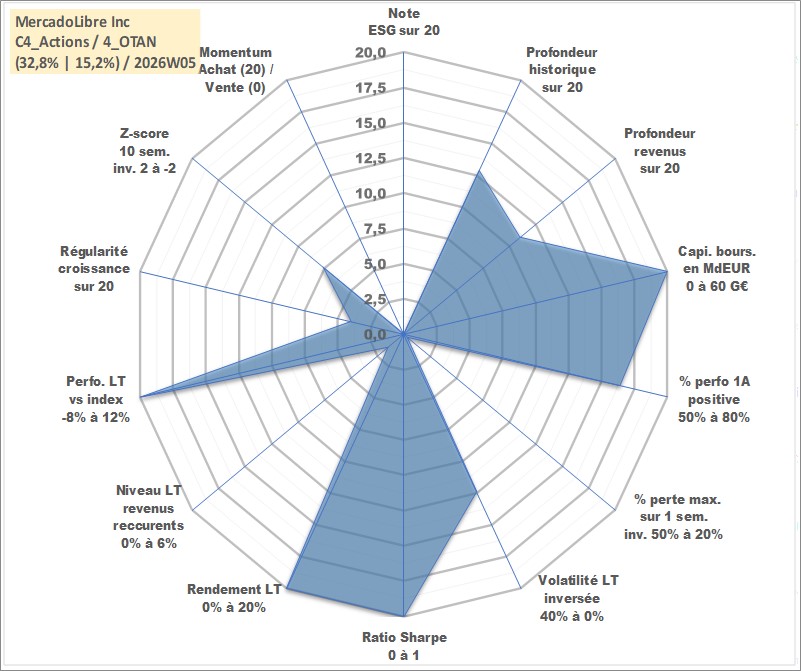 Site dédié aux investisseursPage dédiée sur site financeAnalyse des valorisations hebdomadaires de l'action MercadoLibre Inc. Cet actif est cote en USD. Les valorisations sont en contrevaleur EURO et couvrent les semaines 2007W32 a 2026W05. Les revenus de cet actif financier sont pris en compte depuis la semaine 2011W13. La note ESG de cet actif n'est pas connue.