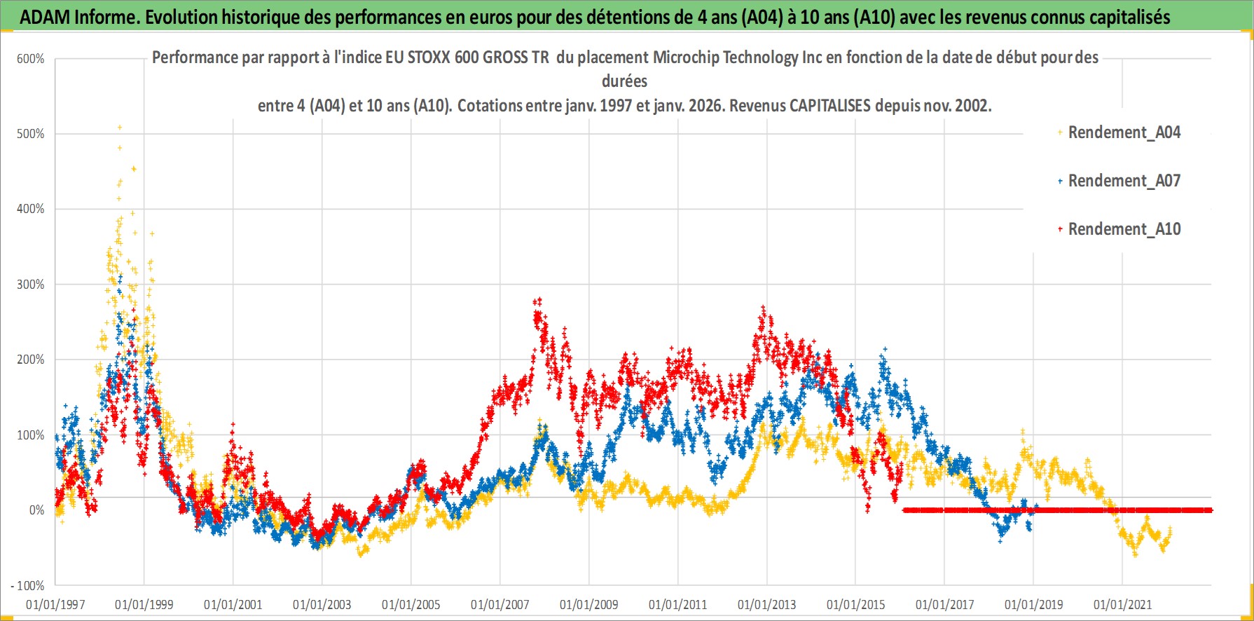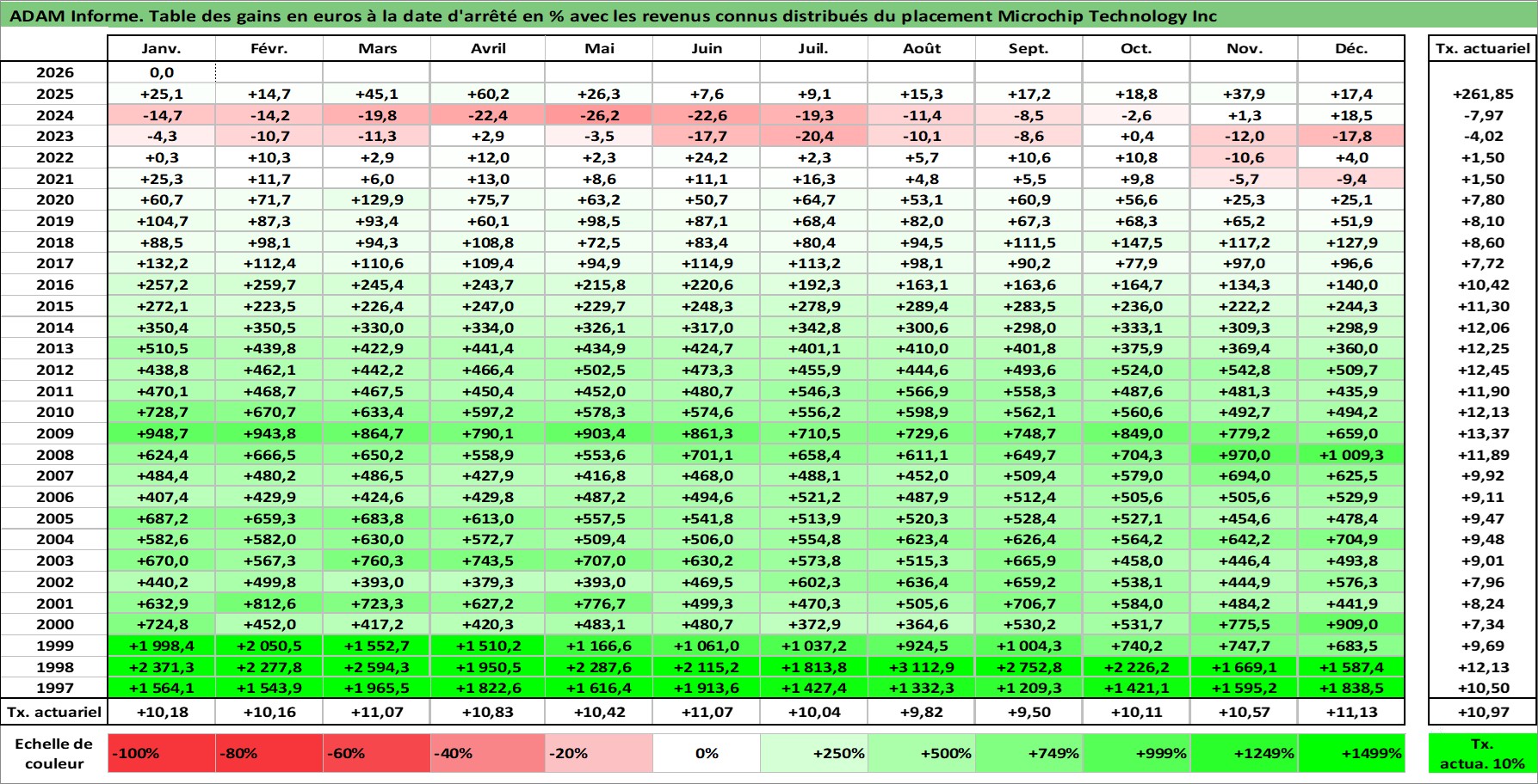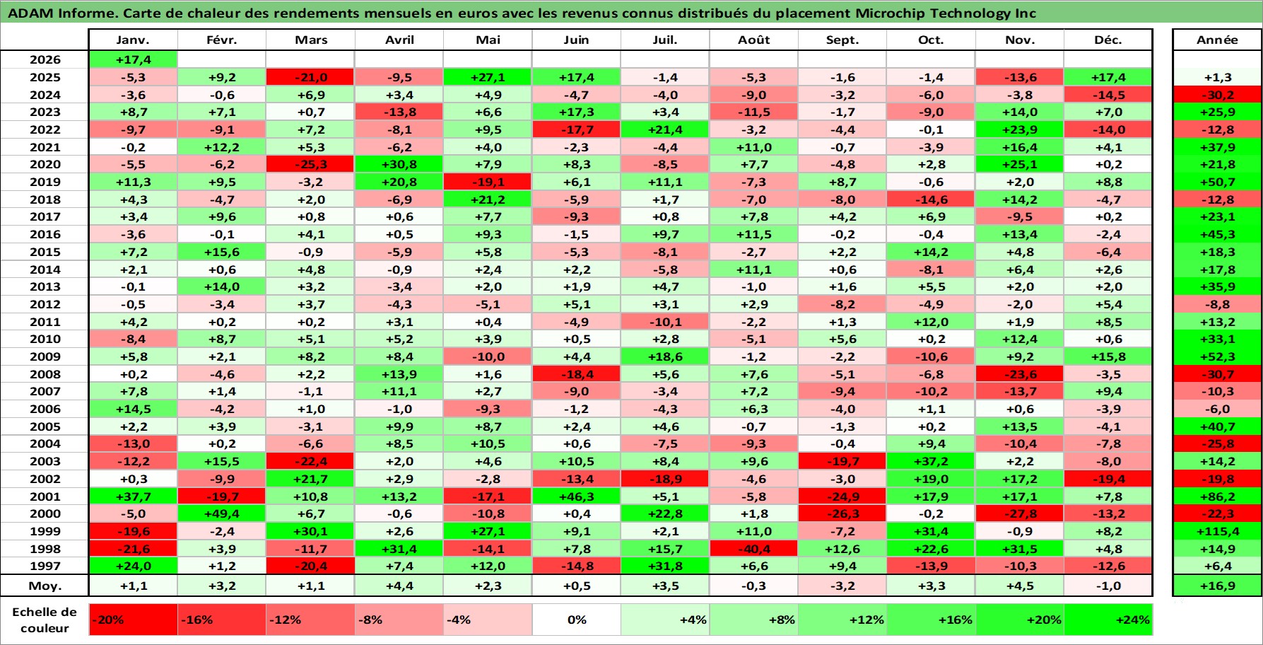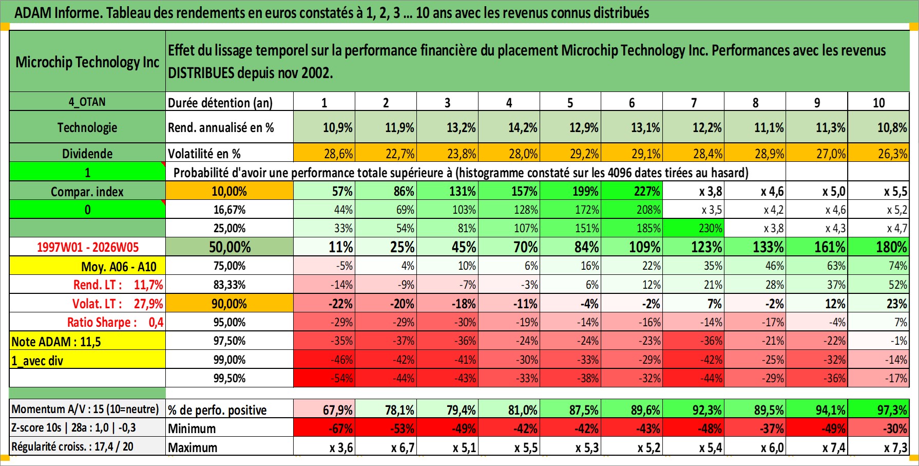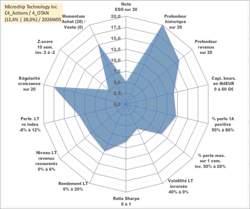 Site dédié aux investisseursPage dédiée sur site financeAnalyse des valorisations hebdomadaires de l'action Microchip Technology Inc. Cet actif est cote en USD. Les valorisations sont en contrevaleur EURO et couvrent les semaines 1997W01 a 2026W05. Les revenus de cet actif financier sont pris en compte depuis la semaine 2002W45. La note globale ESG de cet actif est estimee a 5.0 (apres rebasage entre 0 et 20).