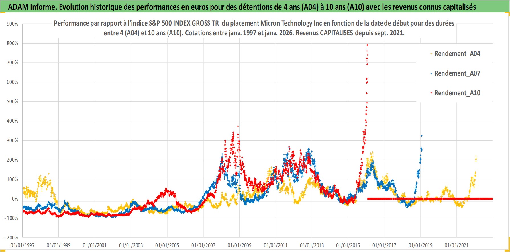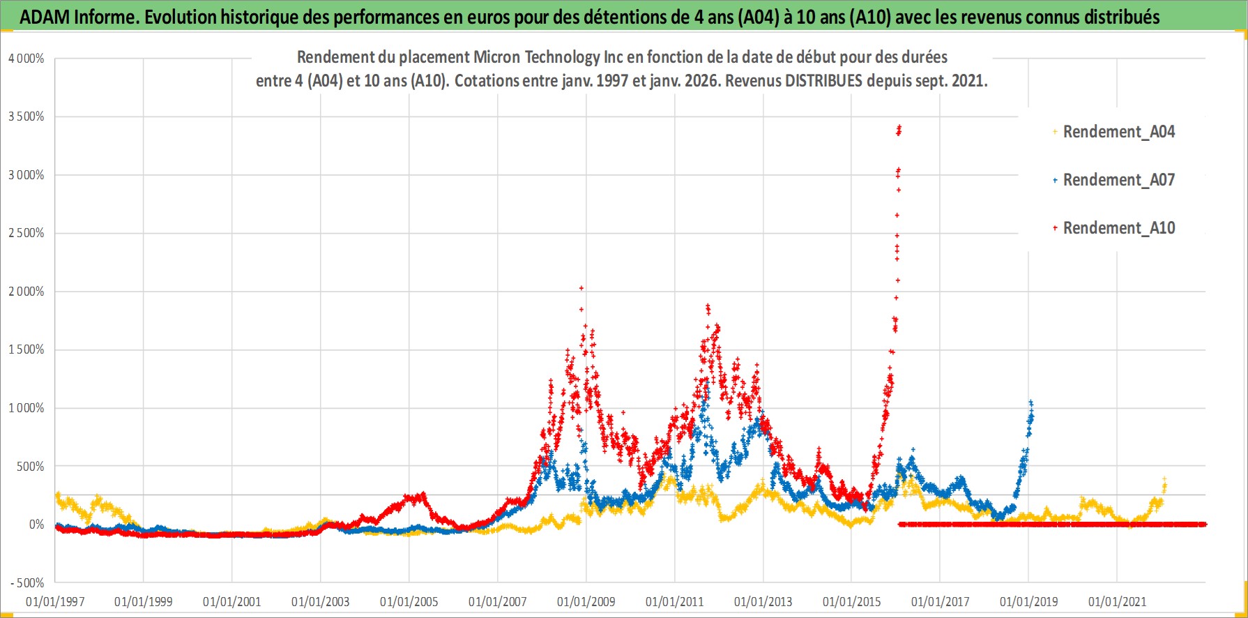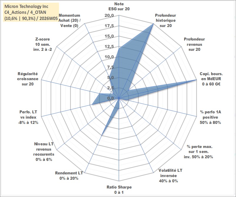 Site dédié aux investisseursPage dédiée sur site financeAnalyse des valorisations hebdomadaires de l'action Micron Technology Inc. Cet actif est cote en USD. Les valorisations sont en contrevaleur EURO et couvrent les semaines 1997W01 a 2026W05. Les revenus de cet actif financier sont pris en compte depuis la semaine 2021W39. La note globale ESG de cet actif est estimee a 12.0 (apres rebasage entre 0 et 20).