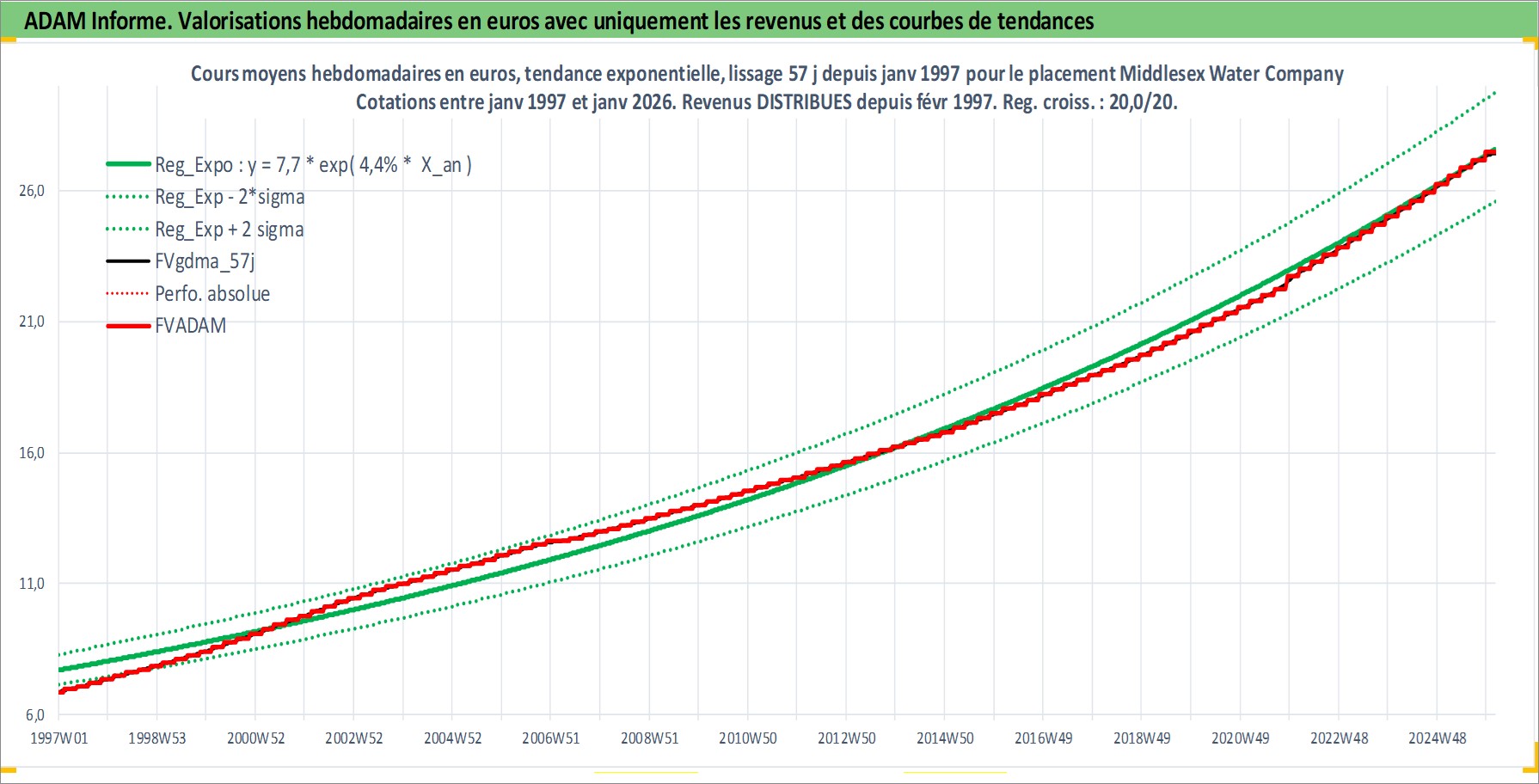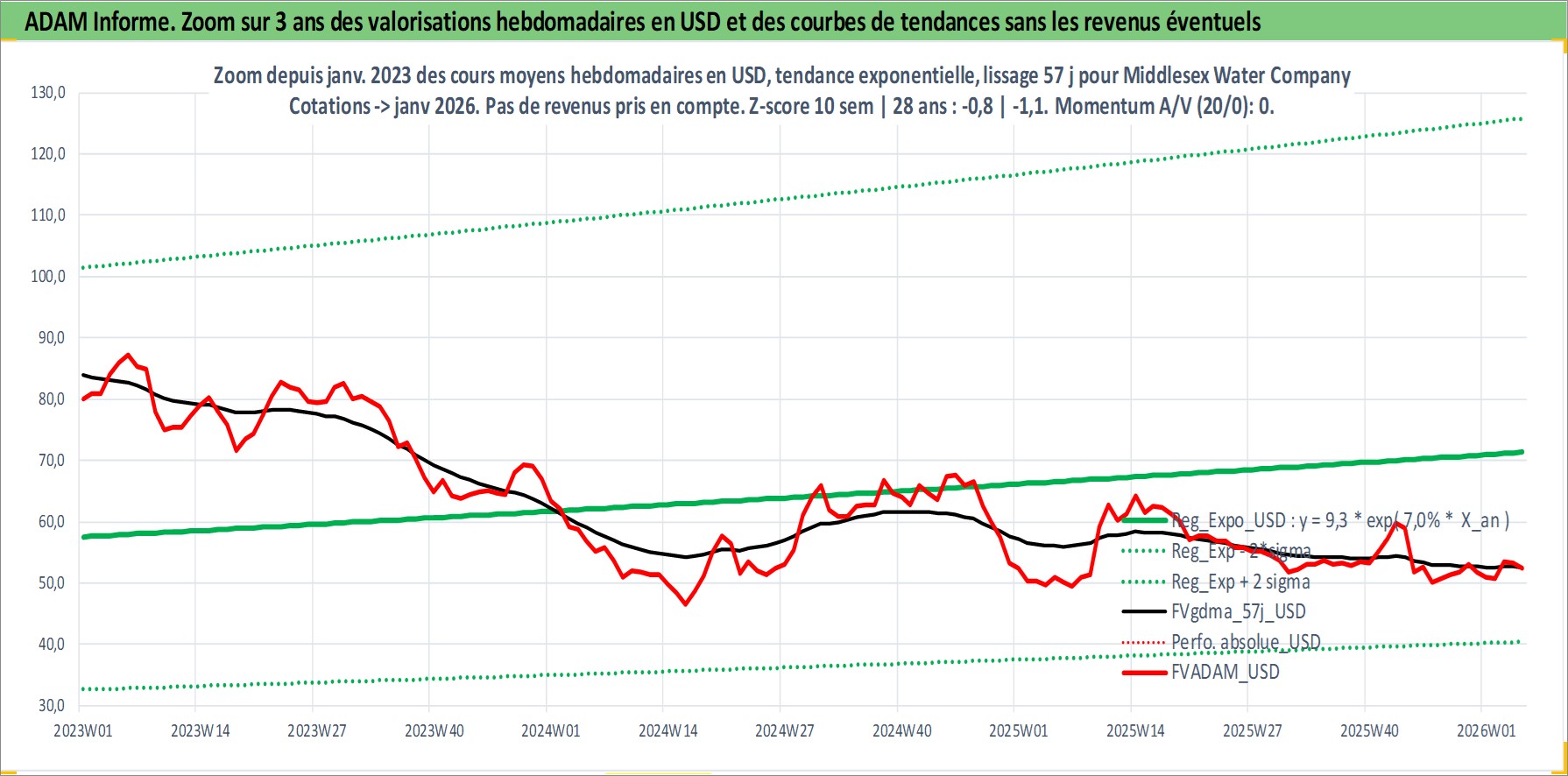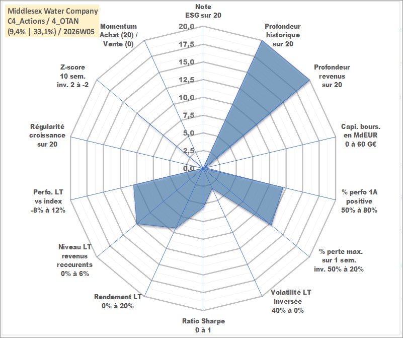Site dédié aux investisseursPage dédiée sur site financeAnalyse des valorisations hebdomadaires de l'action Middlesex Water Company. Cet actif est cote en USD. Les valorisations sont en contrevaleur EURO et couvrent les semaines 1997W01 a 2026W05. Les revenus de cet actif financier sont pris en compte depuis la semaine 1997W07. La note ESG de cet actif n'est pas connue.