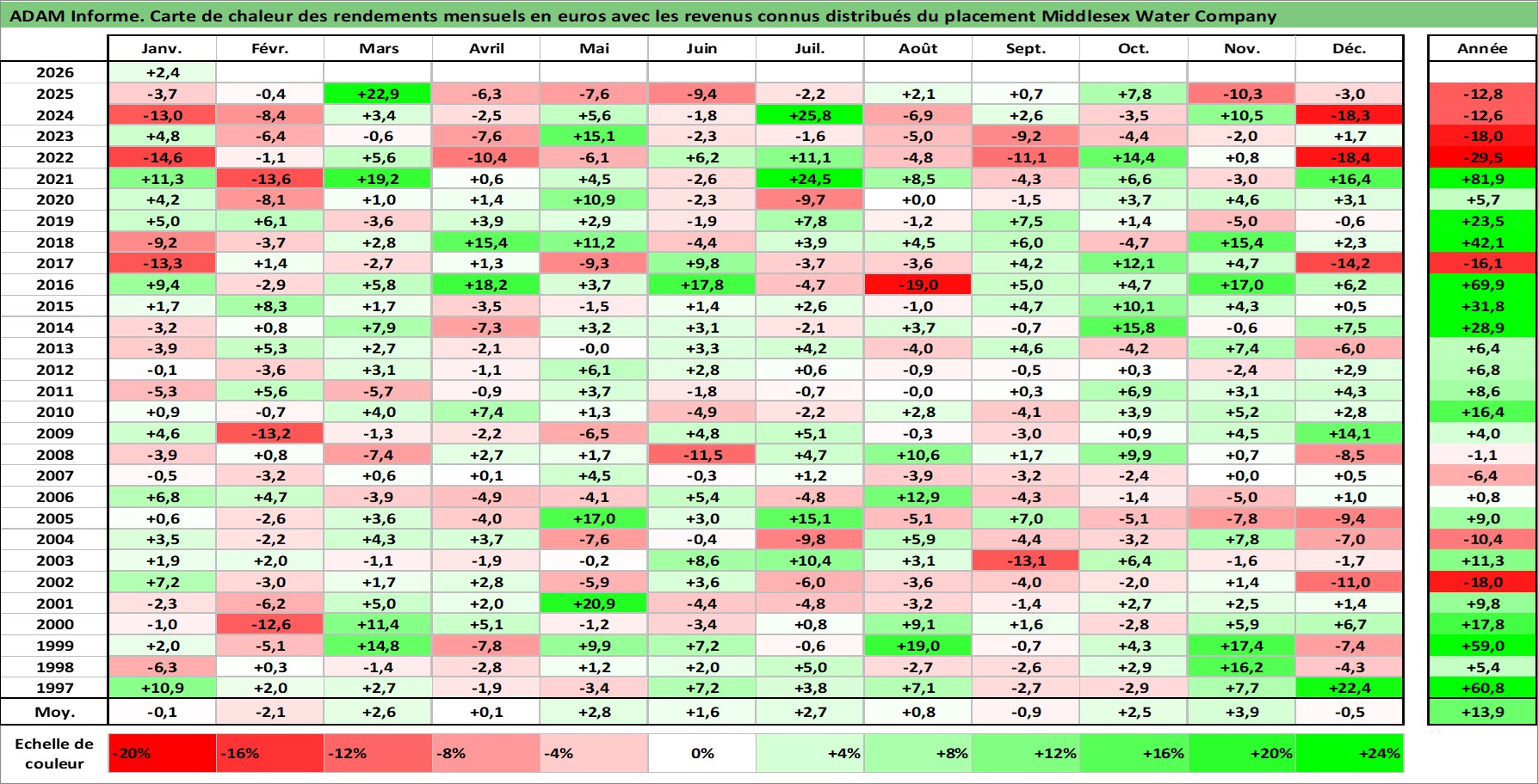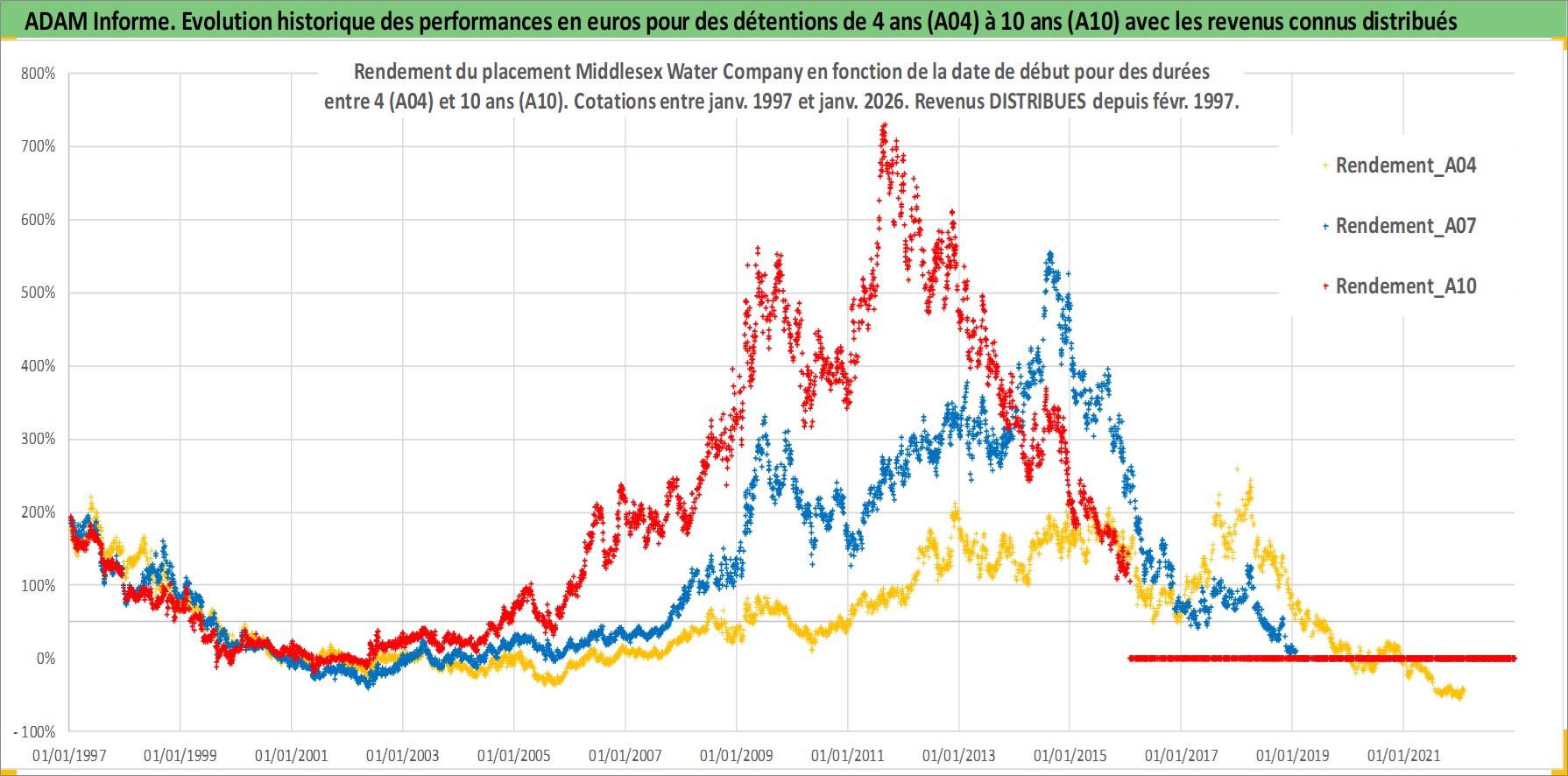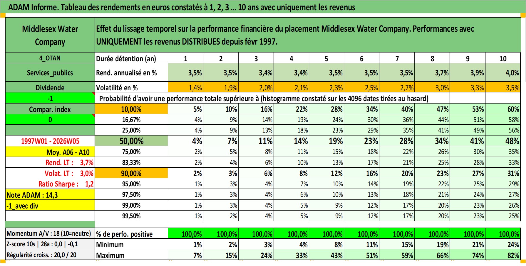 Site dédié aux investisseursPage dédiée sur site financeAnalyse des valorisations hebdomadaires de l'action Middlesex Water Company. Cet actif est cote en USD. Les valorisations sont en contrevaleur EURO et couvrent les semaines 1997W01 a 2026W05. Les revenus de cet actif financier sont pris en compte depuis la semaine 1997W07. La note ESG de cet actif n'est pas connue.