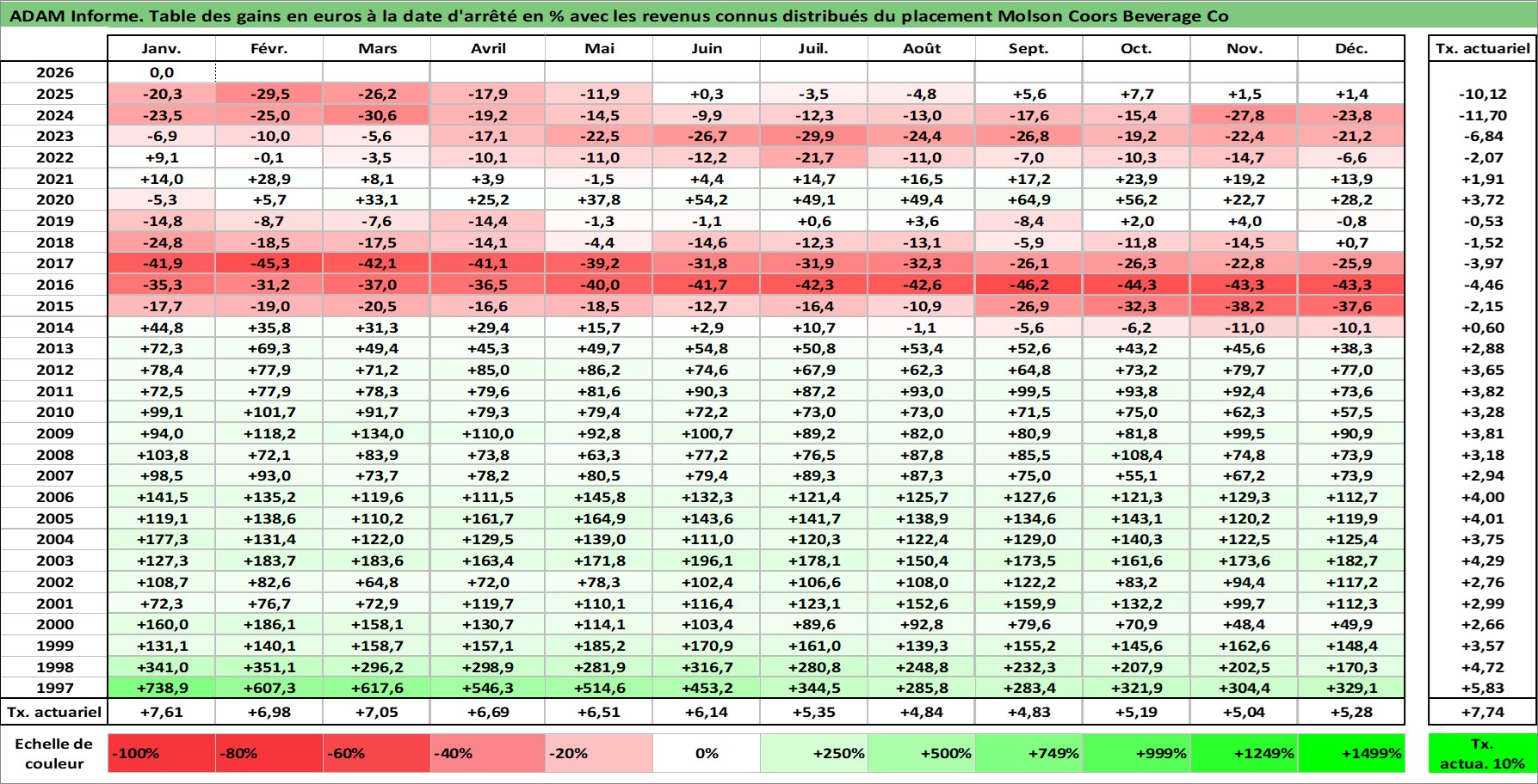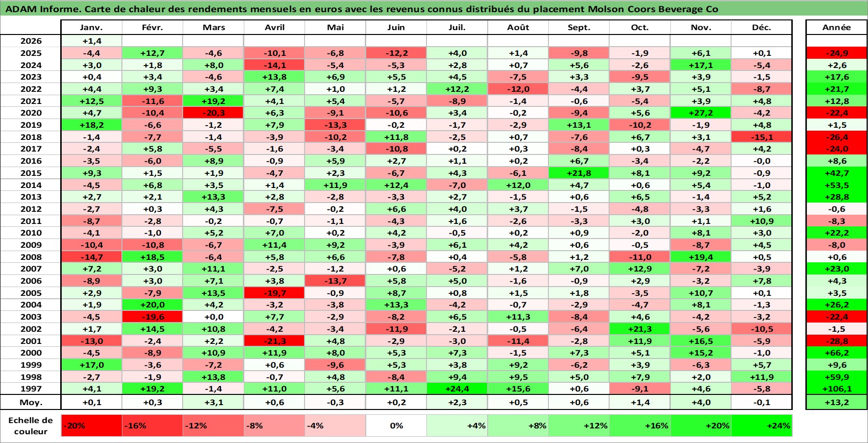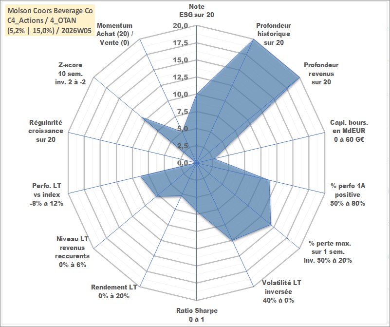 Site dédié aux investisseursPage dédiée sur site financeAnalyse des valorisations hebdomadaires de l'action Molson Coors Beverage Co. Cet actif est cote en USD. Les valorisations sont en contrevaleur EURO et couvrent les semaines 1997W01 a 2026W05. Les revenus de cet actif financier sont pris en compte depuis la semaine 1997W09. La note globale ESG de cet actif est estimee a 10.0 (apres rebasage entre 0 et 20).