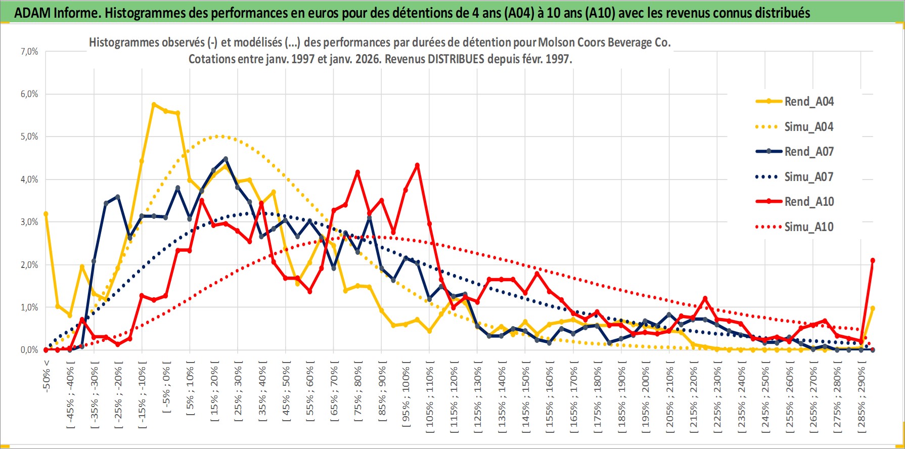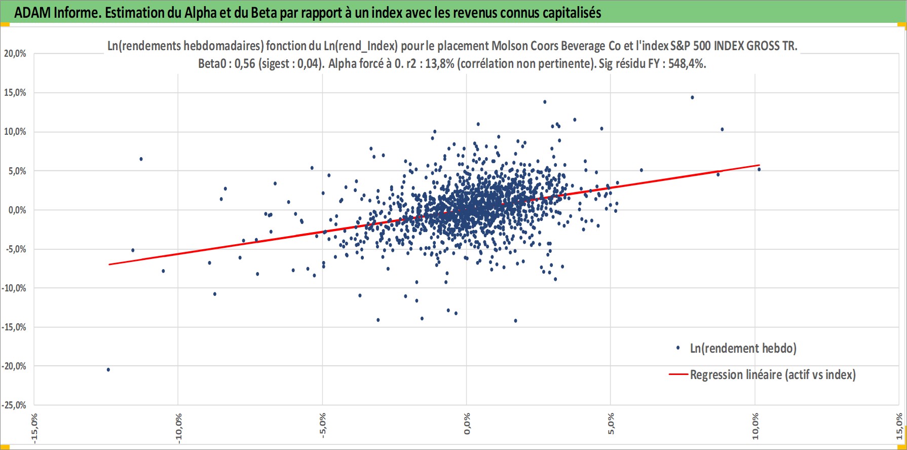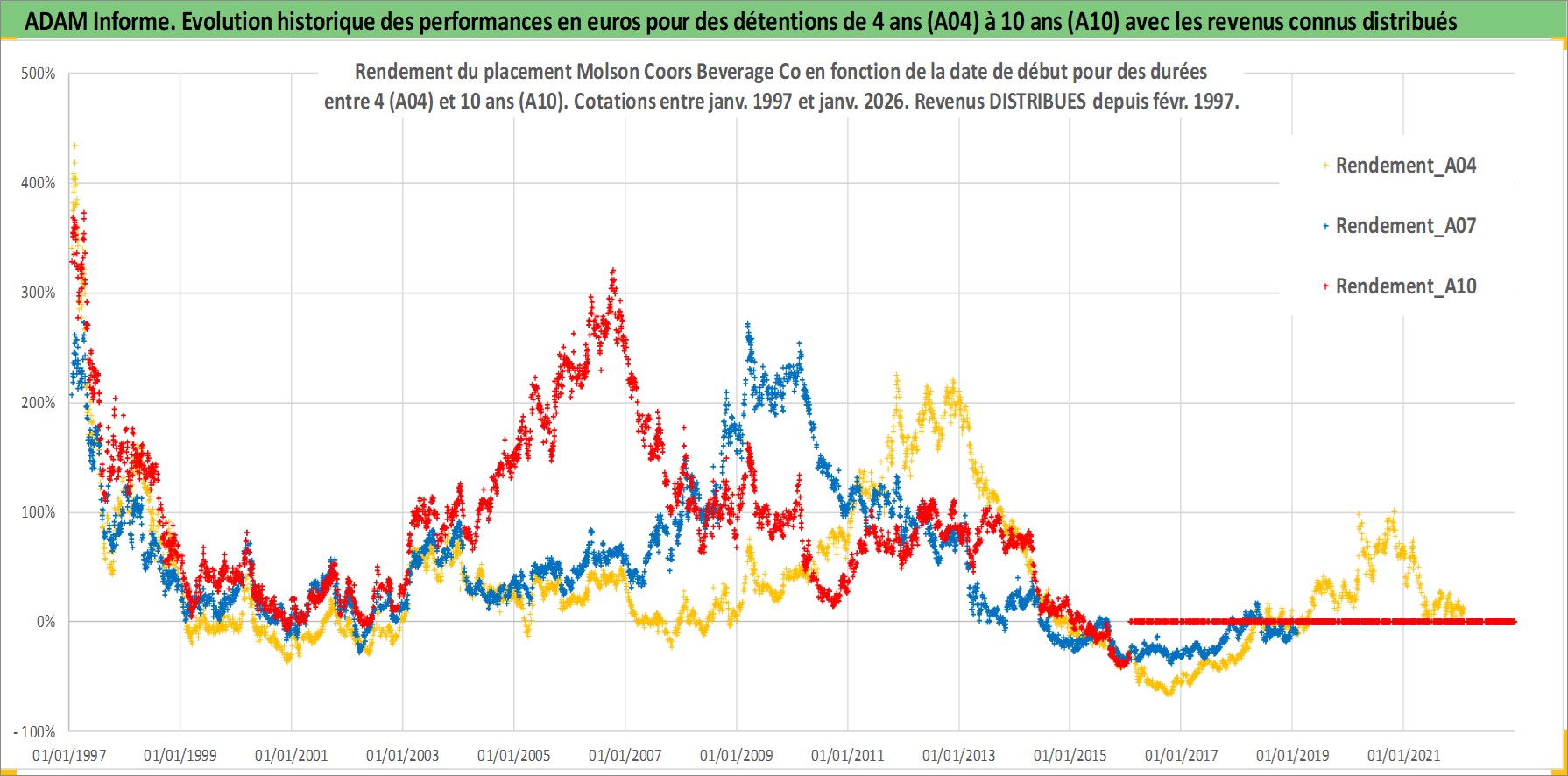 Site dédié aux investisseursPage dédiée sur site financeAnalyse des valorisations hebdomadaires de l'action Molson Coors Beverage Co. Cet actif est cote en USD. Les valorisations sont en contrevaleur EURO et couvrent les semaines 1997W01 a 2026W05. Les revenus de cet actif financier sont pris en compte depuis la semaine 1997W09. La note globale ESG de cet actif est estimee a 10.0 (apres rebasage entre 0 et 20).