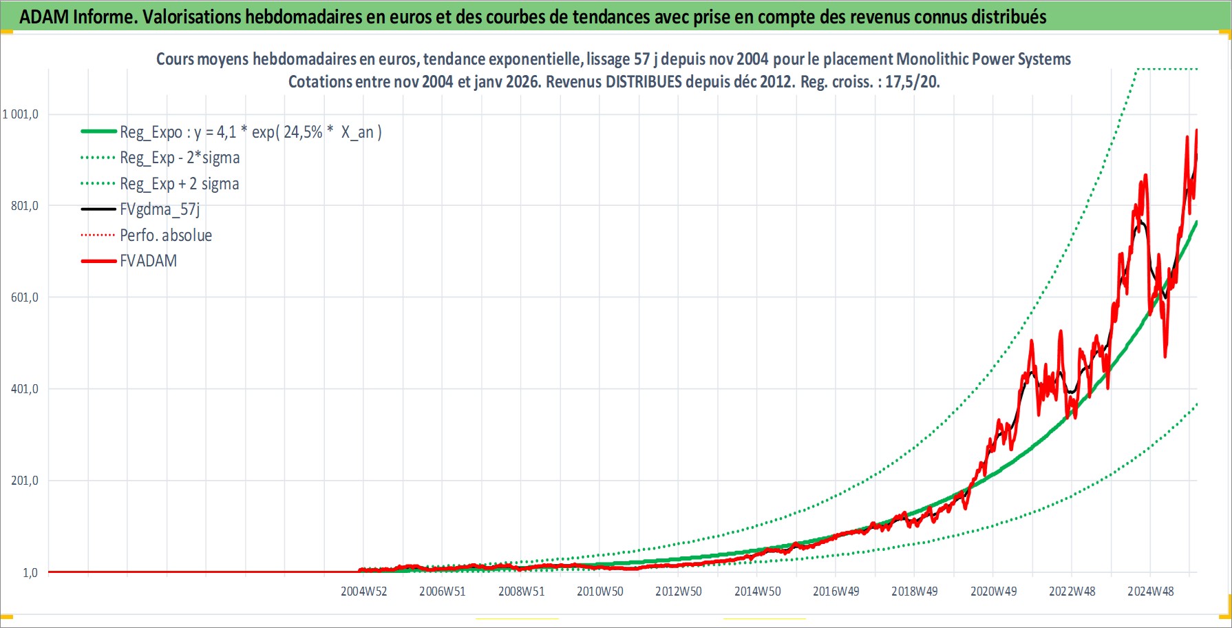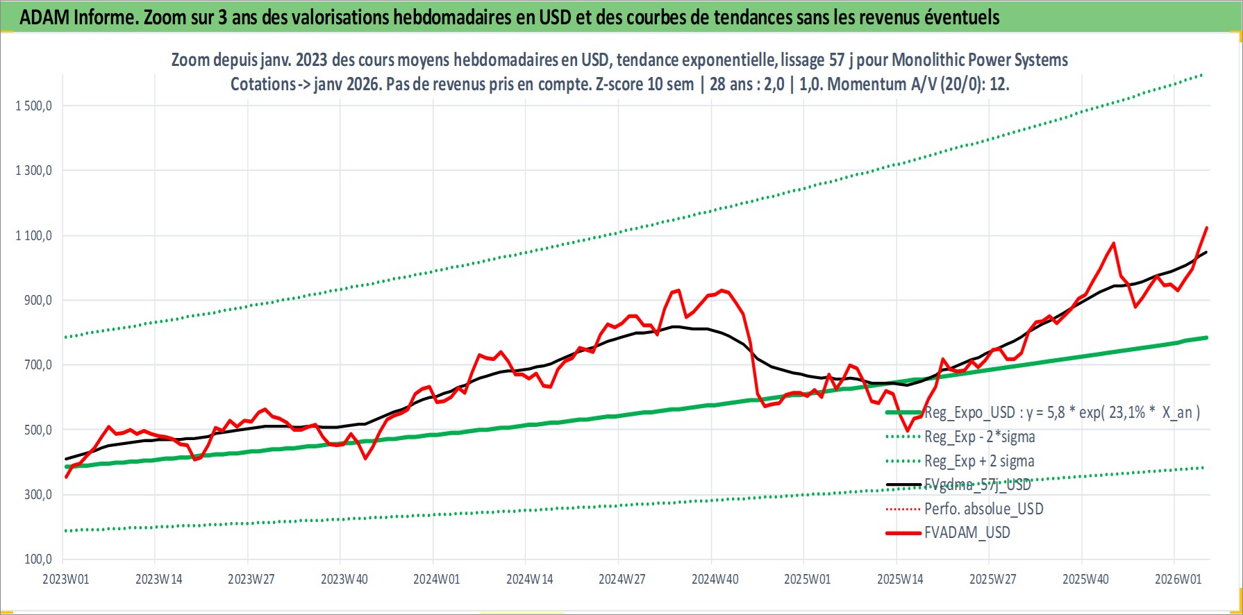 Site dédié aux investisseursPage dédiée sur site financeAnalyse des valorisations hebdomadaires de l'action Monolithic Power Systems Inc. Cet actif est cote en USD. Les valorisations sont en contrevaleur EURO et couvrent les semaines 2004W47 a 2026W05. Les revenus de cet actif financier sont pris en compte depuis la semaine 2012W51. La note ESG de cet actif n'est pas connue.