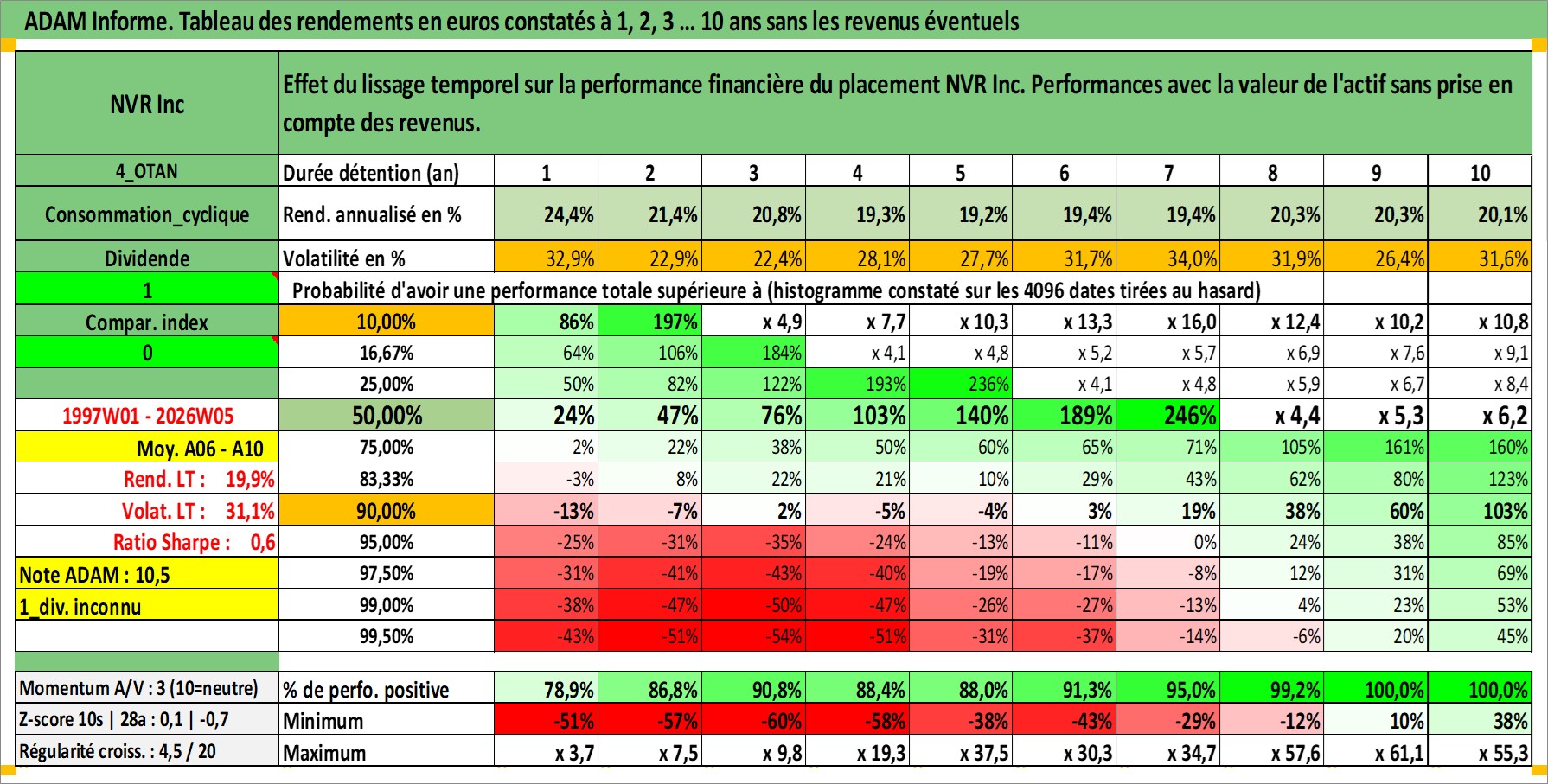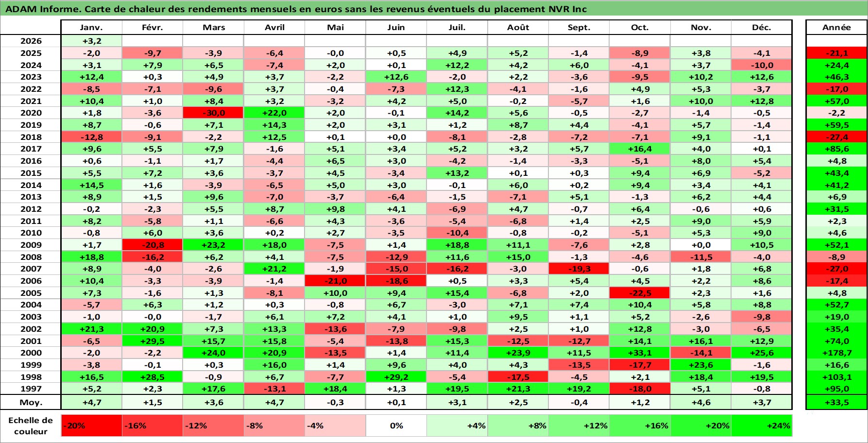 Site dédié aux investisseursPage dédiée sur site financeAnalyse des valorisations hebdomadaires de l'action NVR Inc. Cet actif est cote en USD. Les valorisations sont en contrevaleur EURO et couvrent les semaines 1997W01 a 2026W05. Les revenus de cet actif financier ne sont pas connus car non existants ou non disponibles sur le site Yahoo Finance. La note globale ESG de cet actif est estimee a 10.0 (apres rebasage entre 0 et 20).