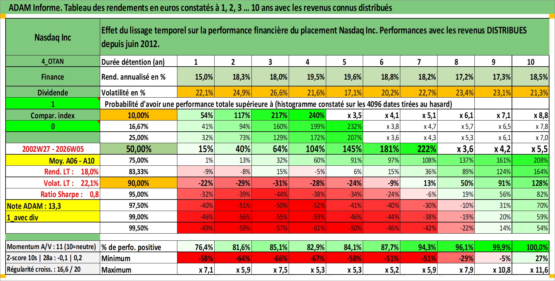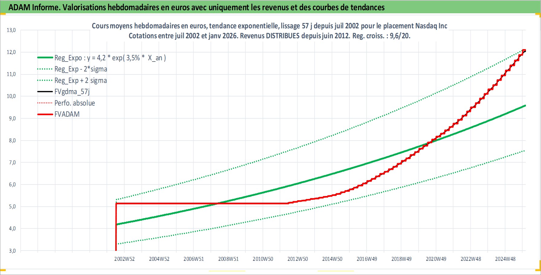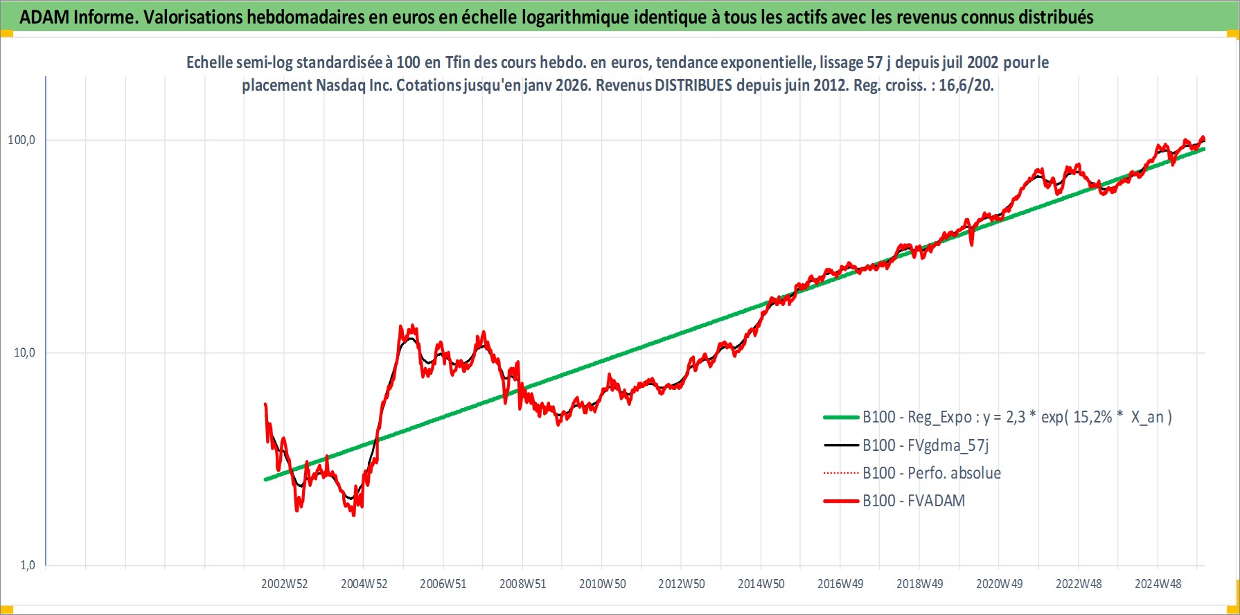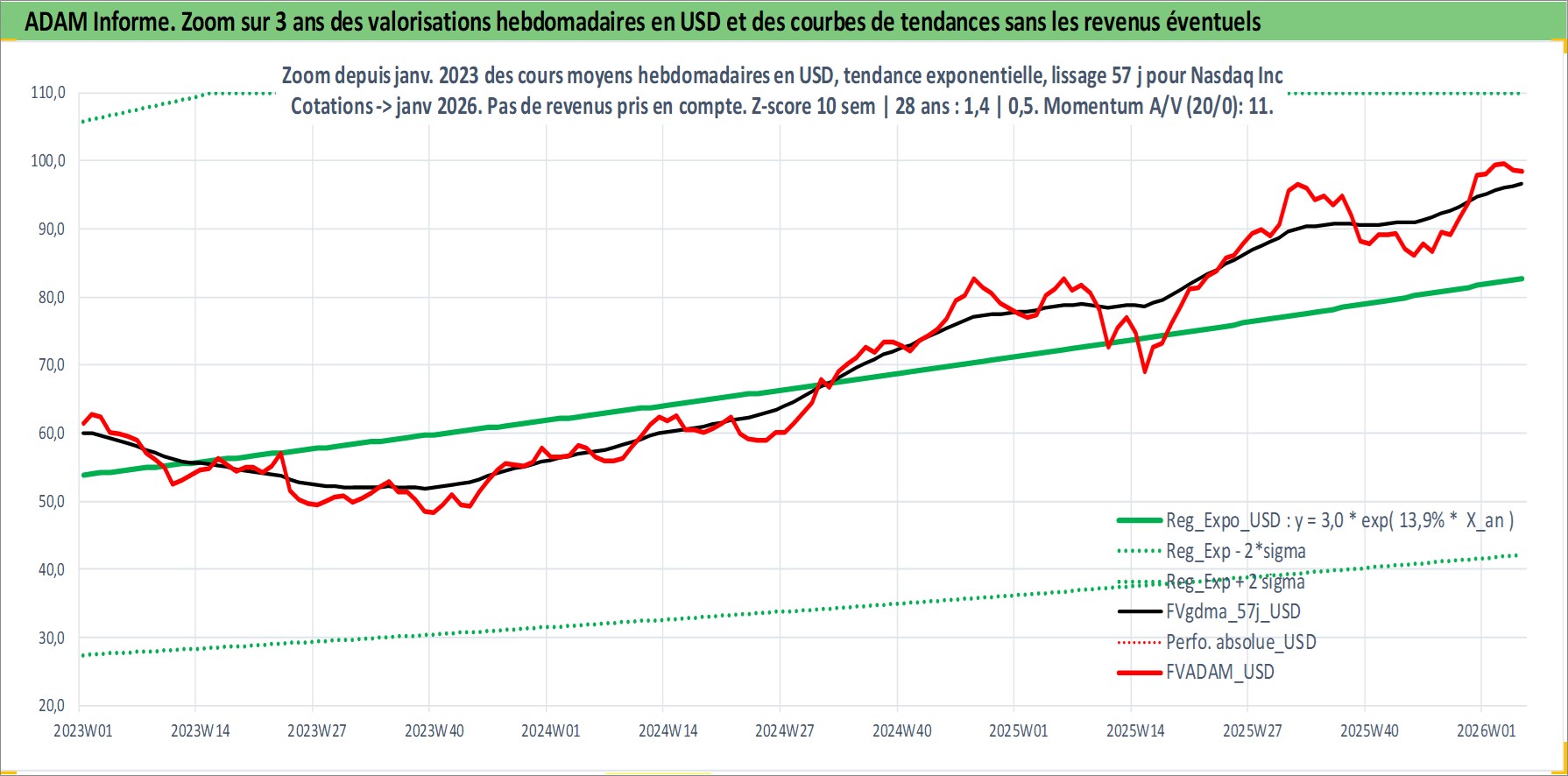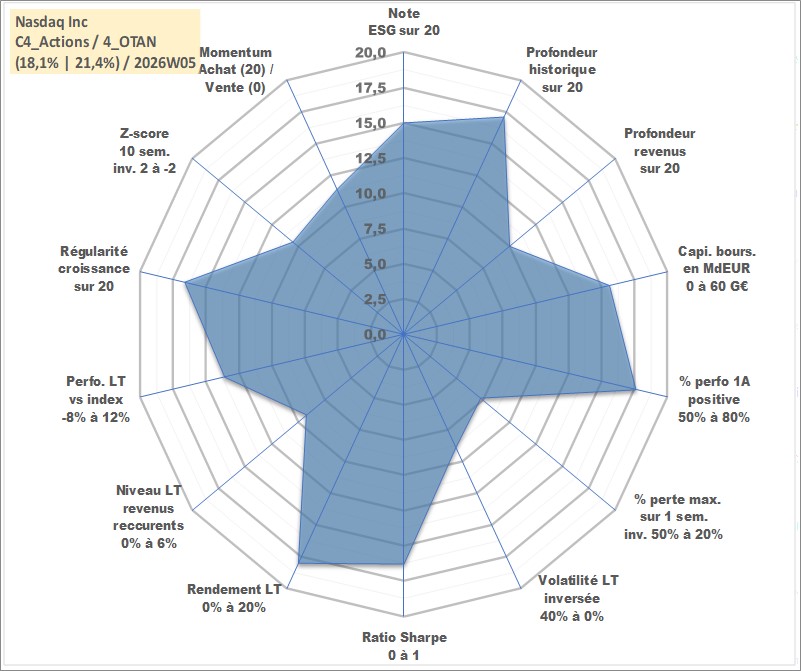 Site dédié aux investisseursPage dédiée sur site financeAnalyse des valorisations hebdomadaires de l'action Nasdaq Inc. Cet actif est cote en USD. Les valorisations sont en contrevaleur EURO et couvrent les semaines 2002W27 a 2026W05. Les revenus de cet actif financier sont pris en compte depuis la semaine 2012W24. La note globale ESG de cet actif est estimee a 15.0 (apres rebasage entre 0 et 20).