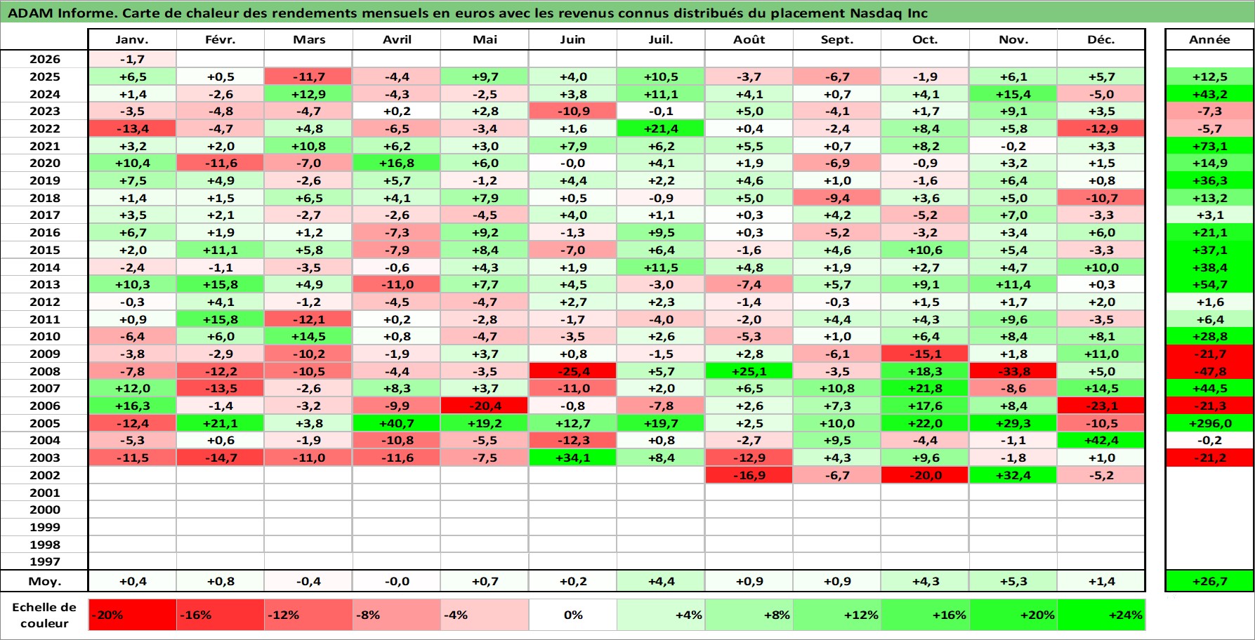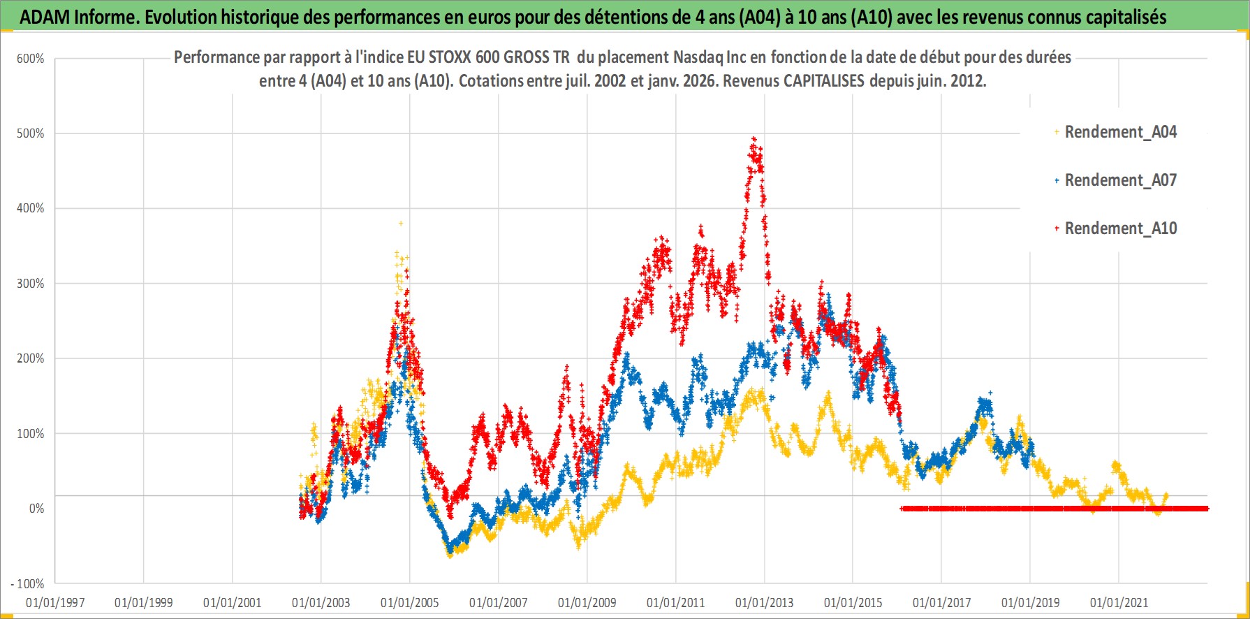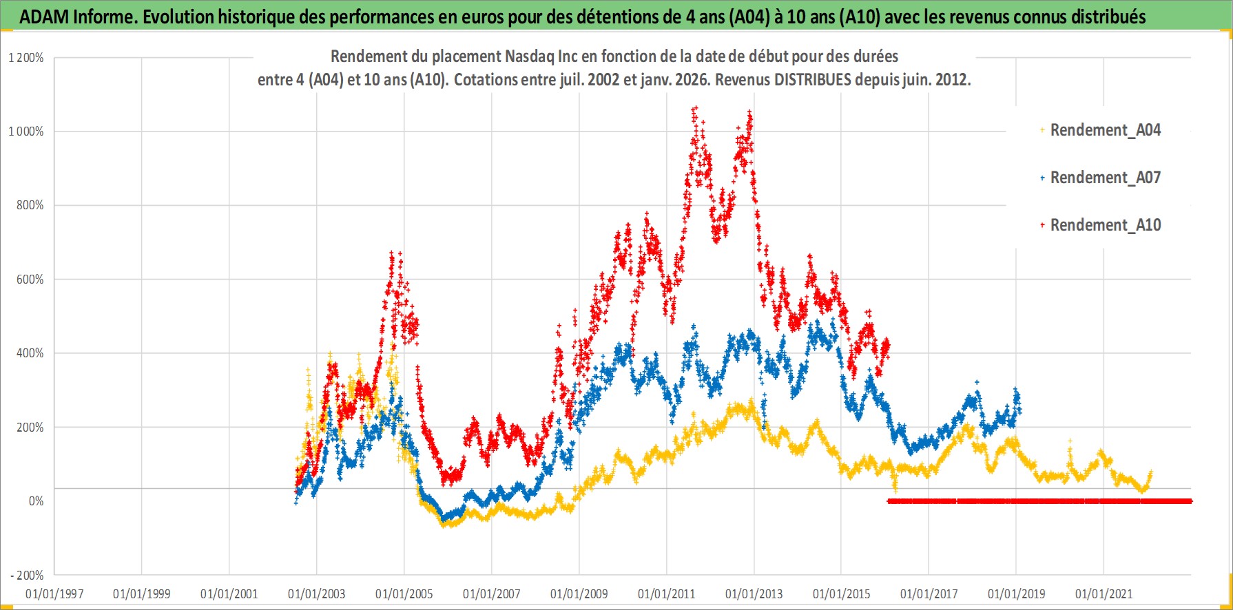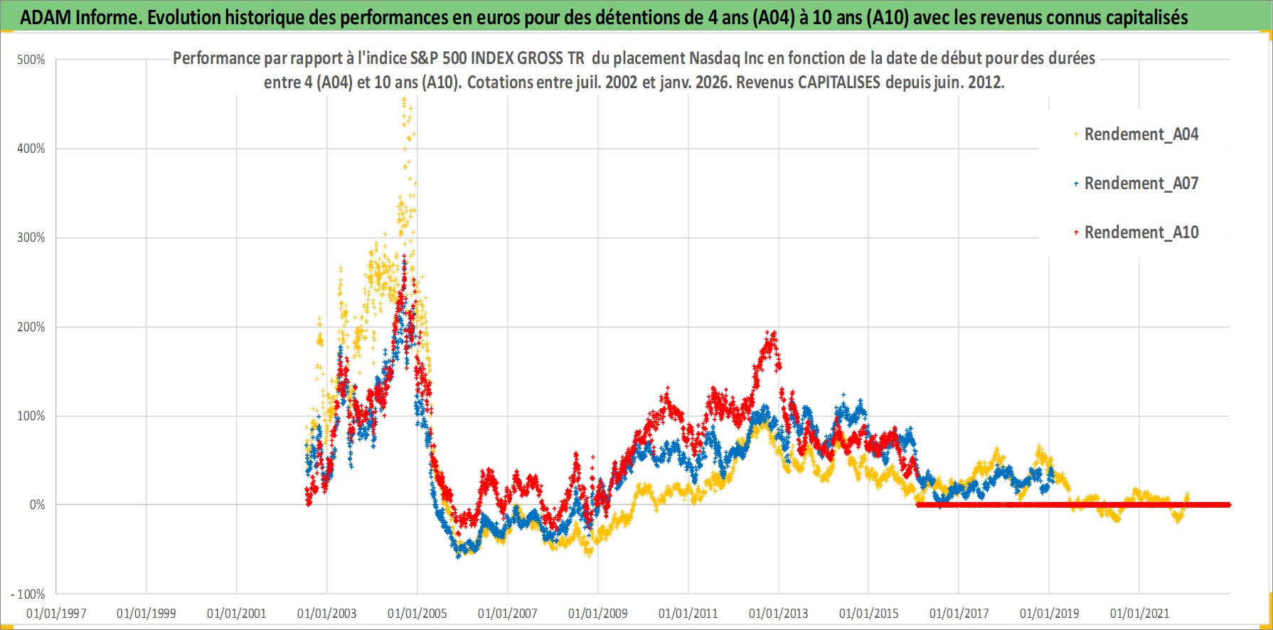 Site dédié aux investisseursPage dédiée sur site financeAnalyse des valorisations hebdomadaires de l'action Nasdaq Inc. Cet actif est cote en USD. Les valorisations sont en contrevaleur EURO et couvrent les semaines 2002W27 a 2026W05. Les revenus de cet actif financier sont pris en compte depuis la semaine 2012W24. La note globale ESG de cet actif est estimee a 15.0 (apres rebasage entre 0 et 20).