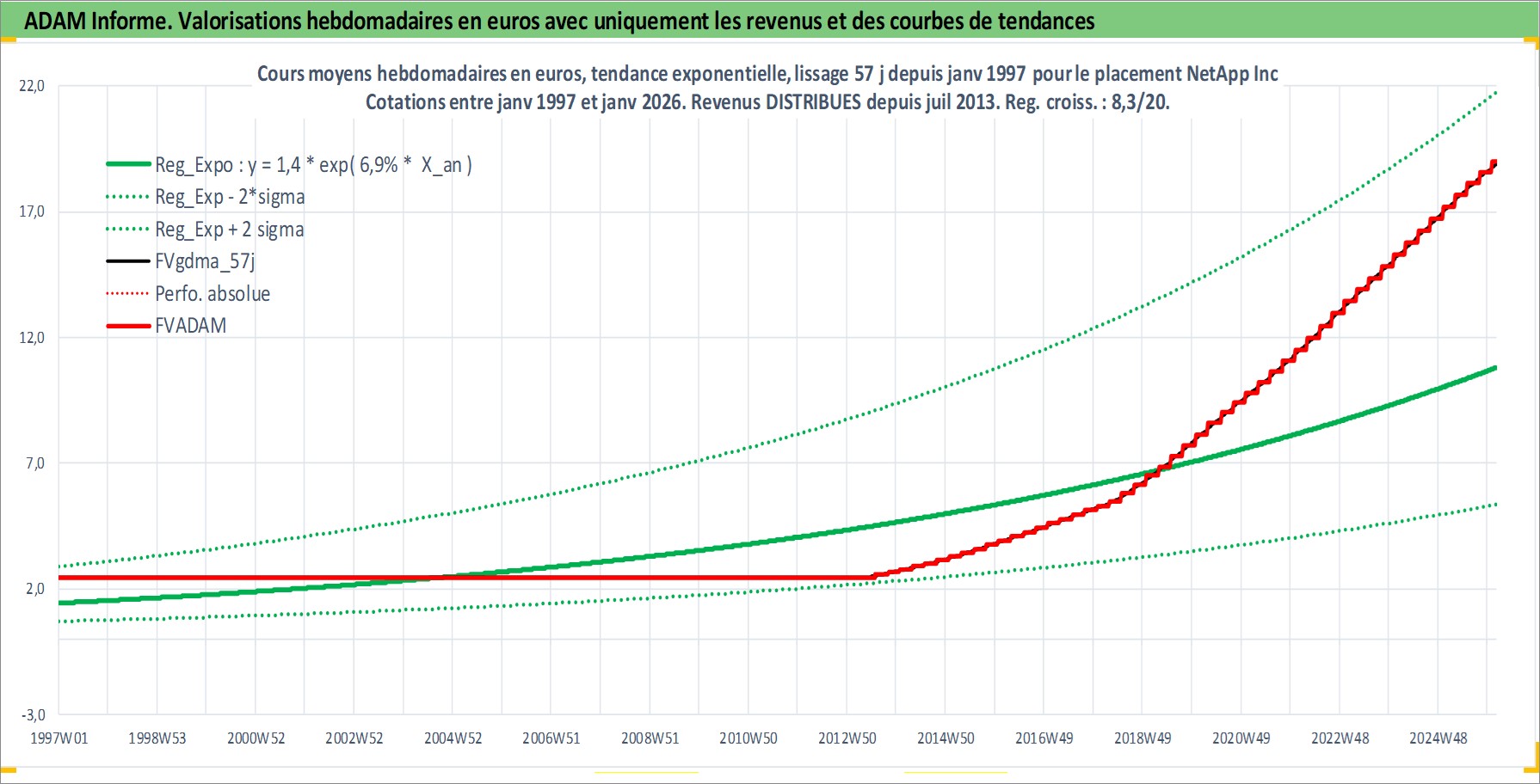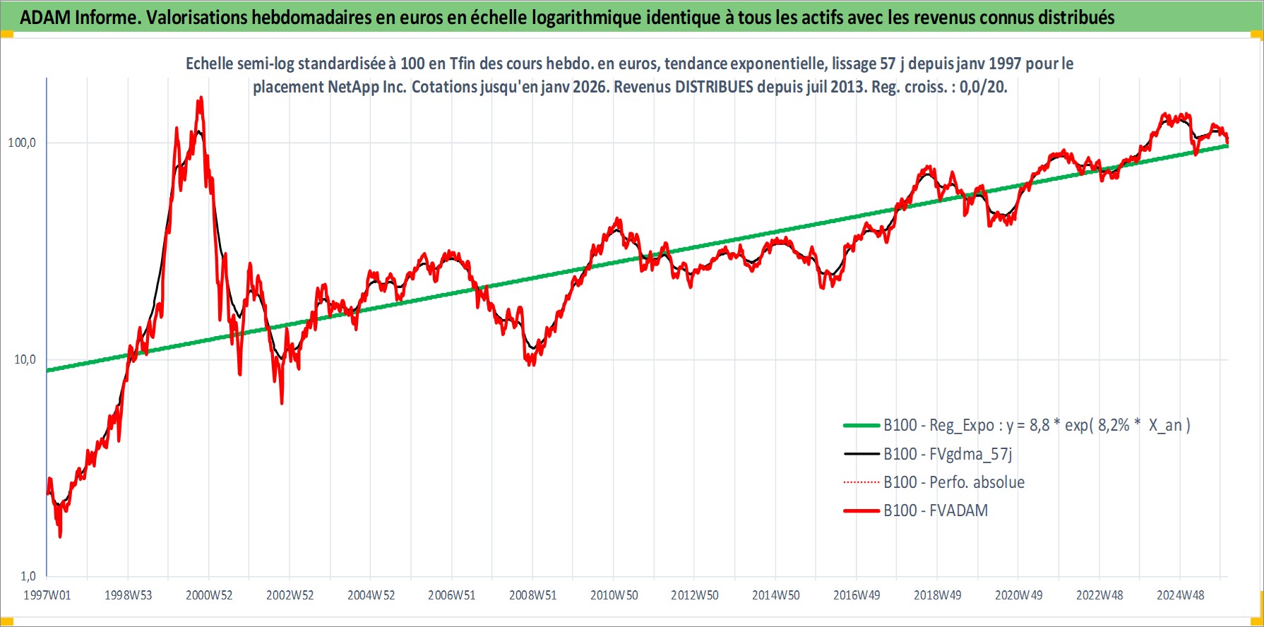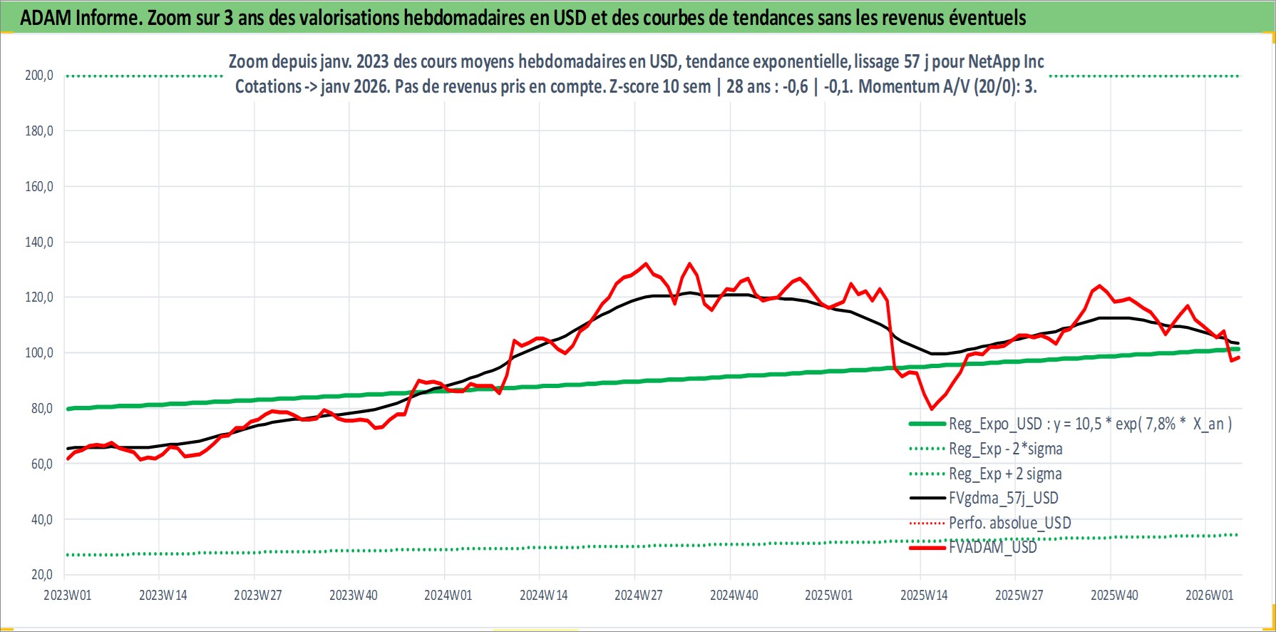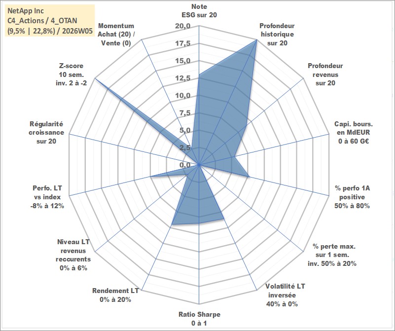 Site dédié aux investisseursPage dédiée sur site financeAnalyse des valorisations hebdomadaires de l'action NetApp Inc. Cet actif est cote en USD. Les valorisations sont en contrevaleur EURO et couvrent les semaines 1997W01 a 2026W05. Les revenus de cet actif financier sont pris en compte depuis la semaine 2013W28. La note globale ESG de cet actif est estimee a 13.0 (apres rebasage entre 0 et 20).
