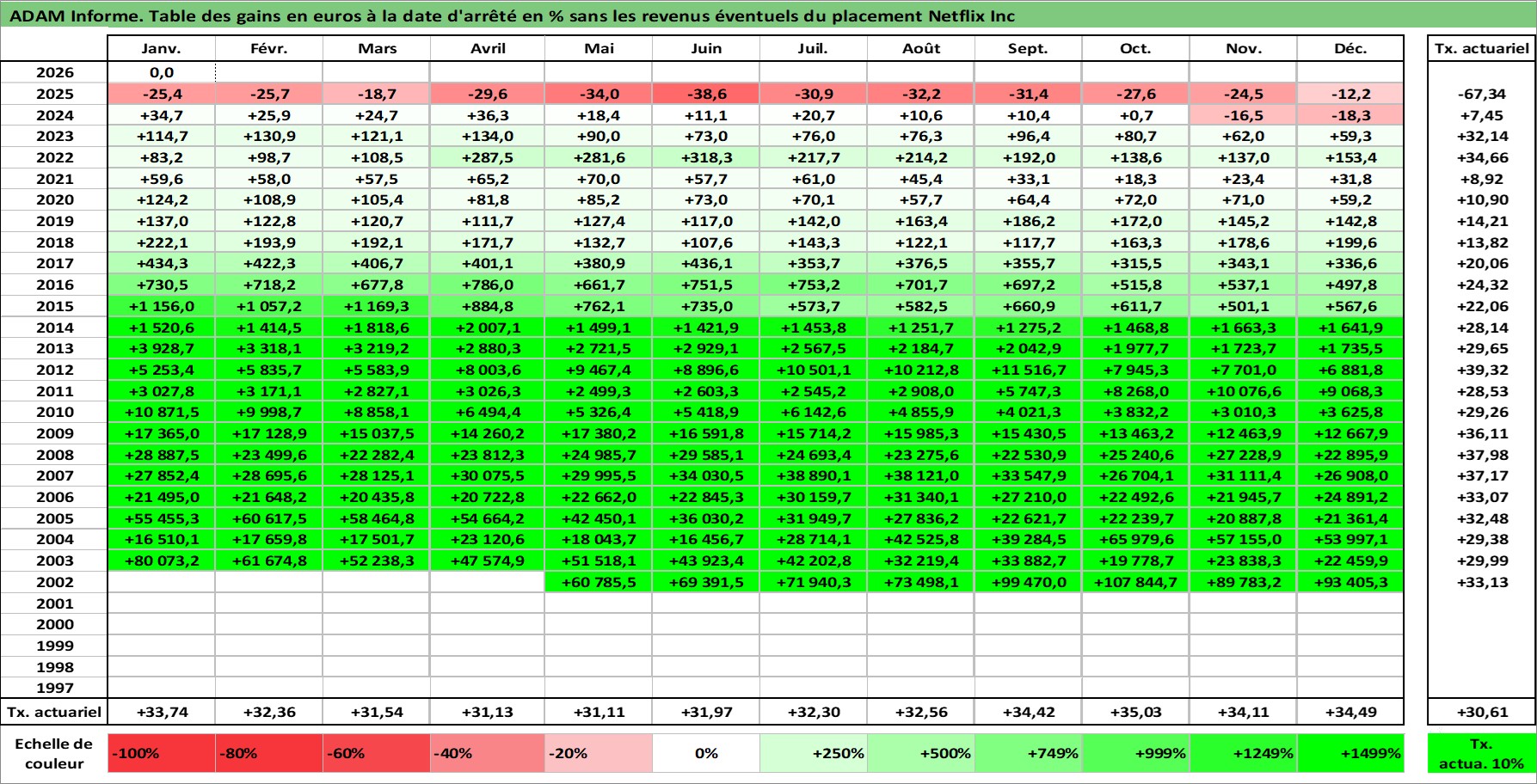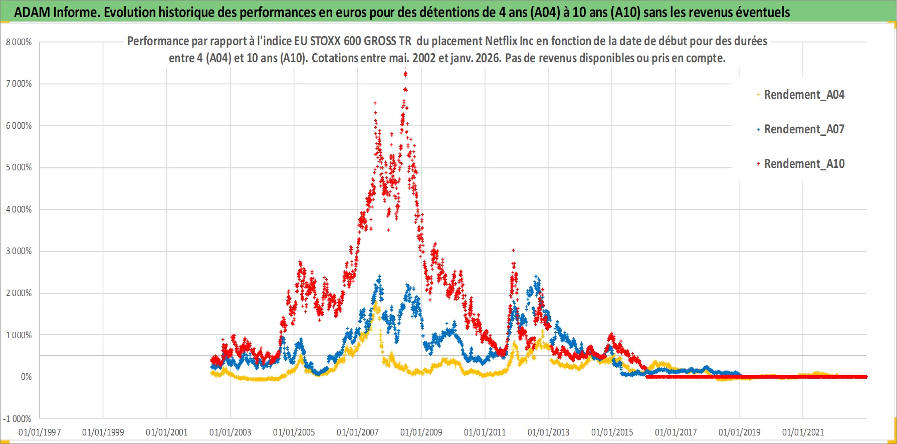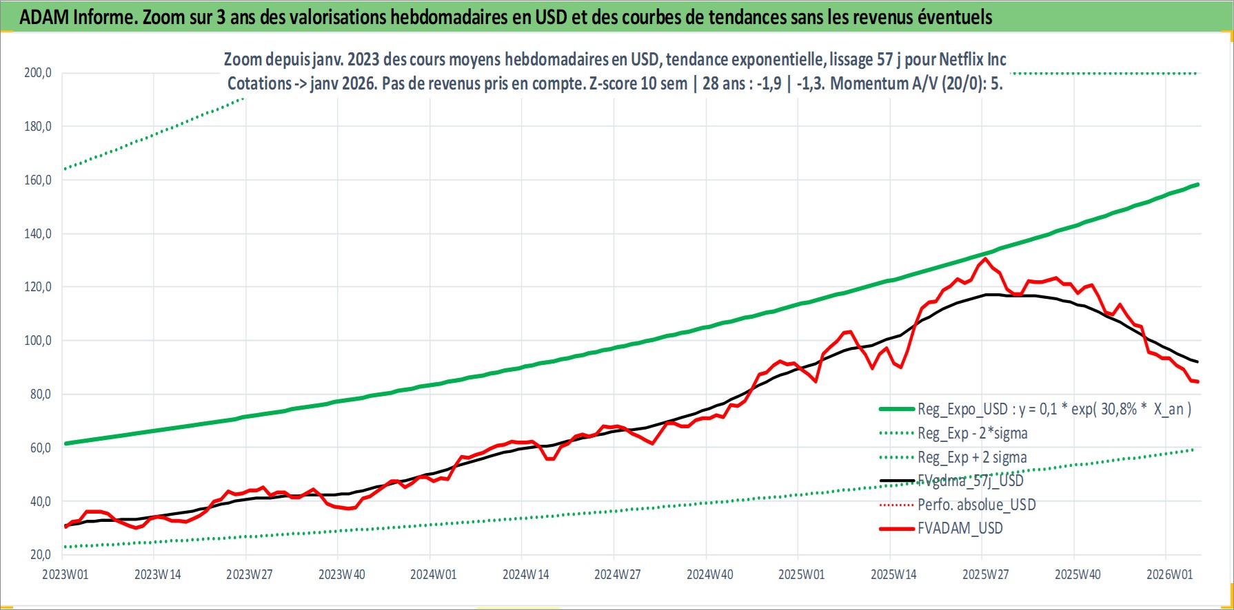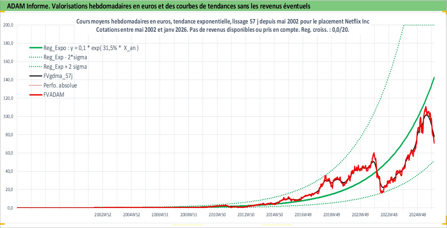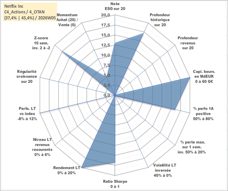 Site dédié aux investisseursPage dédiée sur site financeAnalyse des valorisations hebdomadaires de l'action Netflix Inc. Cet actif est cote en USD. Les valorisations sont en contrevaleur EURO et couvrent les semaines 2002W21 a 2026W05. Les revenus de cet actif financier ne sont pas connus car non existants ou non disponibles sur le site Yahoo Finance. La note globale ESG de cet actif est estimee a 13.0 (apres rebasage entre 0 et 20).