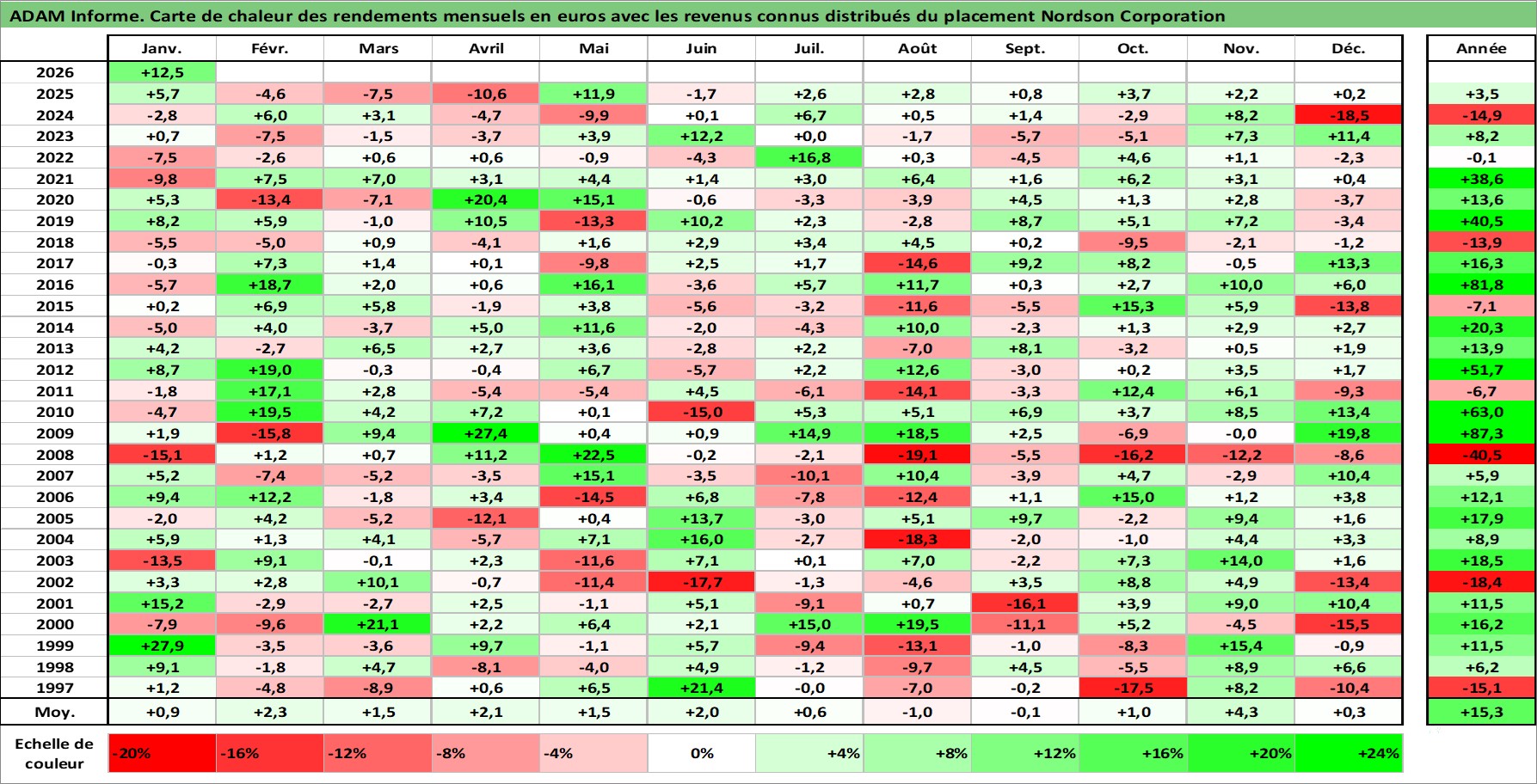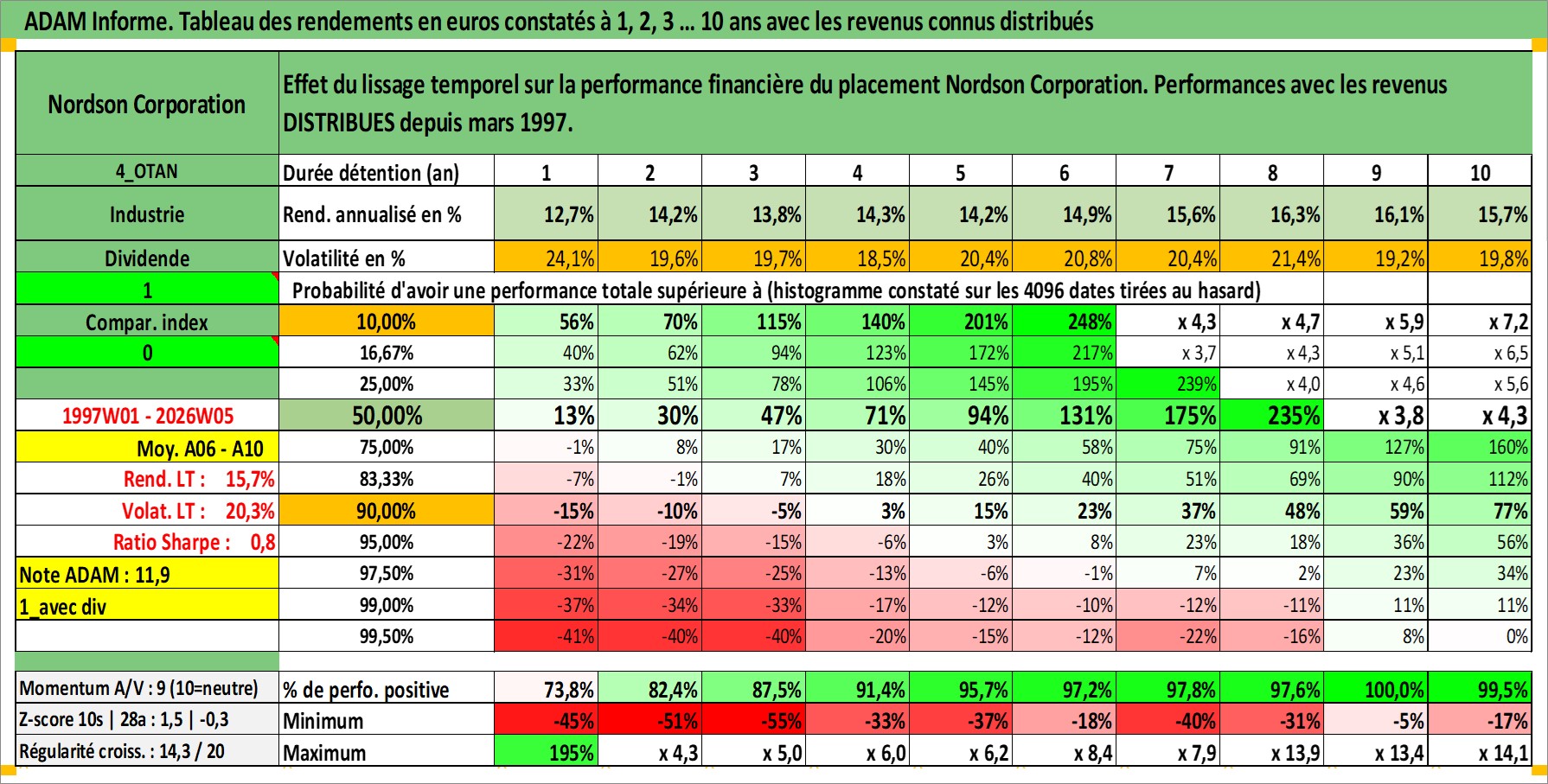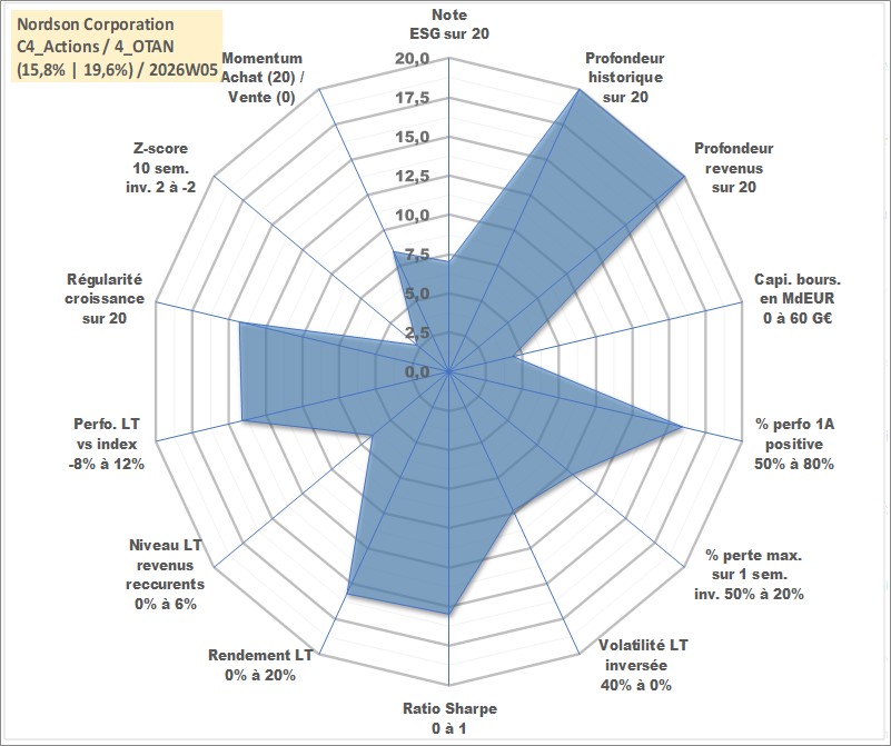 Site dédié aux investisseursPage dédiée sur site financeAnalyse des valorisations hebdomadaires de l'action Nordson Corporation. Cet actif est cote en USD. Les valorisations sont en contrevaleur EURO et couvrent les semaines 1997W01 a 2026W05. Les revenus de cet actif financier sont pris en compte depuis la semaine 1997W10. La note globale ESG de cet actif est estimee a 7.0 (apres rebasage entre 0 et 20).