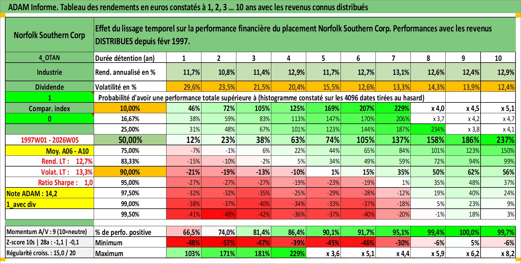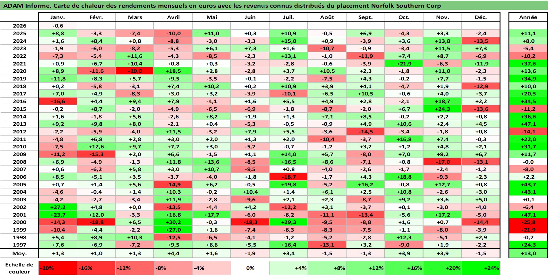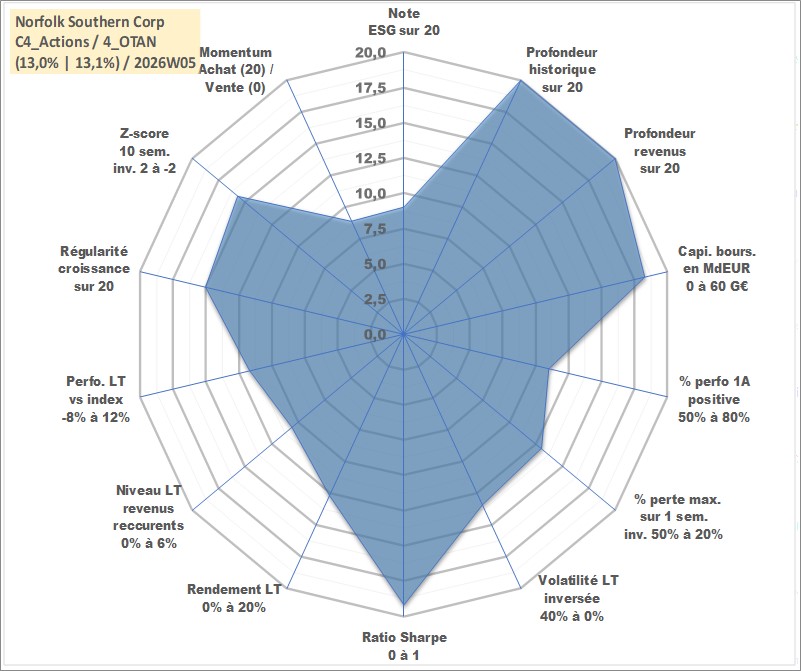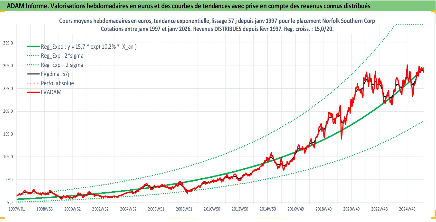 Site dédié aux investisseursPage dédiée sur site financeAnalyse des valorisations hebdomadaires de l'action Norfolk Southern Corp. Cet actif est cote en USD. Les valorisations sont en contrevaleur EURO et couvrent les semaines 1997W01 a 2026W05. Les revenus de cet actif financier sont pris en compte depuis la semaine 1997W06. La note globale ESG de cet actif est estimee a 9.0 (apres rebasage entre 0 et 20).