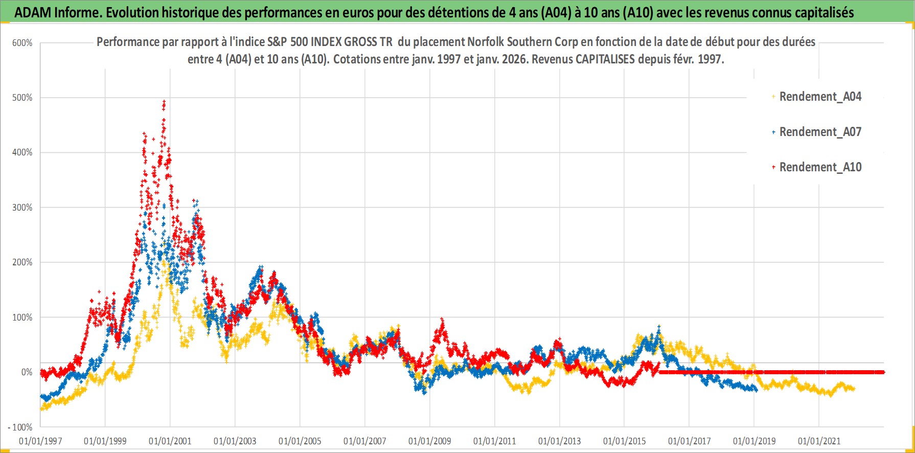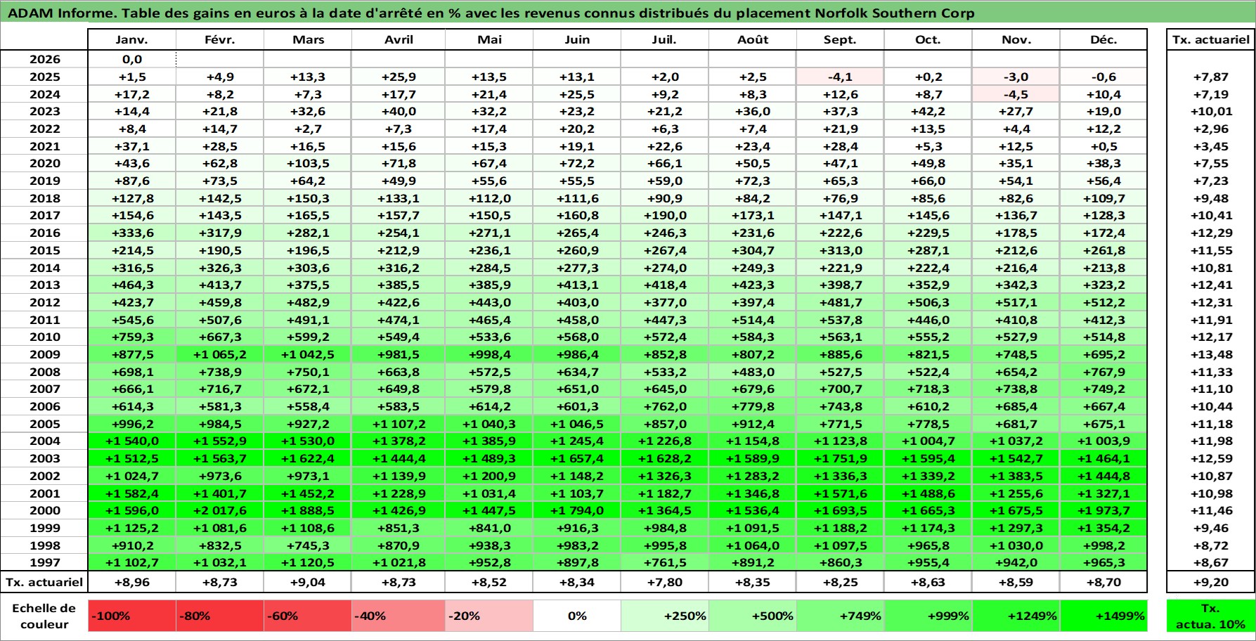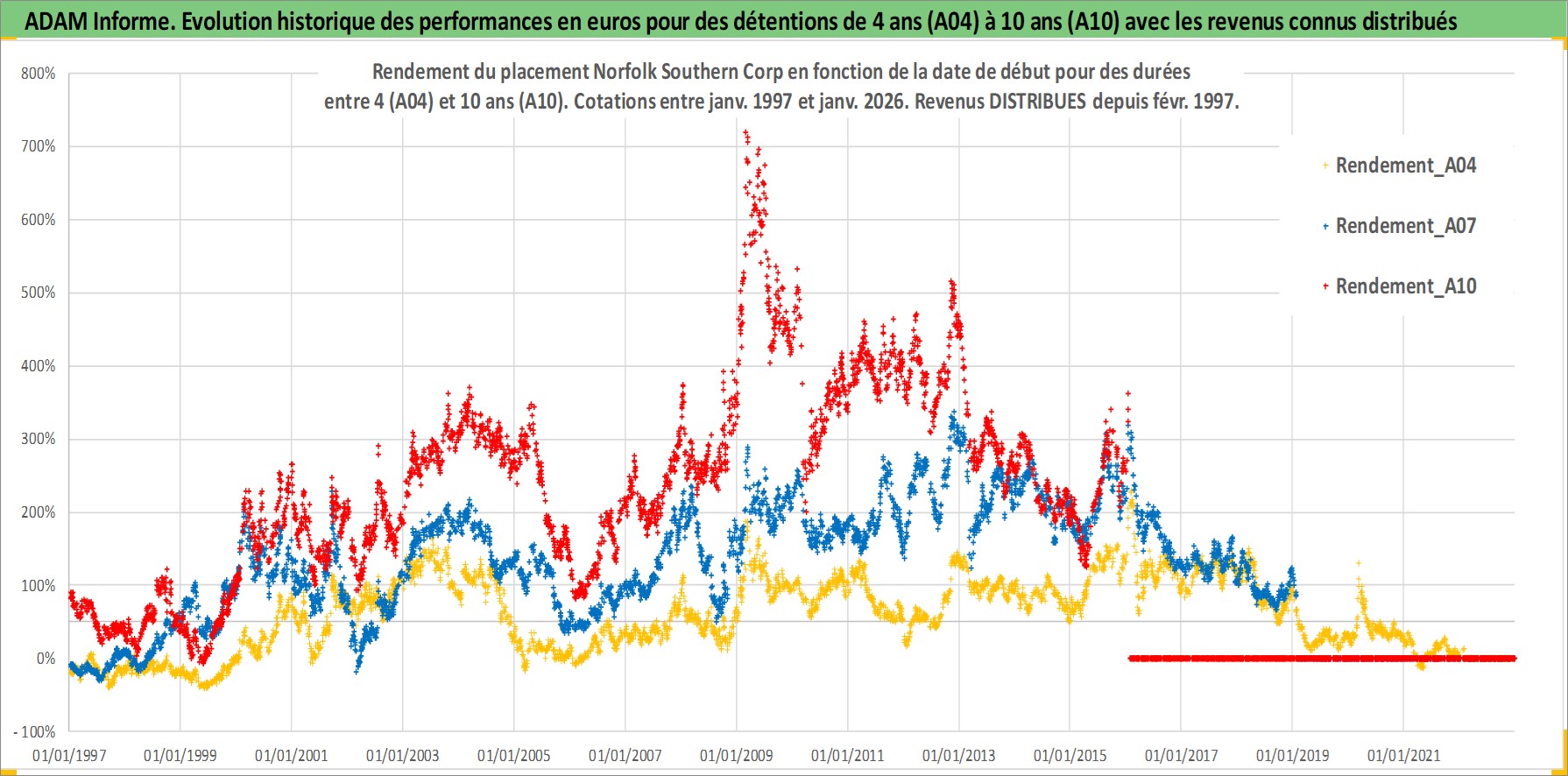 Site dédié aux investisseursPage dédiée sur site financeAnalyse des valorisations hebdomadaires de l'action Norfolk Southern Corp. Cet actif est cote en USD. Les valorisations sont en contrevaleur EURO et couvrent les semaines 1997W01 a 2026W05. Les revenus de cet actif financier sont pris en compte depuis la semaine 1997W06. La note globale ESG de cet actif est estimee a 9.0 (apres rebasage entre 0 et 20).