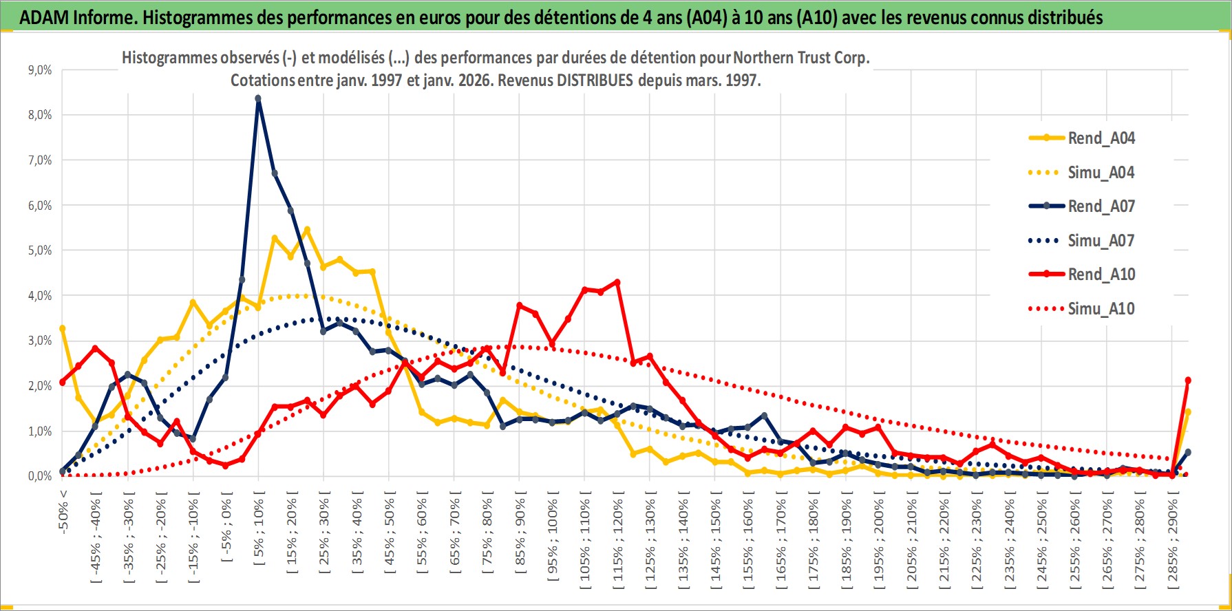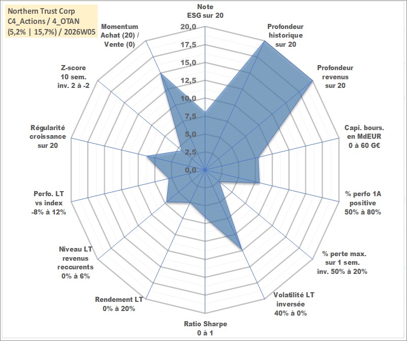 Site dédié aux investisseursPage dédiée sur site financeAnalyse des valorisations hebdomadaires de l'action Northern Trust Corp. Cet actif est cote en USD. Les valorisations sont en contrevaleur EURO et couvrent les semaines 1997W01 a 2026W05. Les revenus de cet actif financier sont pris en compte depuis la semaine 1997W10. La note globale ESG de cet actif est estimee a 8.0 (apres rebasage entre 0 et 20).