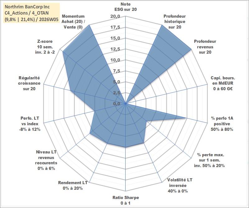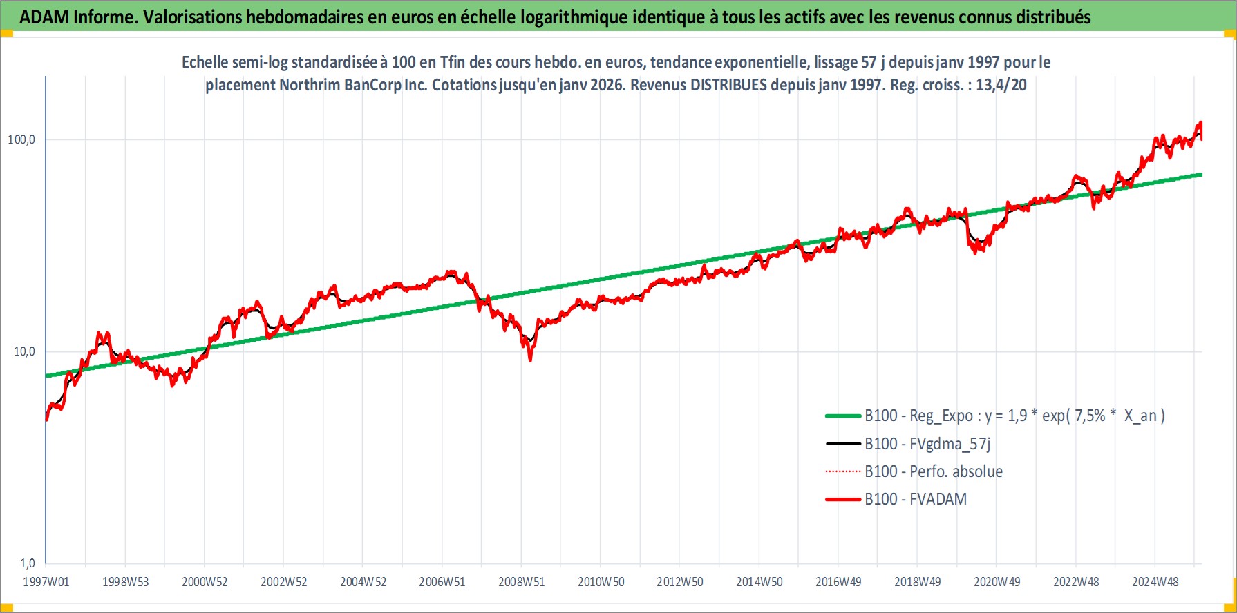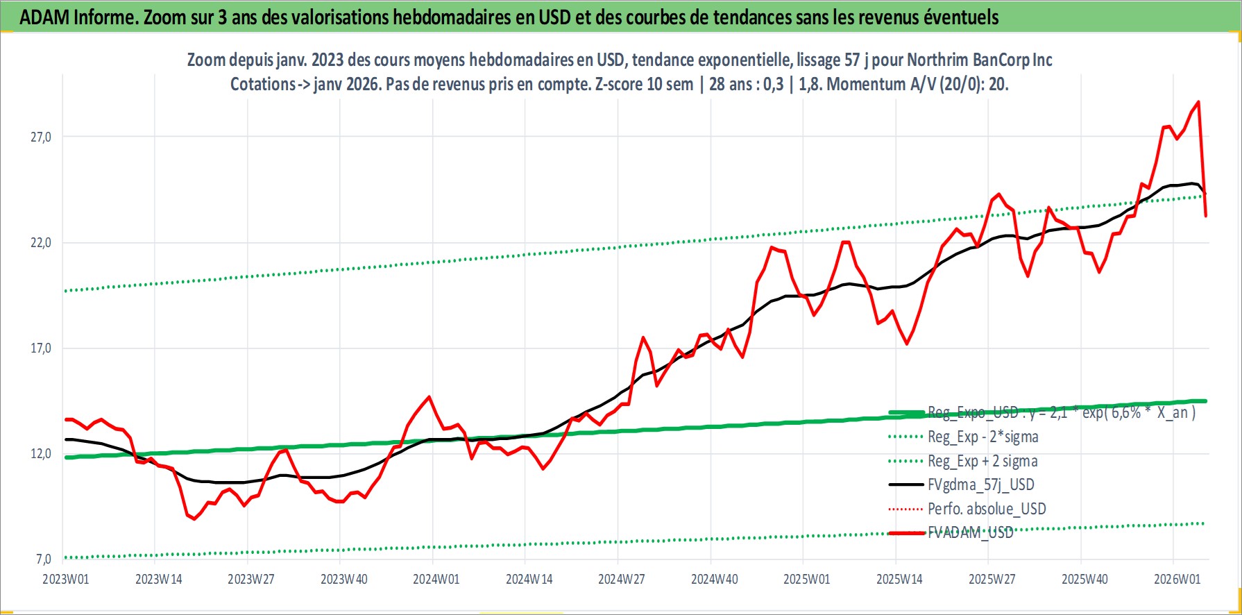 Site dédié aux investisseursPage dédiée sur site financeAnalyse des valorisations hebdomadaires de l'action Northrim BanCorp Inc. Cet actif est cote en USD. Les valorisations sont en contrevaleur EURO et couvrent les semaines 1997W01 a 2026W05. Les revenus de cet actif financier sont pris en compte depuis la semaine 1997W03. La note ESG de cet actif n'est pas connue.