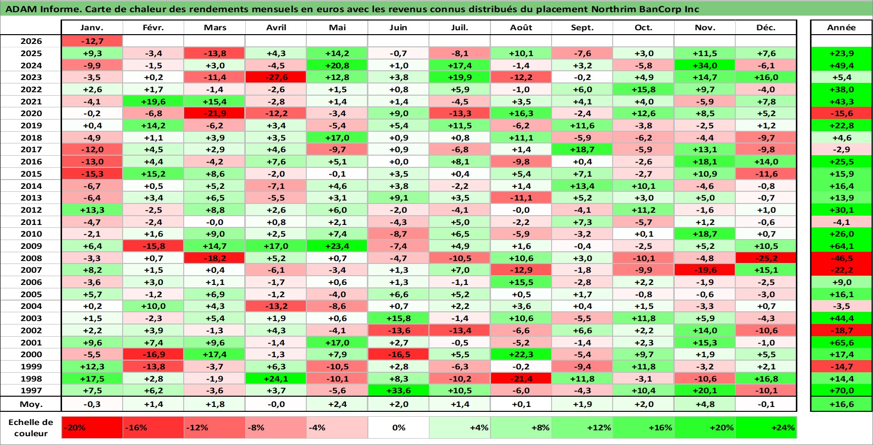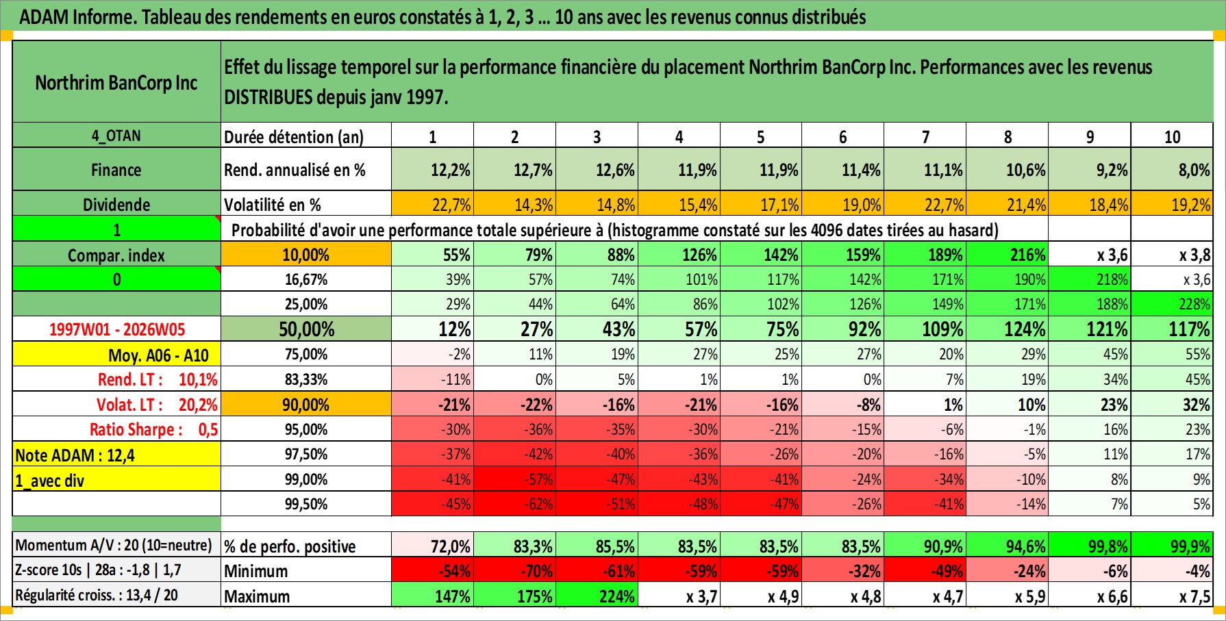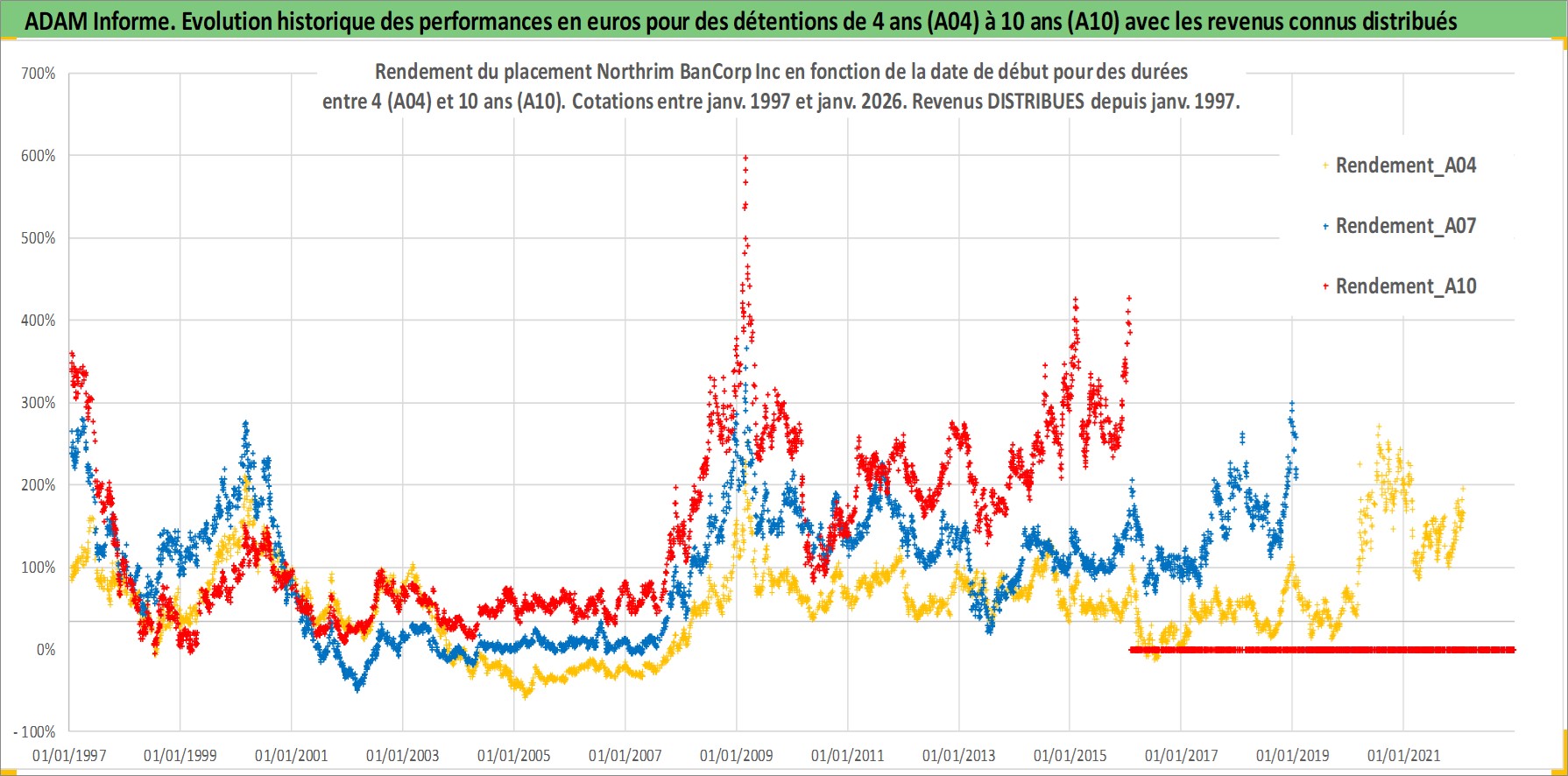 Site dédié aux investisseursPage dédiée sur site financeAnalyse des valorisations hebdomadaires de l'action Northrim BanCorp Inc. Cet actif est cote en USD. Les valorisations sont en contrevaleur EURO et couvrent les semaines 1997W01 a 2026W05. Les revenus de cet actif financier sont pris en compte depuis la semaine 1997W03. La note ESG de cet actif n'est pas connue.