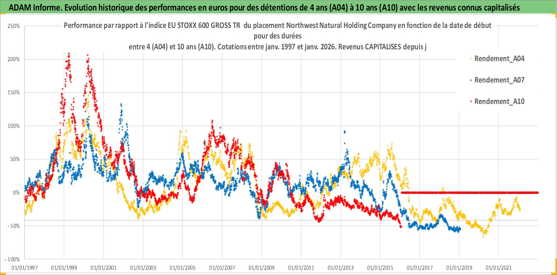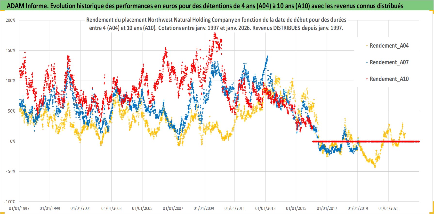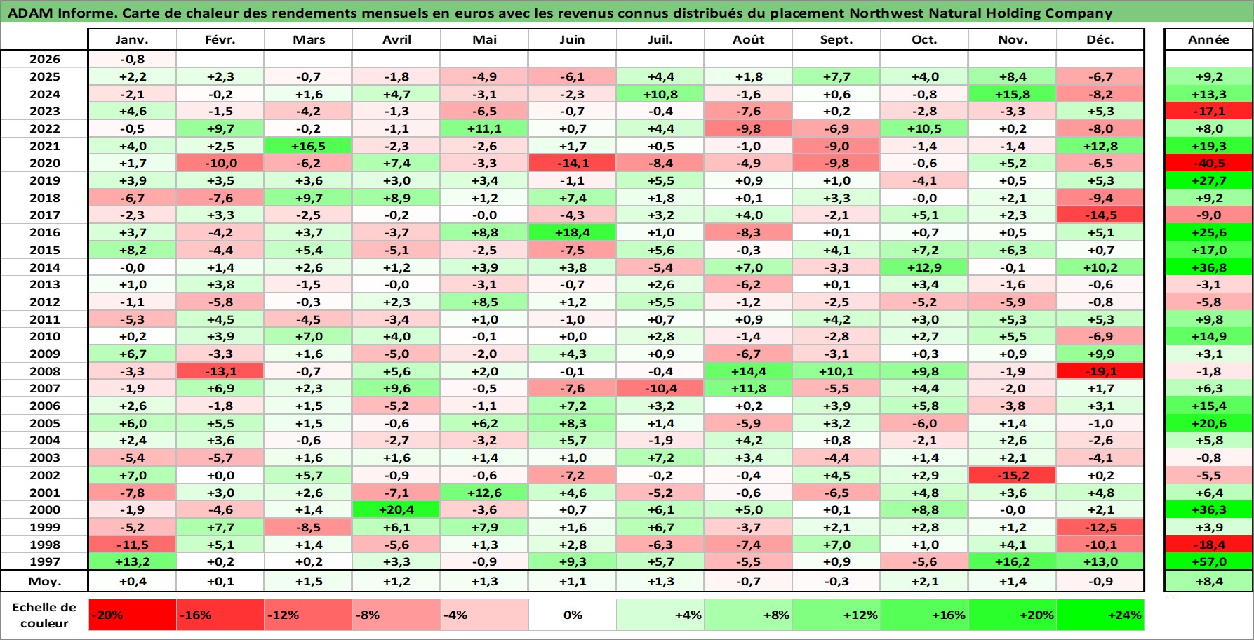 Site dédié aux investisseursPage dédiée sur site financeAnalyse des valorisations hebdomadaires de l'action Northwest Natural Holding Company. Cet actif est cote en USD. Les valorisations sont en contrevaleur EURO et couvrent les semaines 1997W01 a 2026W05. Les revenus de cet actif financier sont pris en compte depuis la semaine 1997W05. La note ESG de cet actif n'est pas connue.