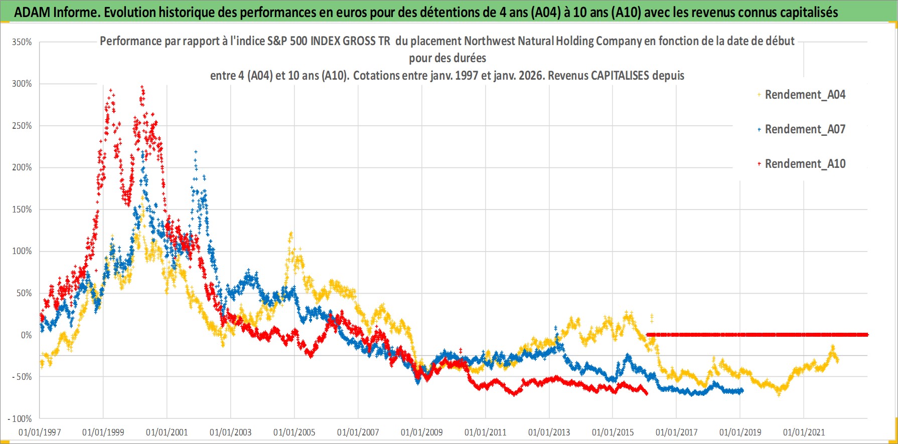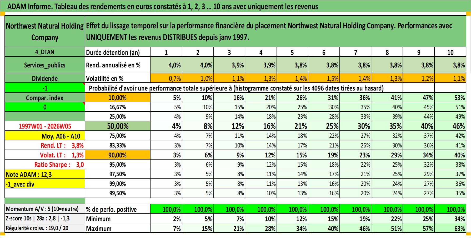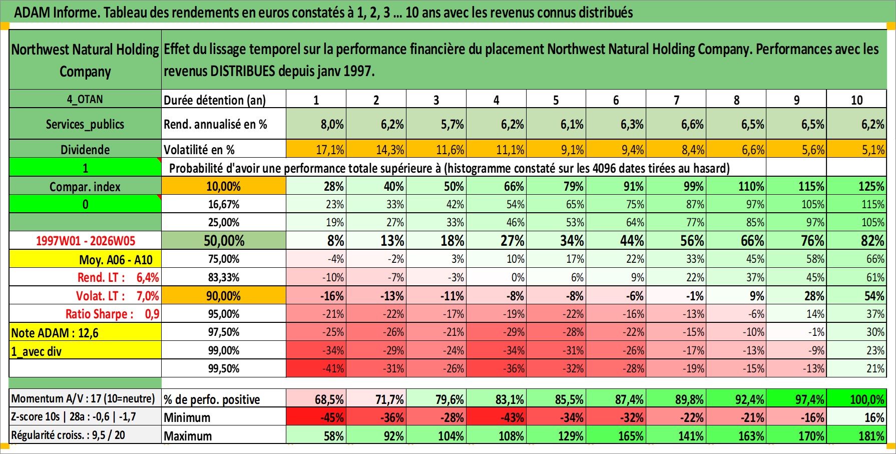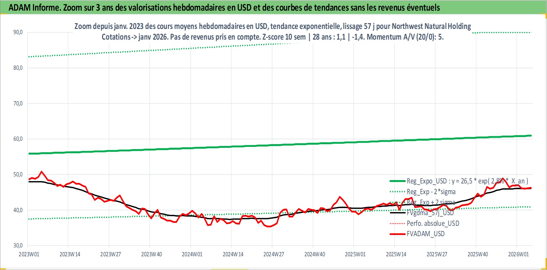 Site dédié aux investisseursPage dédiée sur site financeAnalyse des valorisations hebdomadaires de l'action Northwest Natural Holding Company. Cet actif est cote en USD. Les valorisations sont en contrevaleur EURO et couvrent les semaines 1997W01 a 2026W05. Les revenus de cet actif financier sont pris en compte depuis la semaine 1997W05. La note ESG de cet actif n'est pas connue.