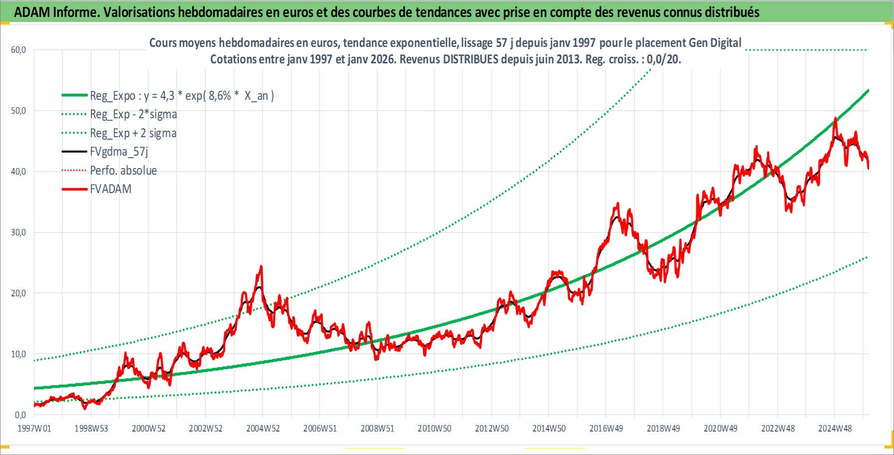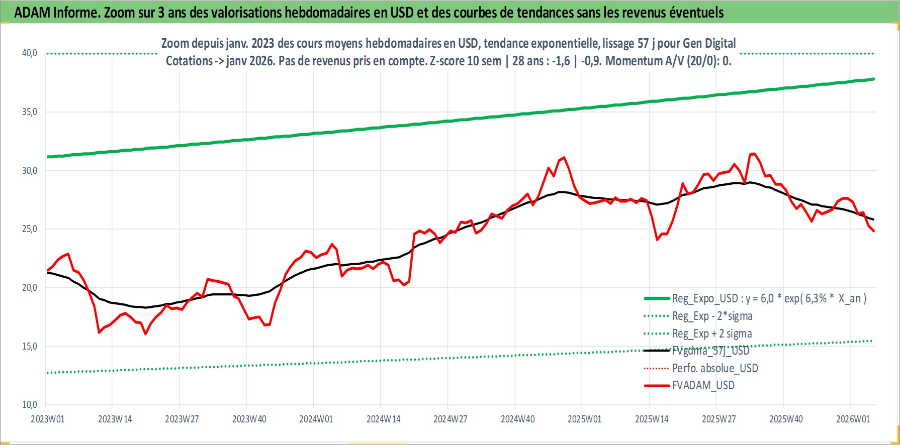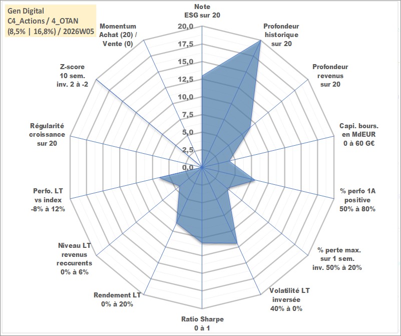 Site dédié aux investisseursPage dédiée sur site financeAnalyse des valorisations hebdomadaires de l'action Gen Digital. Cet actif est cote en USD. Les valorisations sont en contrevaleur EURO et couvrent les semaines 1997W01 a 2026W05. Les revenus de cet actif financier sont pris en compte depuis la semaine 2013W25. La note globale ESG de cet actif est estimee a 13.0 (apres rebasage entre 0 et 20).