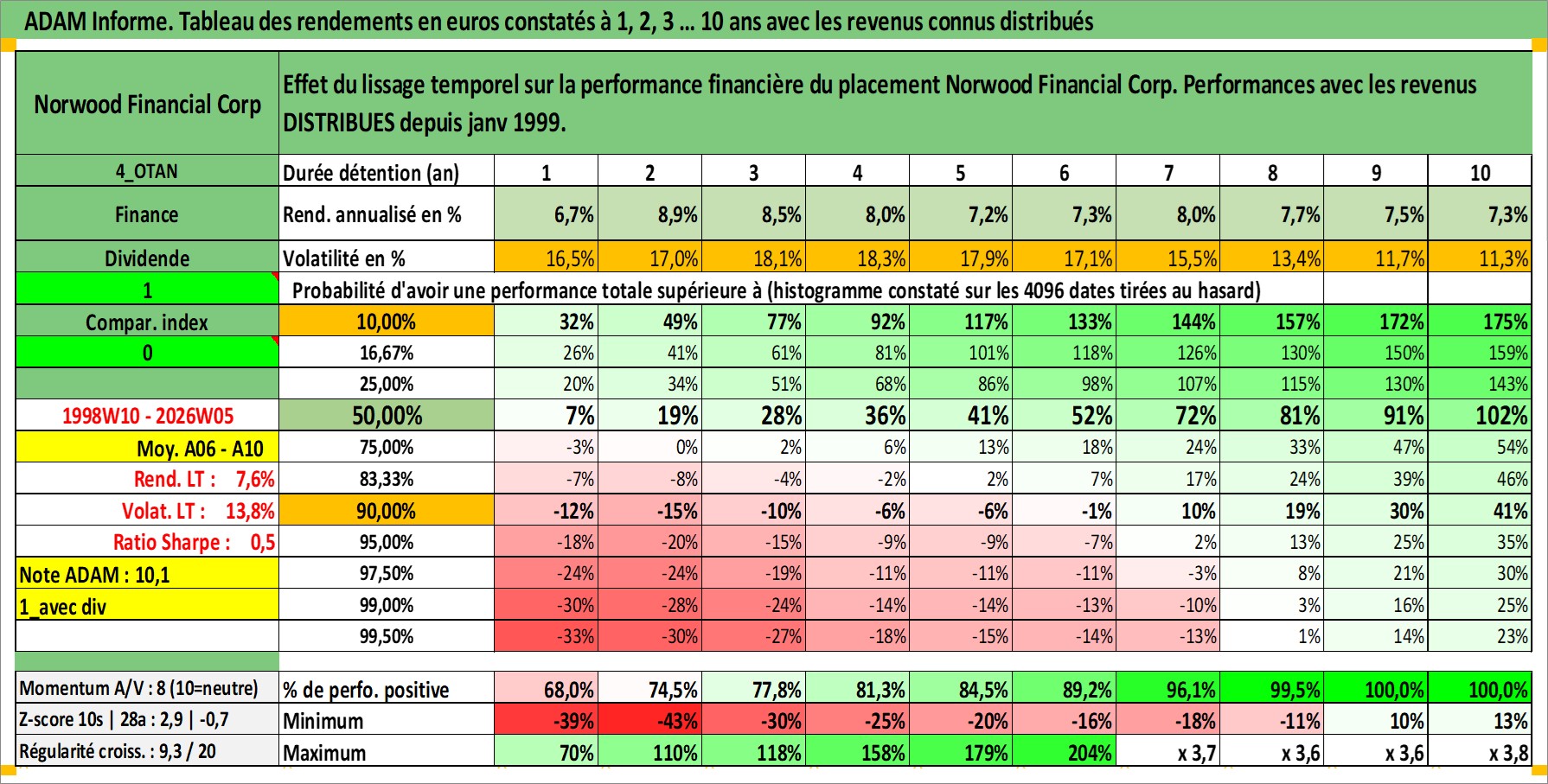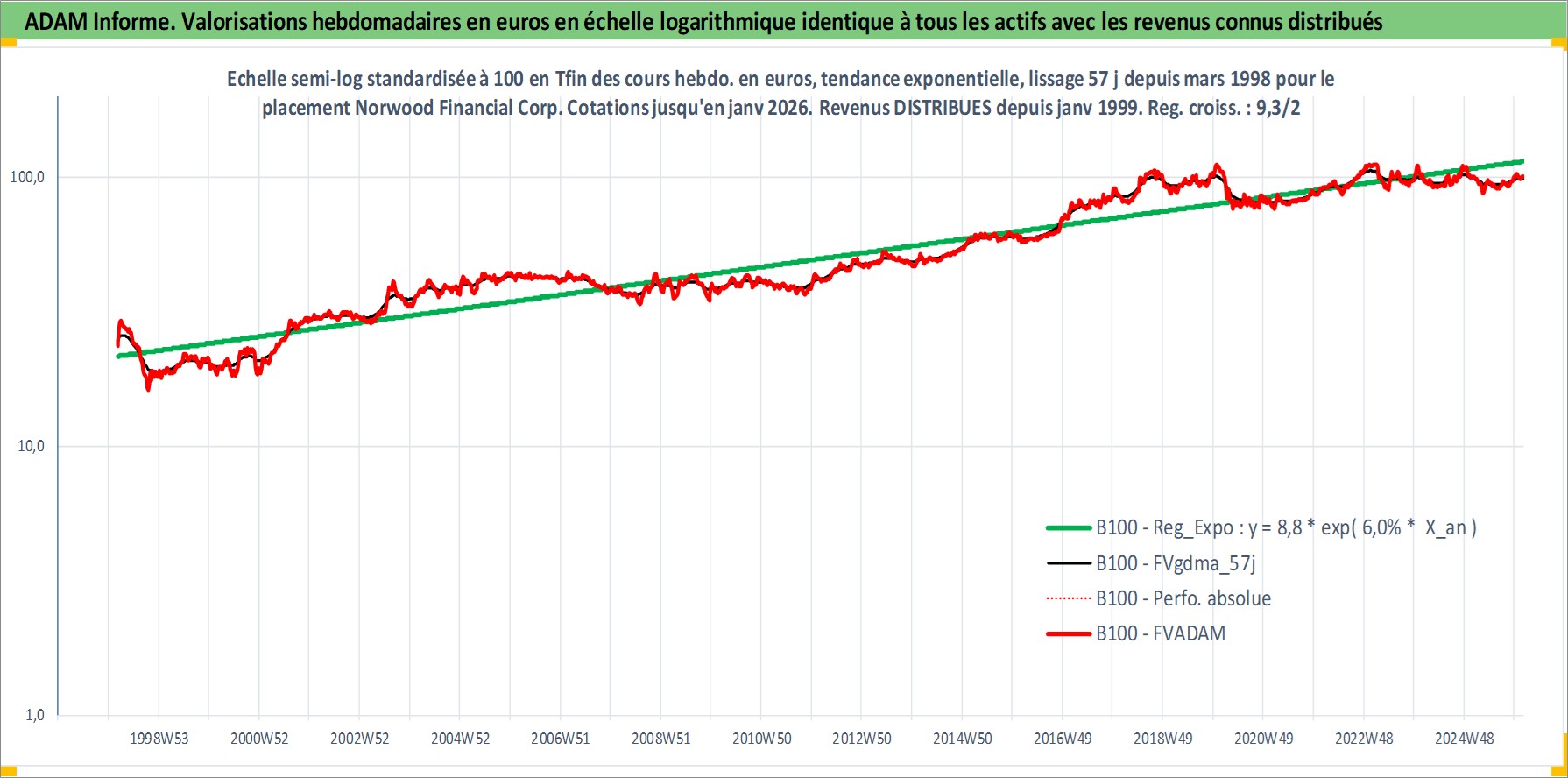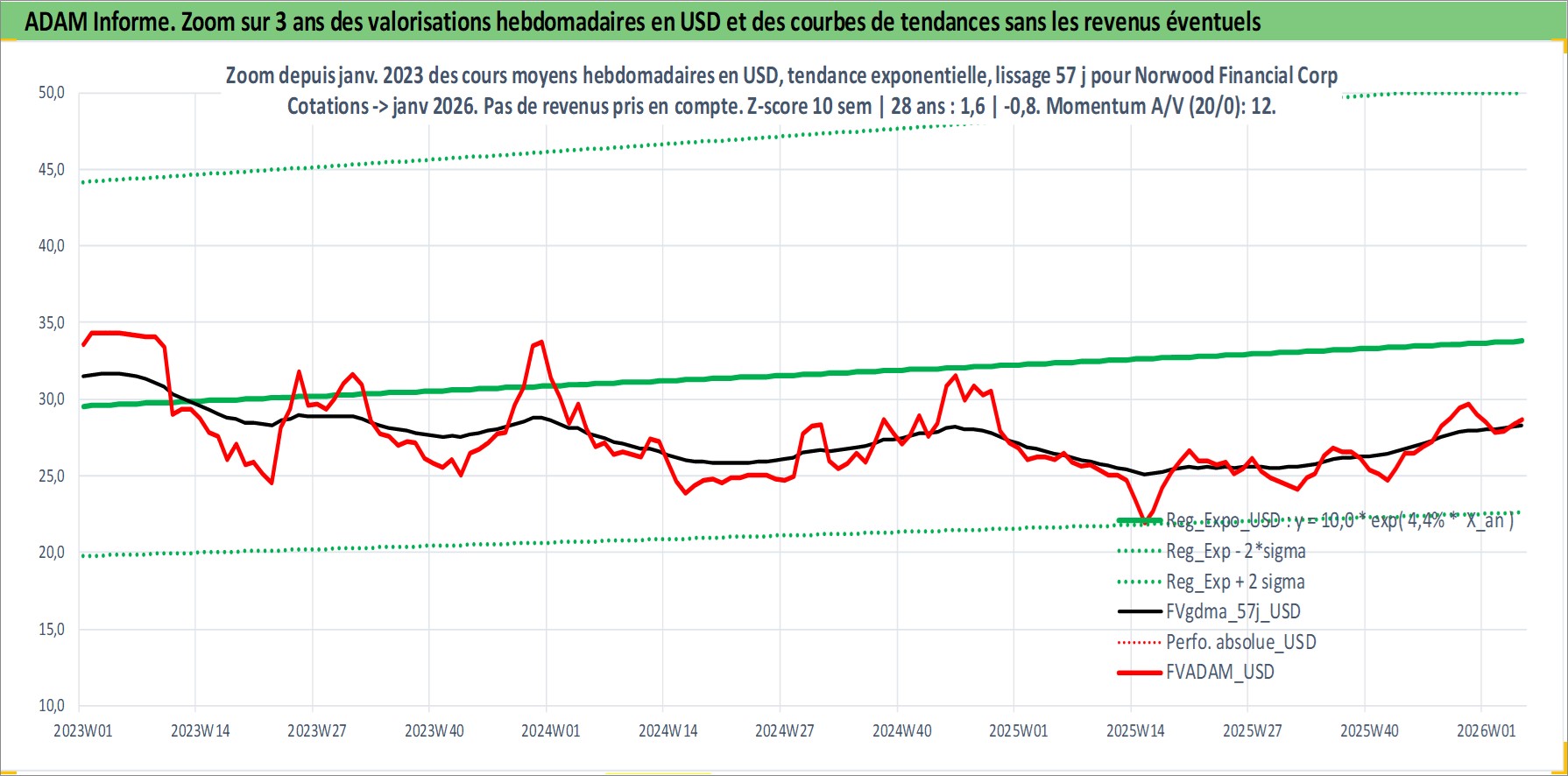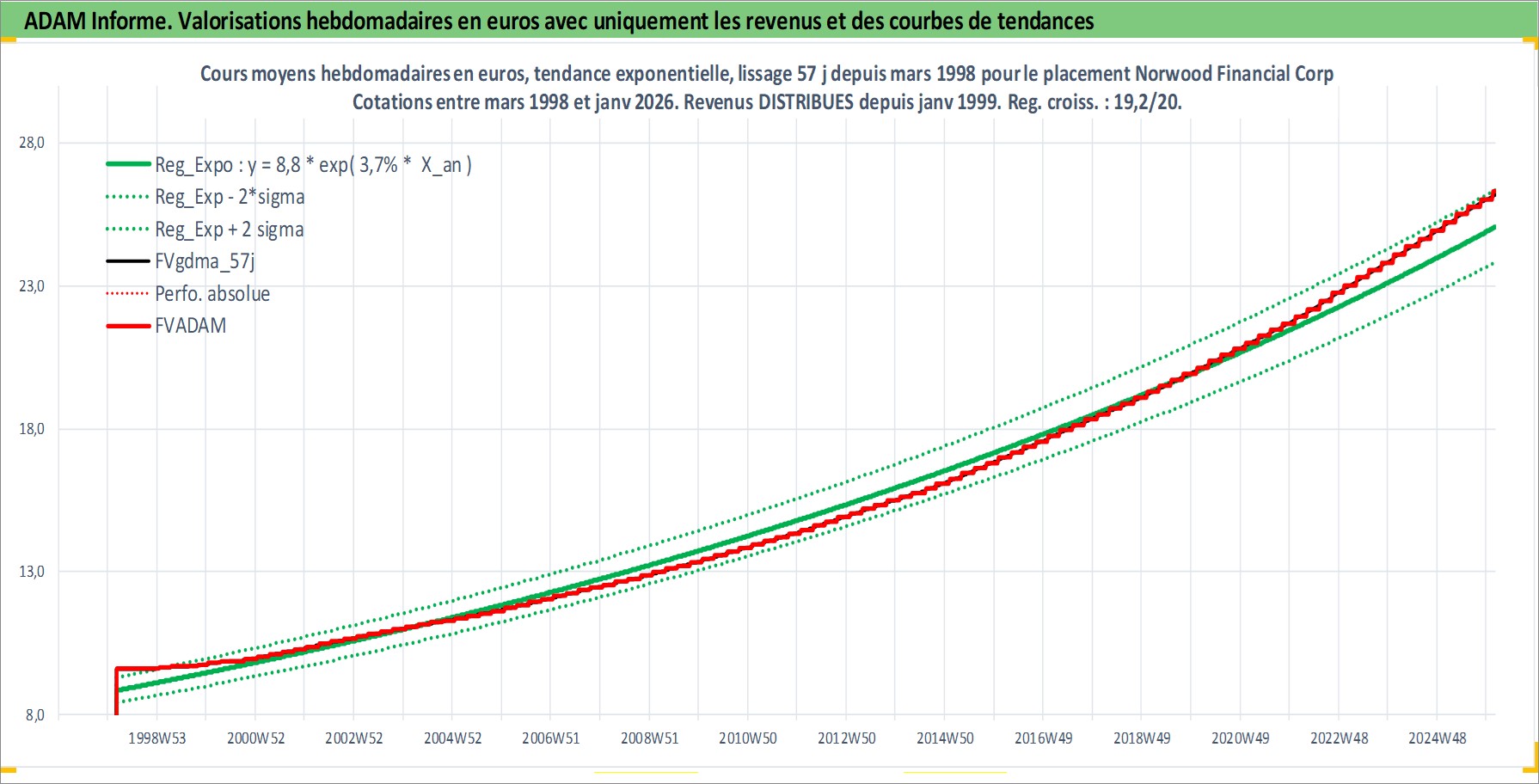 Site dédié aux investisseursPage dédiée sur site financeAnalyse des valorisations hebdomadaires de l'action Norwood Financial Corp. Cet actif est cote en USD. Les valorisations sont en contrevaleur EURO et couvrent les semaines 1998W10 a 2026W05. Les revenus de cet actif financier sont pris en compte depuis la semaine 1999W02. La note ESG de cet actif n'est pas connue.