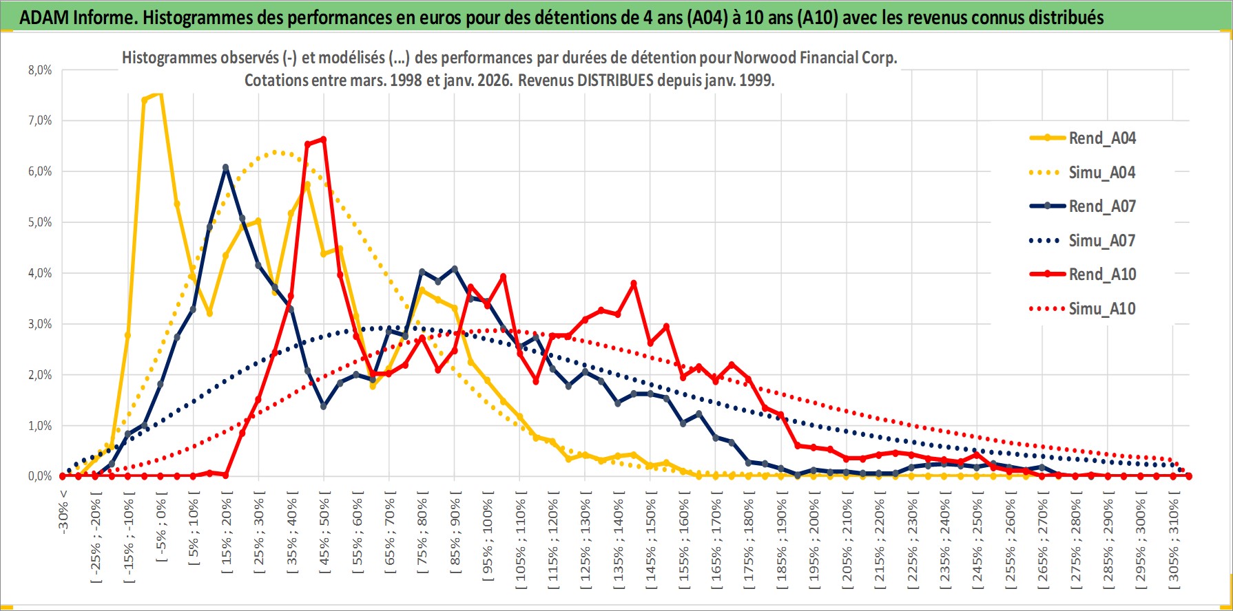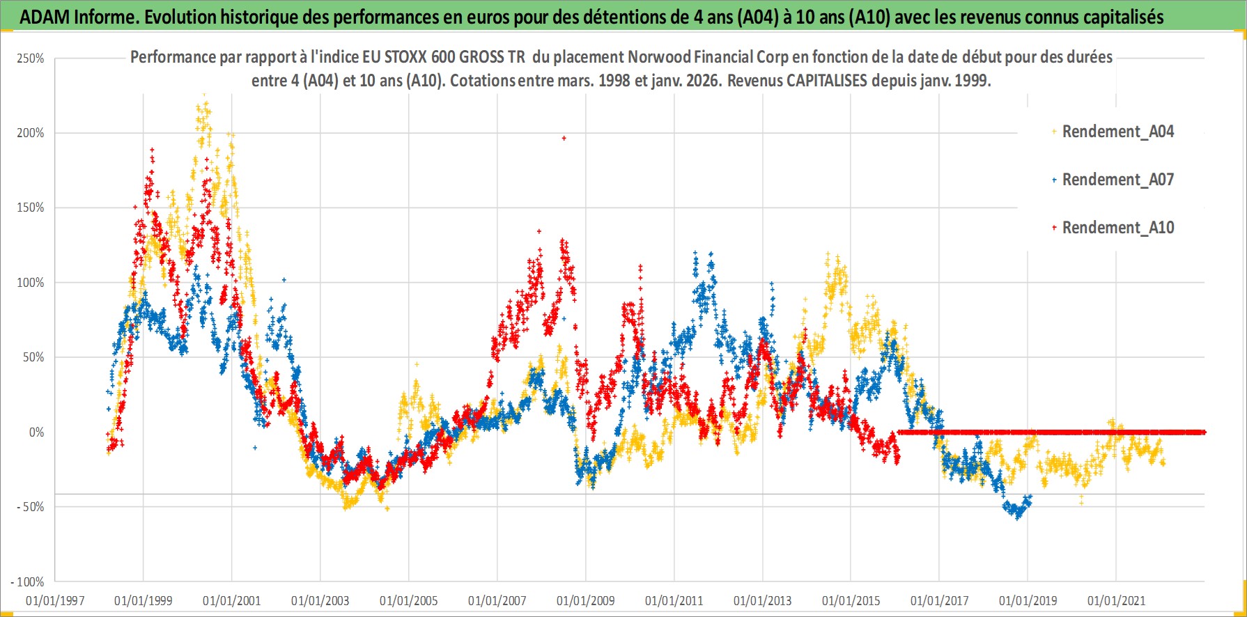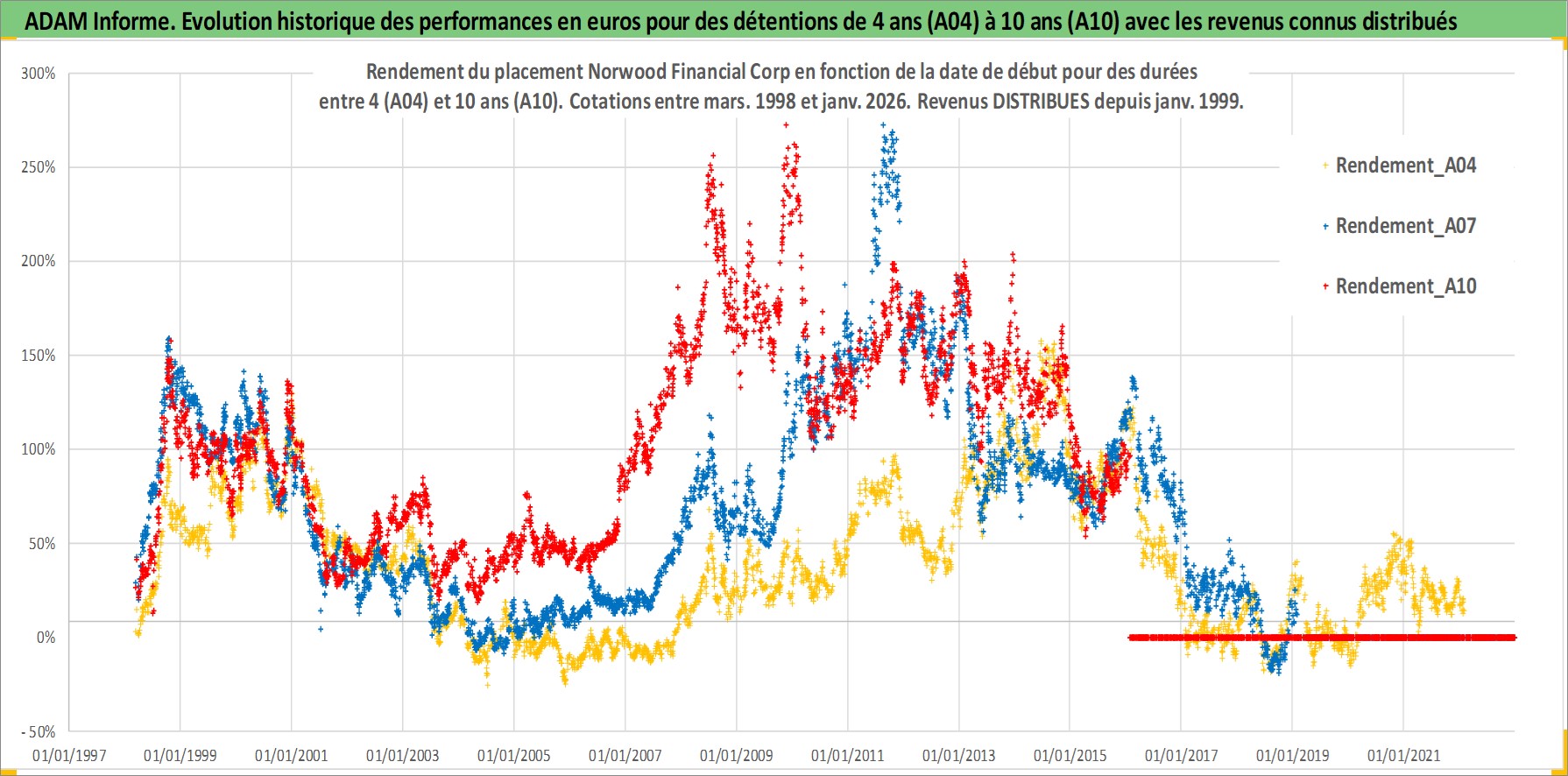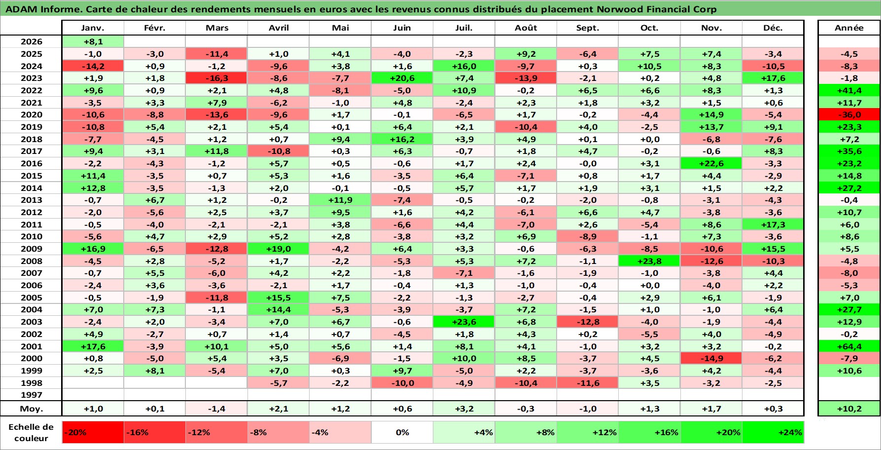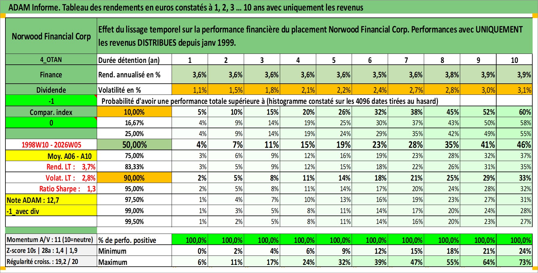 Site dédié aux investisseursPage dédiée sur site financeAnalyse des valorisations hebdomadaires de l'action Norwood Financial Corp. Cet actif est cote en USD. Les valorisations sont en contrevaleur EURO et couvrent les semaines 1998W10 a 2026W05. Les revenus de cet actif financier sont pris en compte depuis la semaine 1999W02. La note ESG de cet actif n'est pas connue.