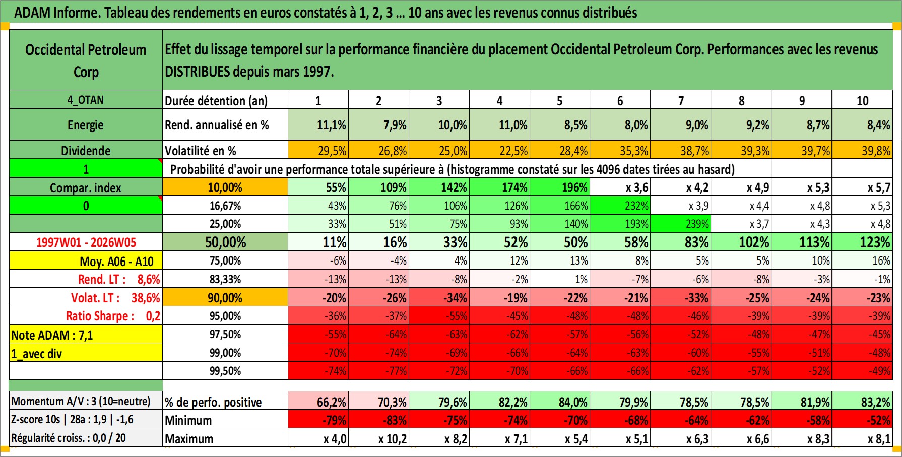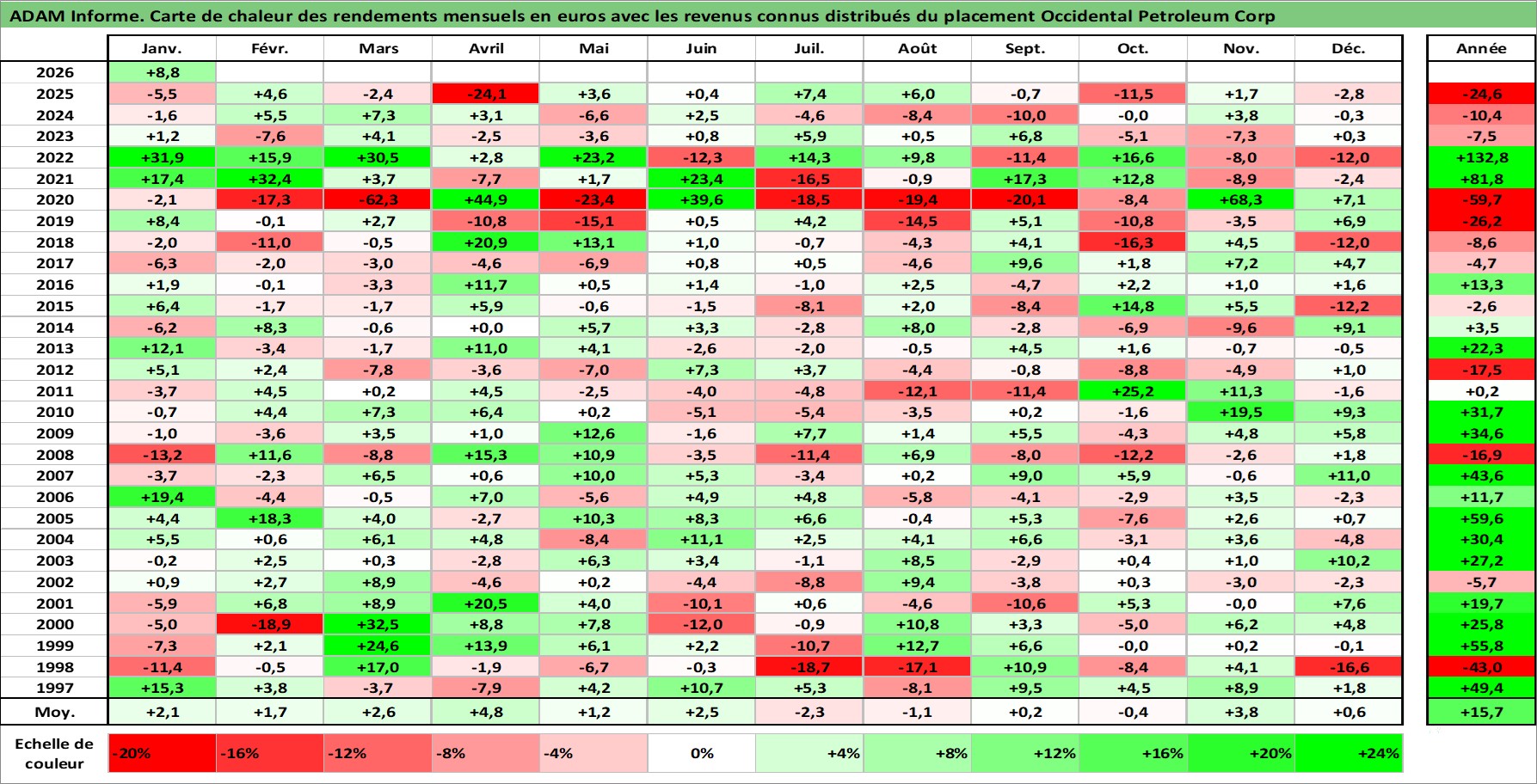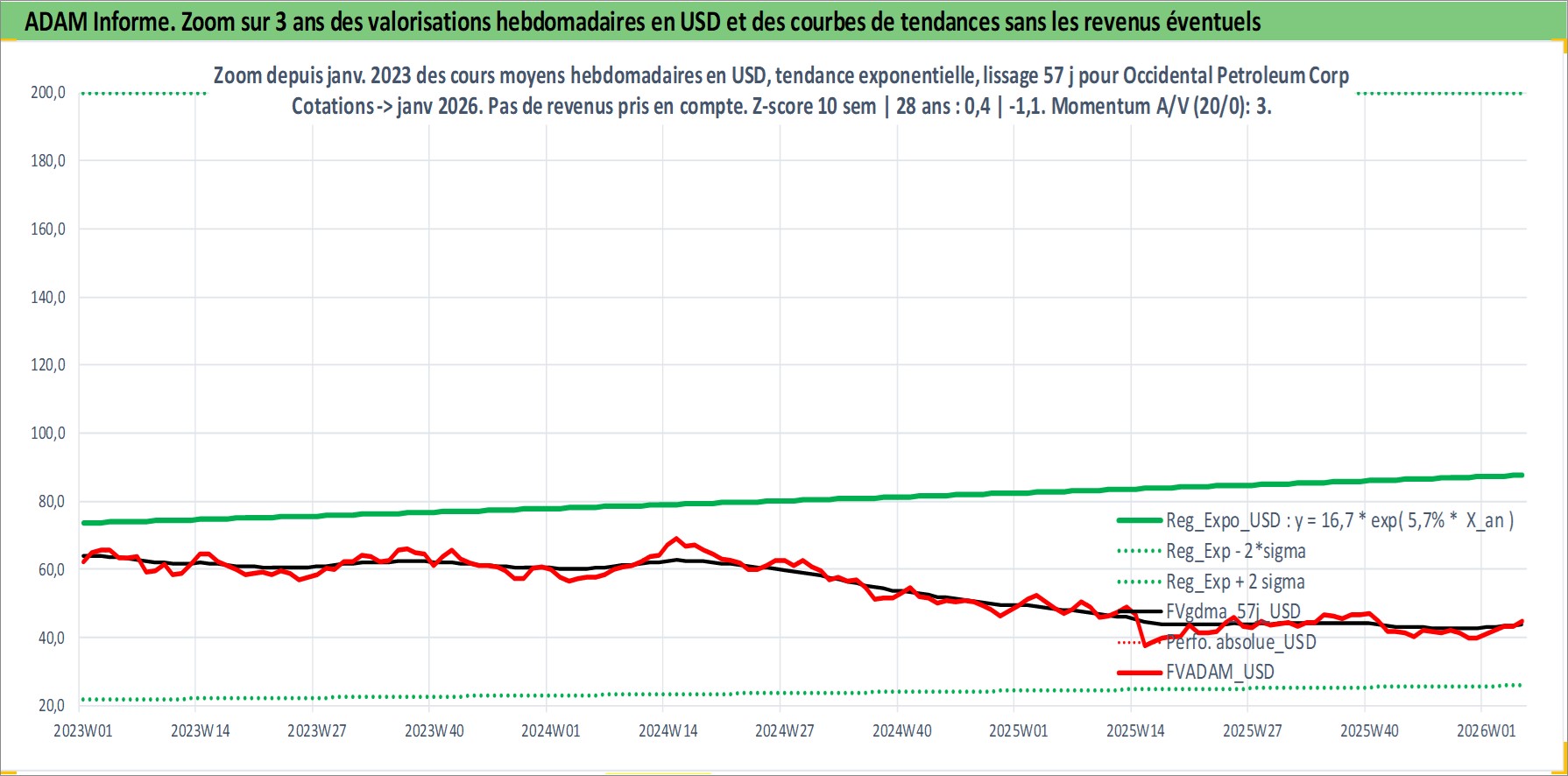 Site dédié aux investisseursPage dédiée sur site financeAnalyse des valorisations hebdomadaires de l'action Occidental Petroleum Corp. Cet actif est cote en USD. Les valorisations sont en contrevaleur EURO et couvrent les semaines 1997W01 a 2026W05. Les revenus de cet actif financier sont pris en compte depuis la semaine 1997W10. La note globale ESG de cet actif est estimee a 1.0 (apres rebasage entre 0 et 20).