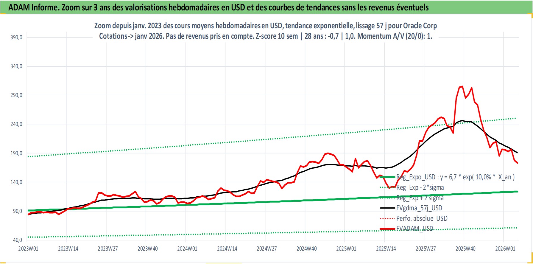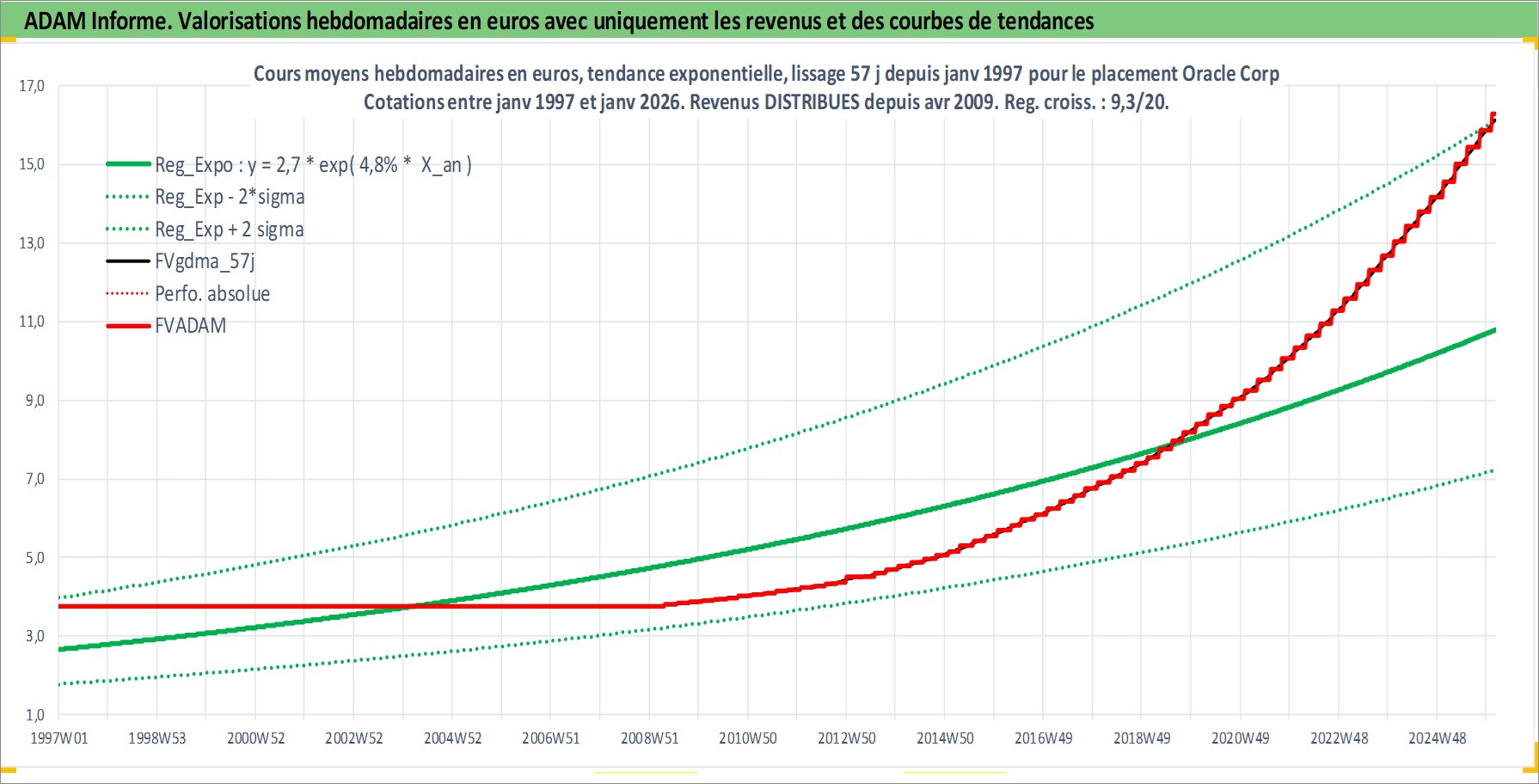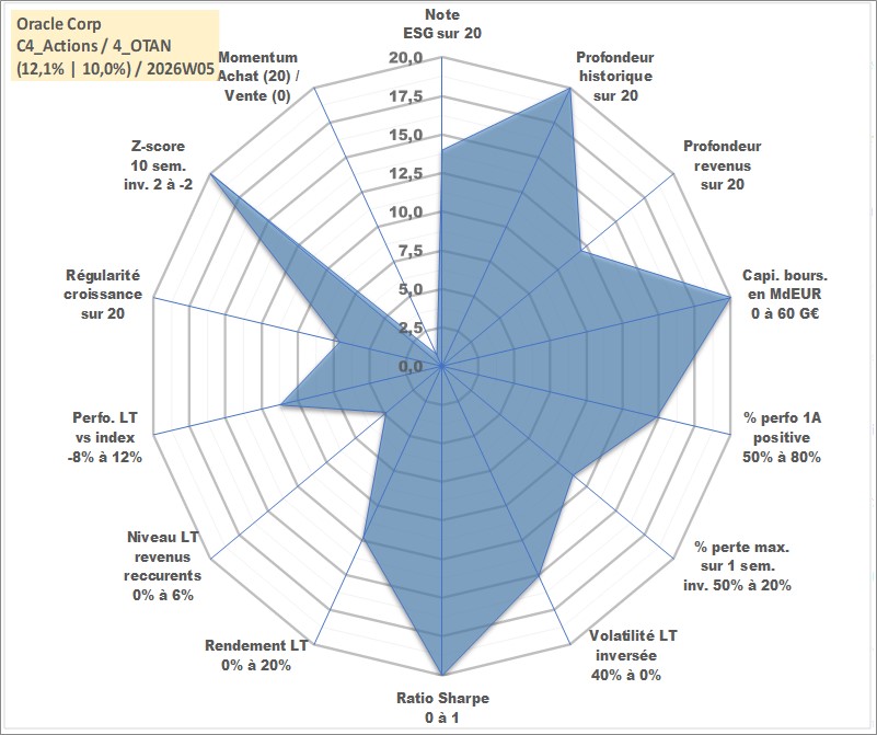 Site dédié aux investisseursPage dédiée sur site financeAnalyse des valorisations hebdomadaires de l'action Oracle Corp. Cet actif est cote en USD. Les valorisations sont en contrevaleur EURO et couvrent les semaines 1997W01 a 2026W05. Les revenus de cet actif financier sont pris en compte depuis la semaine 2009W15. La note globale ESG de cet actif est estimee a 14.0 (apres rebasage entre 0 et 20).