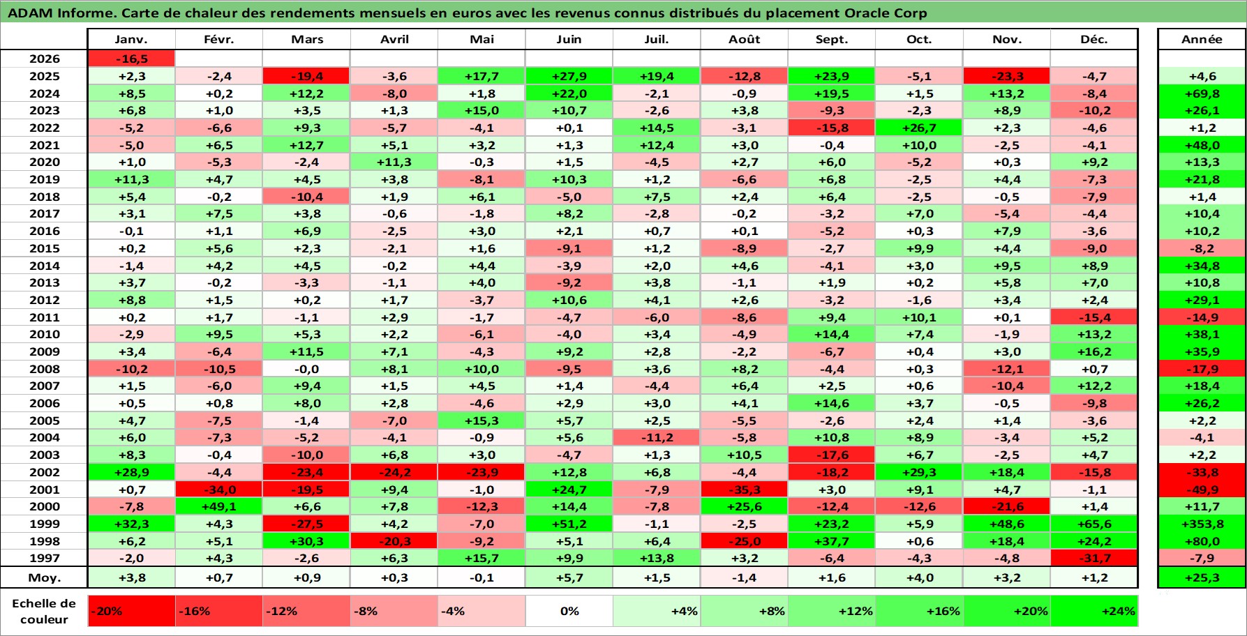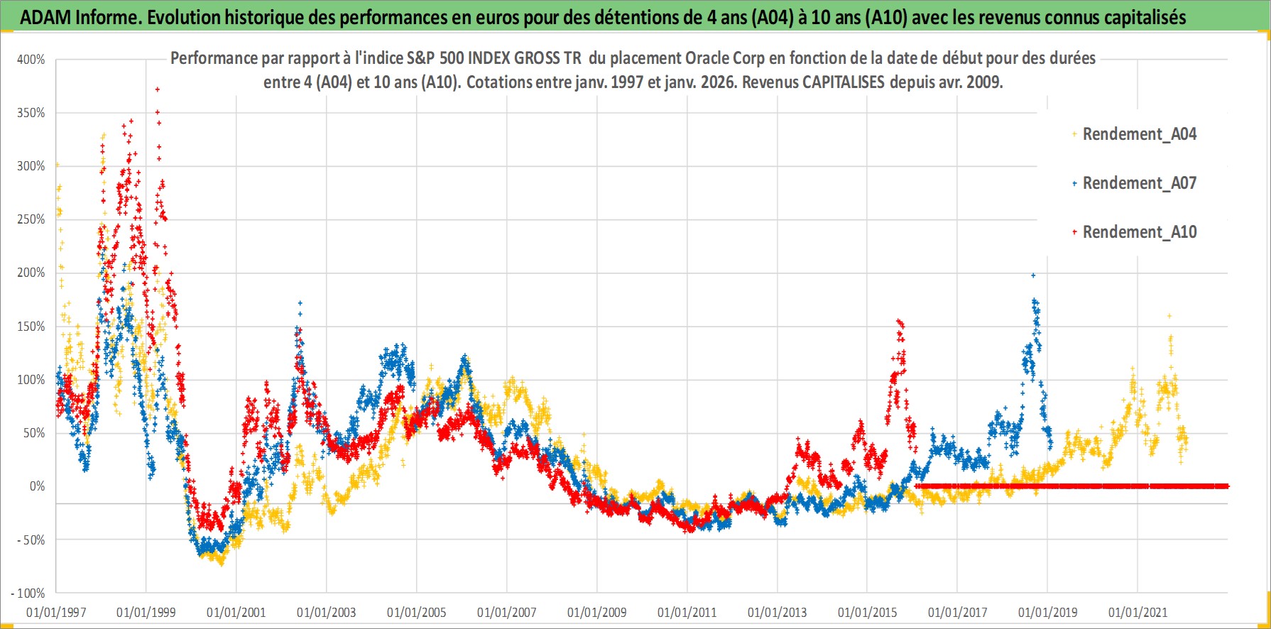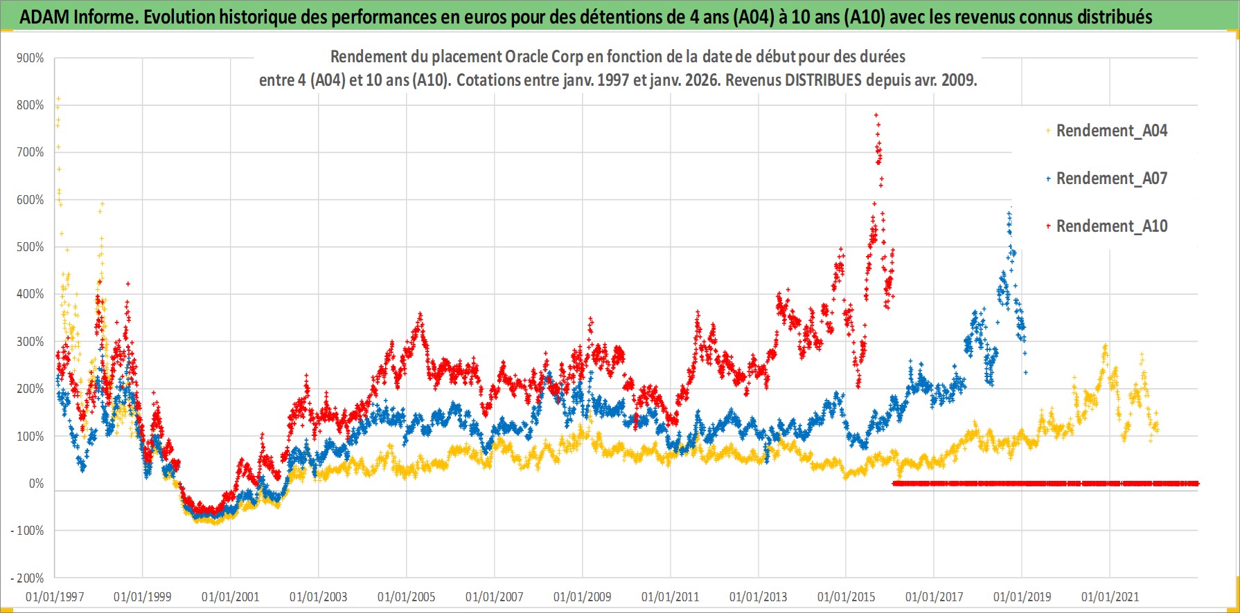 Site dédié aux investisseursPage dédiée sur site financeAnalyse des valorisations hebdomadaires de l'action Oracle Corp. Cet actif est cote en USD. Les valorisations sont en contrevaleur EURO et couvrent les semaines 1997W01 a 2026W05. Les revenus de cet actif financier sont pris en compte depuis la semaine 2009W15. La note globale ESG de cet actif est estimee a 14.0 (apres rebasage entre 0 et 20).