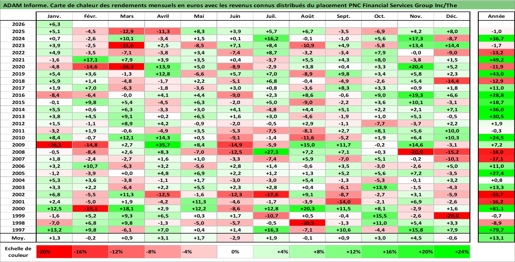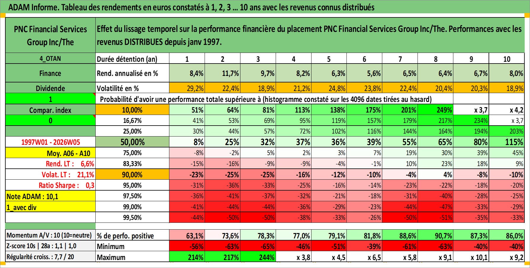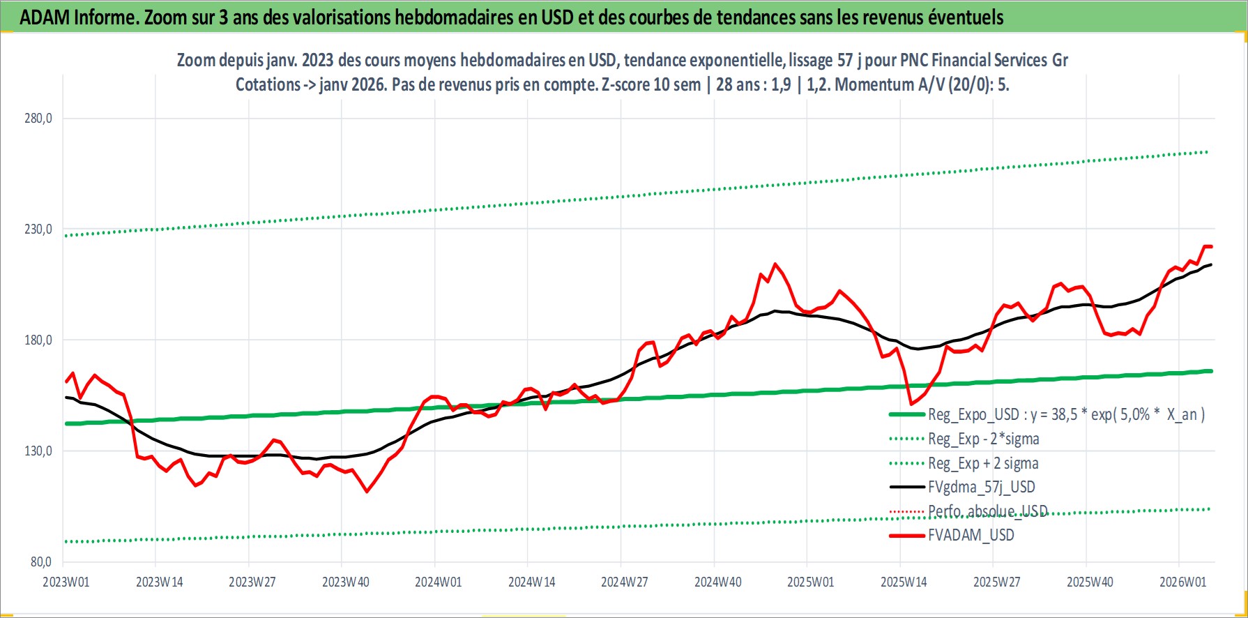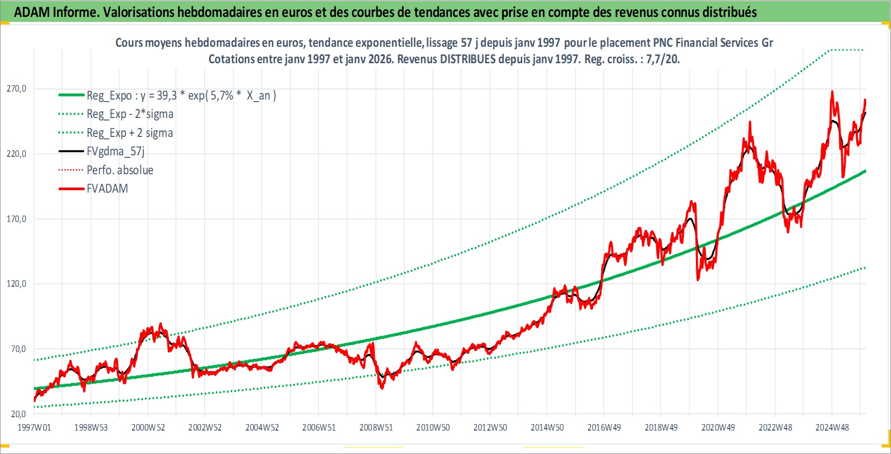 Site dédié aux investisseursPage dédiée sur site financeAnalyse des valorisations hebdomadaires de l'action PNC Financial Services Group Inc/The. Cet actif est cote en USD. Les valorisations sont en contrevaleur EURO et couvrent les semaines 1997W01 a 2026W05. Les revenus de cet actif financier sont pris en compte depuis la semaine 1997W02. La note globale ESG de cet actif est estimee a 9.0 (apres rebasage entre 0 et 20).