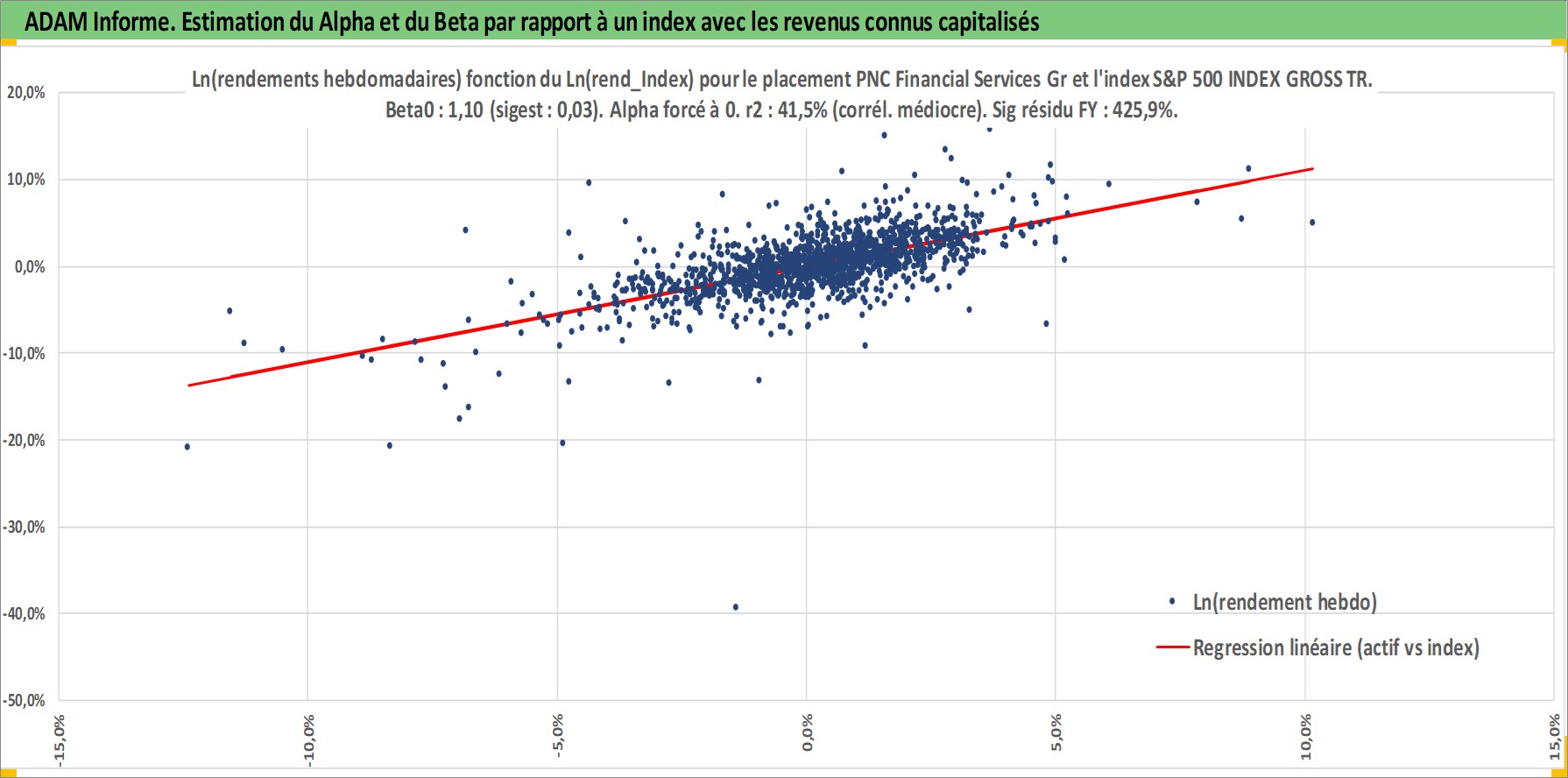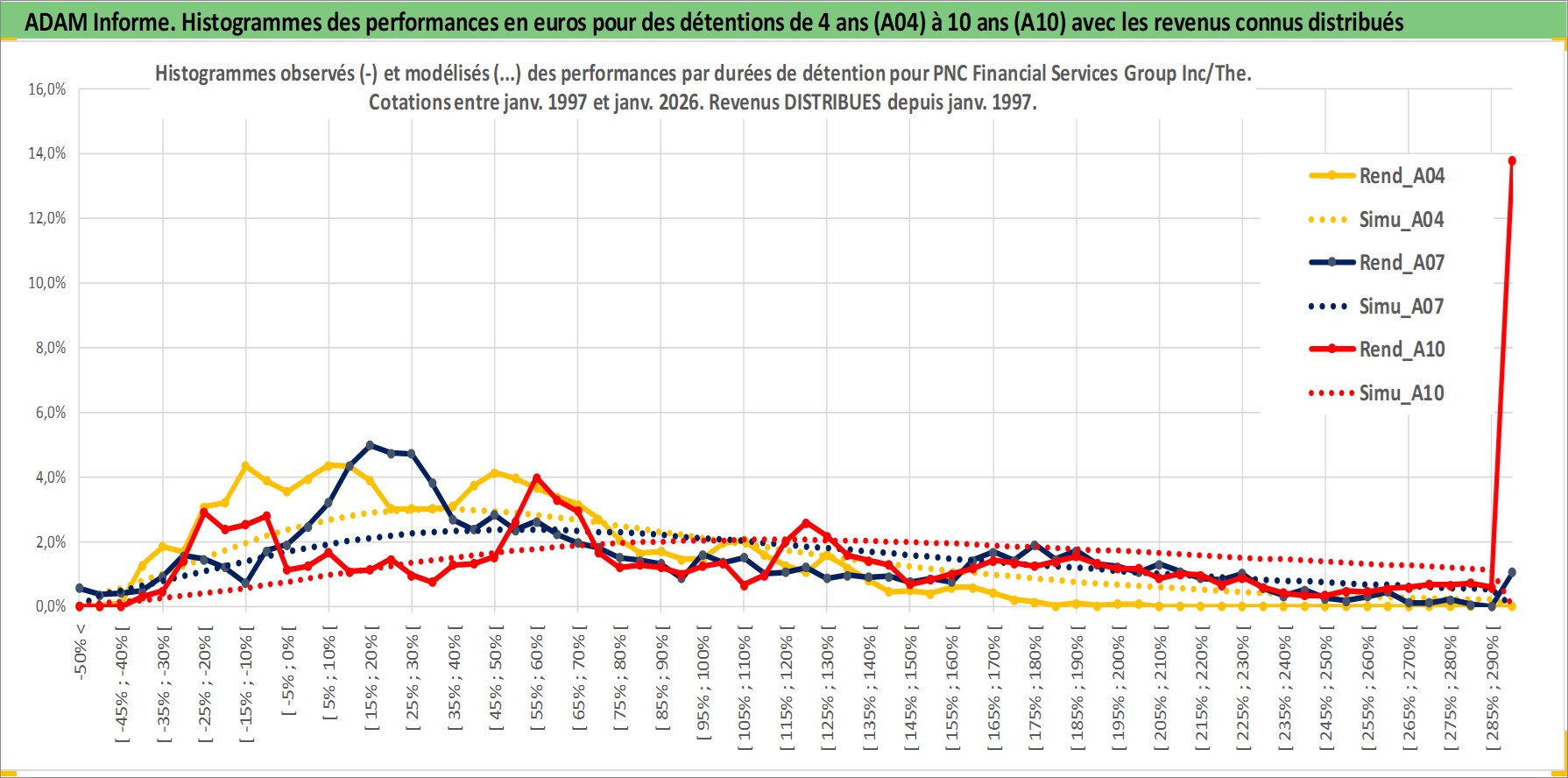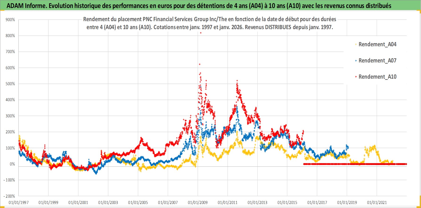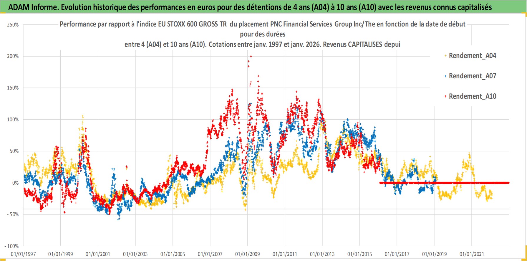 Site dédié aux investisseursPage dédiée sur site financeAnalyse des valorisations hebdomadaires de l'action PNC Financial Services Group Inc/The. Cet actif est cote en USD. Les valorisations sont en contrevaleur EURO et couvrent les semaines 1997W01 a 2026W05. Les revenus de cet actif financier sont pris en compte depuis la semaine 1997W02. La note globale ESG de cet actif est estimee a 9.0 (apres rebasage entre 0 et 20).