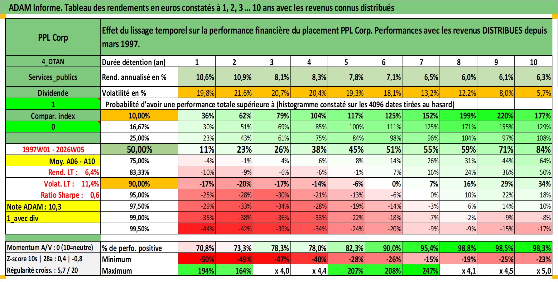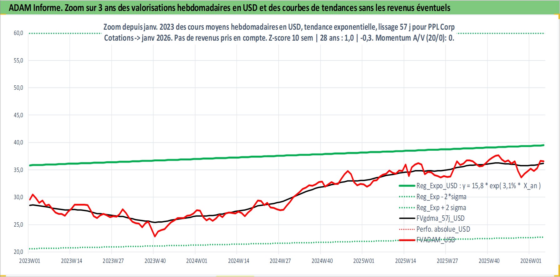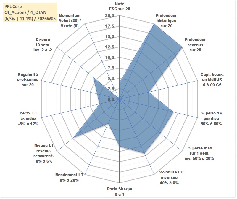 Site dédié aux investisseursPage dédiée sur site financeAnalyse des valorisations hebdomadaires de l'action PPL Corp. Cet actif est cote en USD. Les valorisations sont en contrevaleur EURO et couvrent les semaines 1997W01 a 2026W05. Les revenus de cet actif financier sont pris en compte depuis la semaine 1997W10. La note globale ESG de cet actif est estimee a 4.0 (apres rebasage entre 0 et 20).