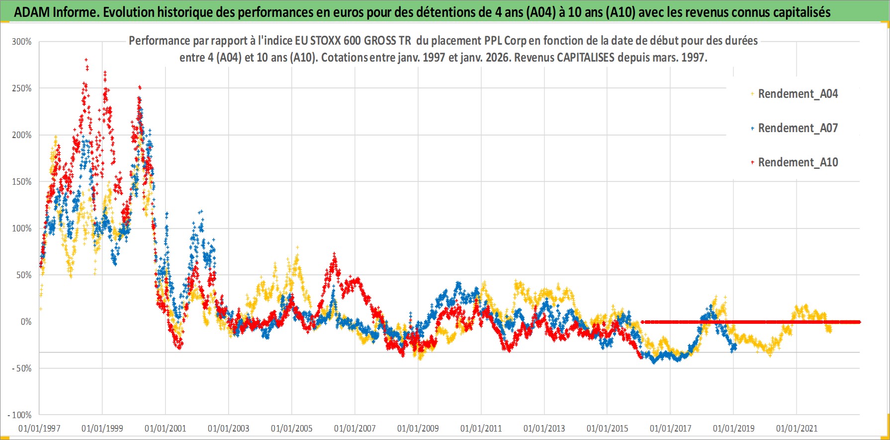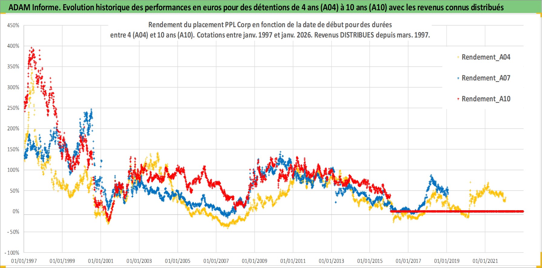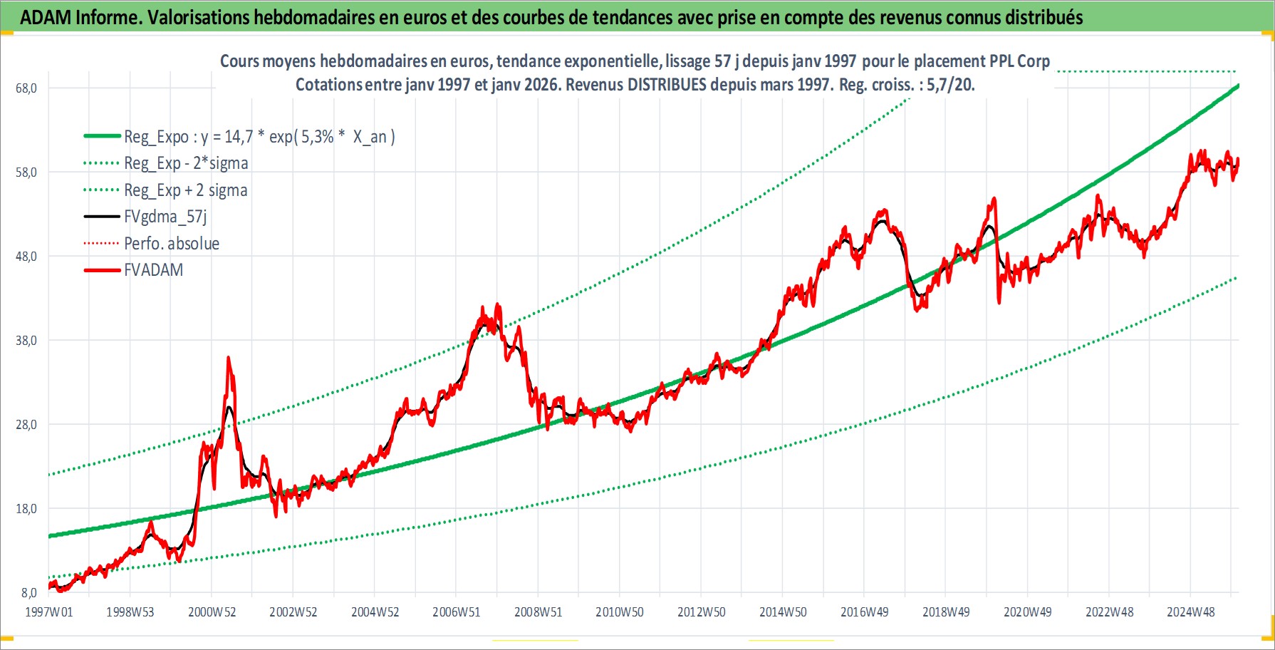Site dédié aux investisseursPage dédiée sur site financeAnalyse des valorisations hebdomadaires de l'action PPL Corp. Cet actif est cote en USD. Les valorisations sont en contrevaleur EURO et couvrent les semaines 1997W01 a 2026W05. Les revenus de cet actif financier sont pris en compte depuis la semaine 1997W10. La note globale ESG de cet actif est estimee a 4.0 (apres rebasage entre 0 et 20).