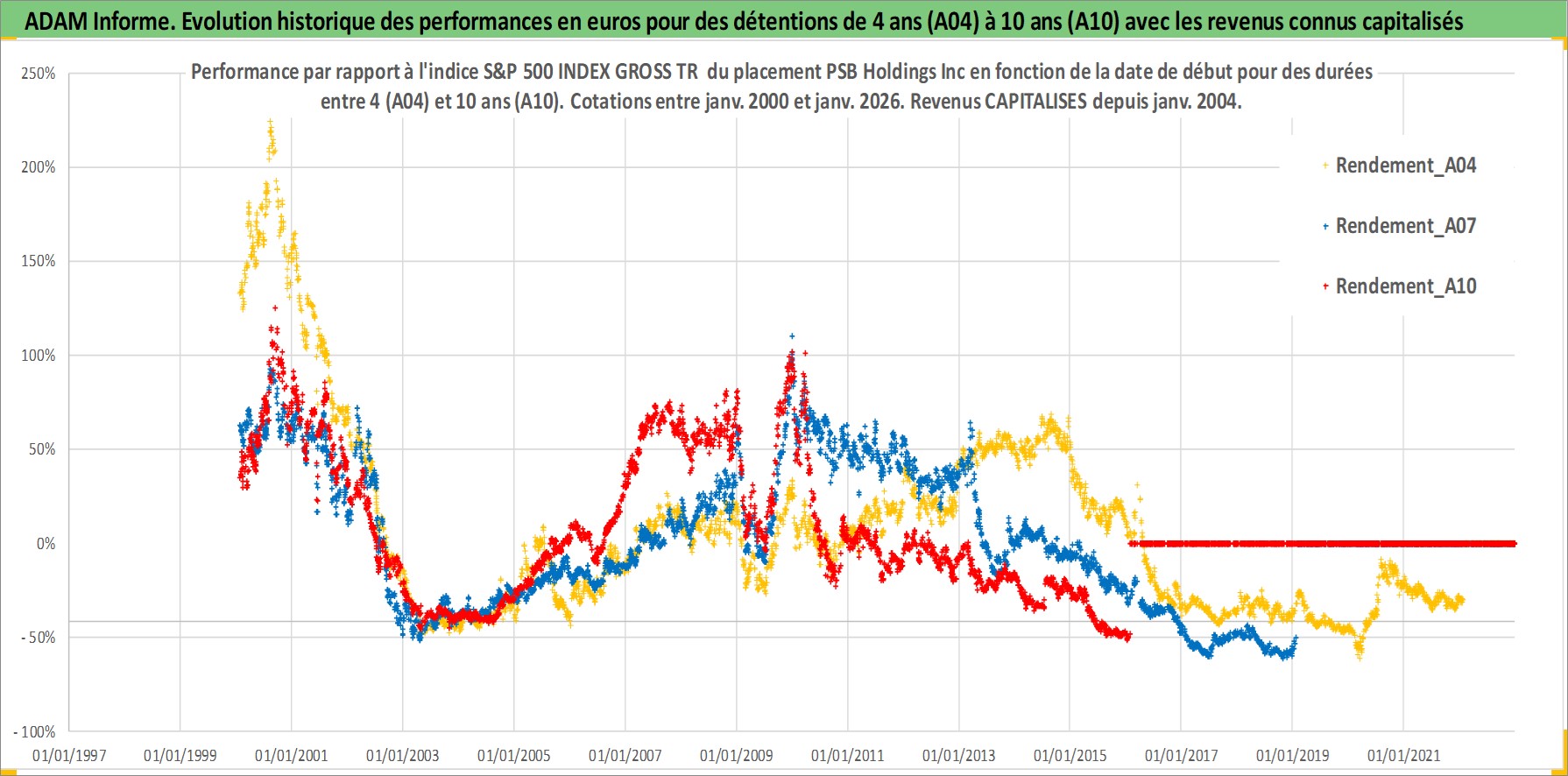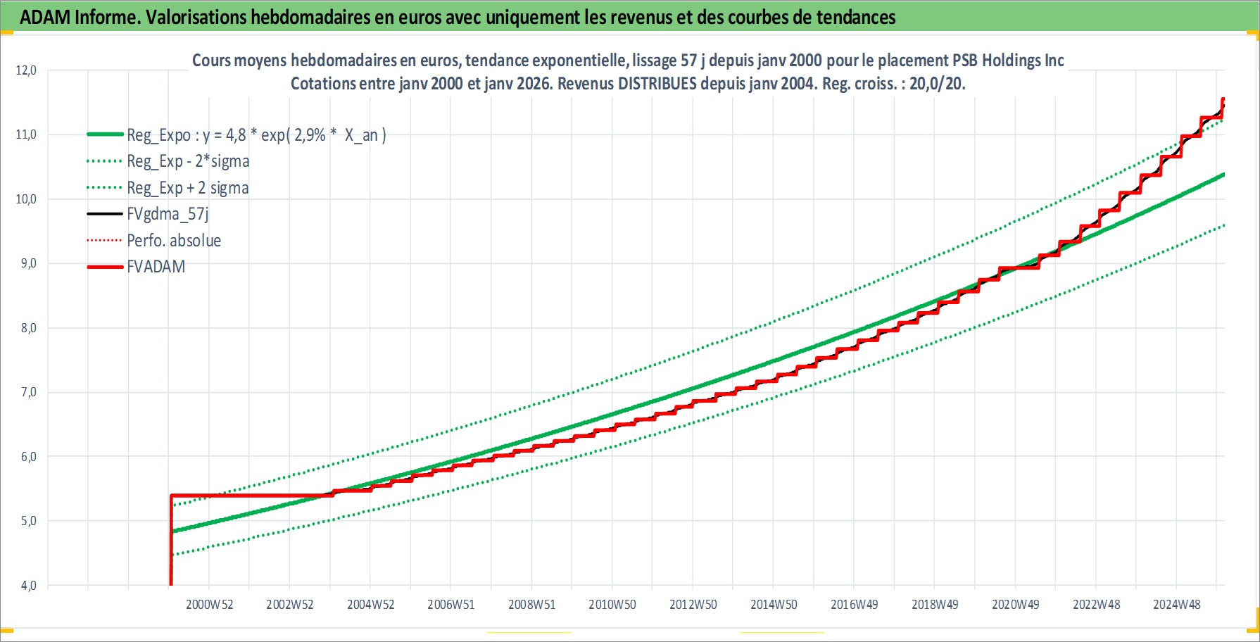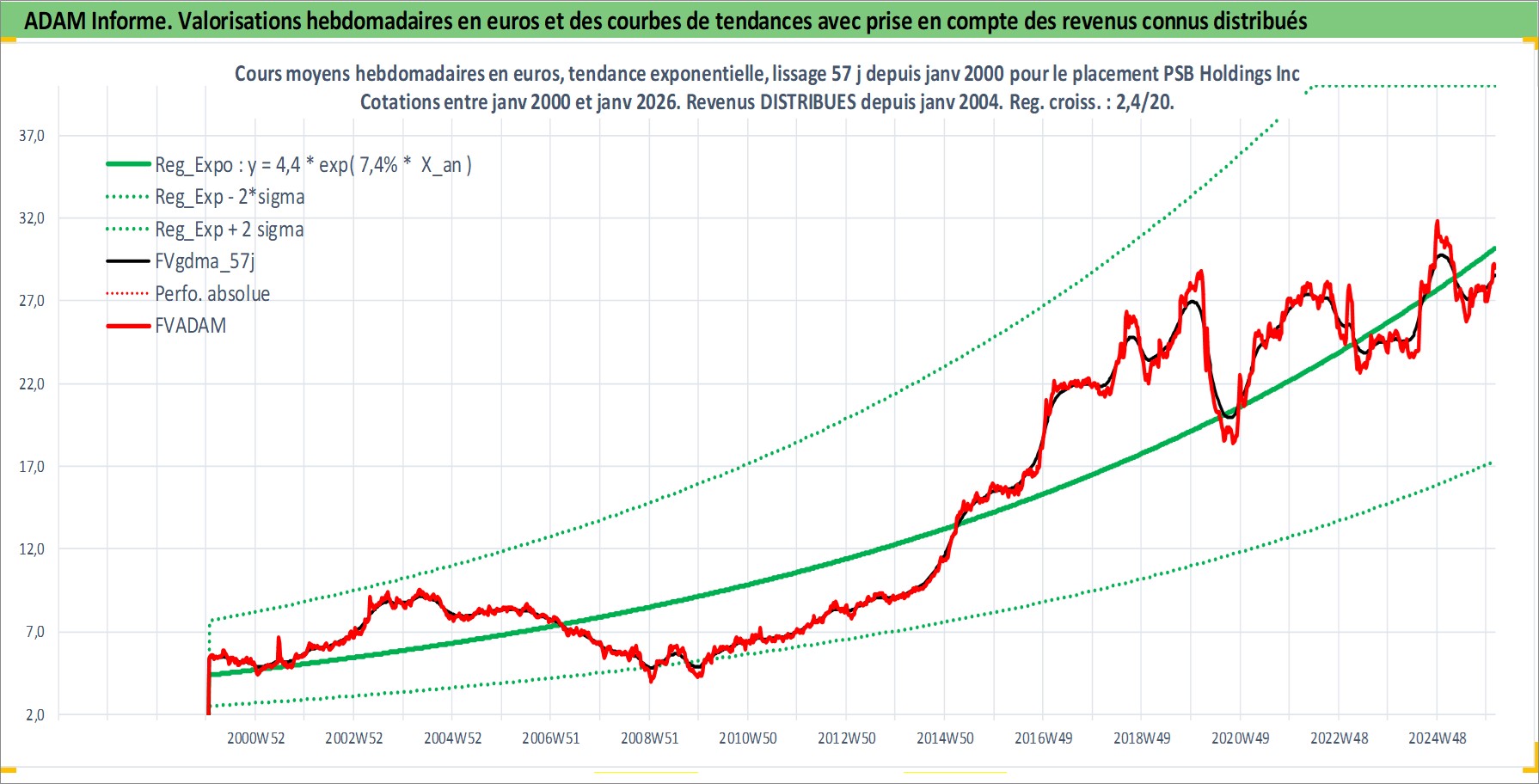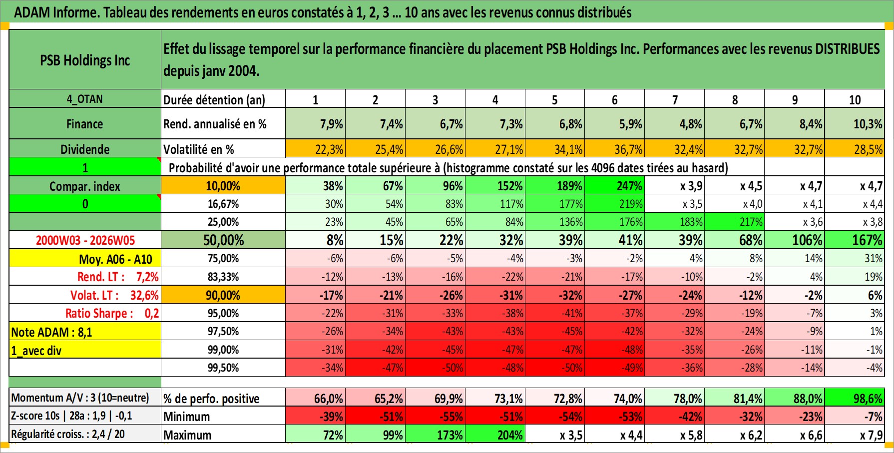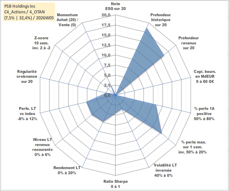 Site dédié aux investisseursPage dédiée sur site financeAnalyse des valorisations hebdomadaires de l'action PSB Holdings Inc. Cet actif est cote en USD. Les valorisations sont en contrevaleur EURO et couvrent les semaines 2000W03 a 2026W05. Les revenus de cet actif financier sont pris en compte depuis la semaine 2004W05. La note ESG de cet actif n'est pas connue.